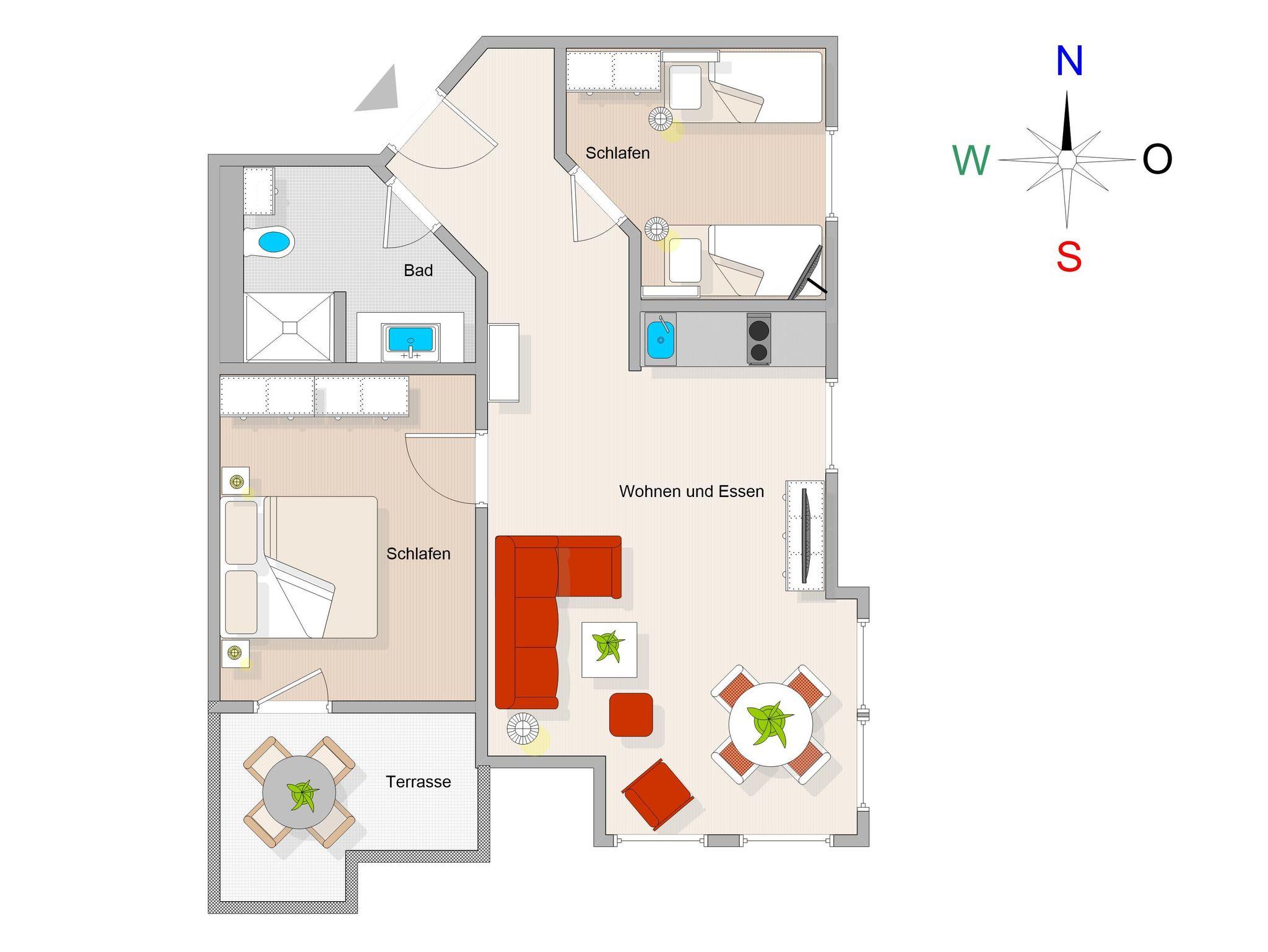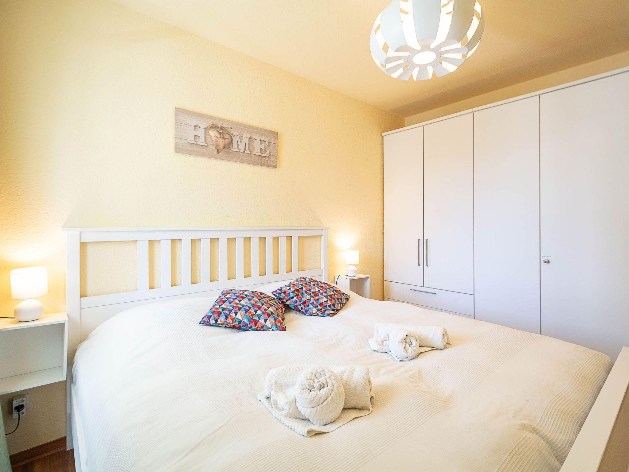 Für erholsame Nächte sorgen zwei komfortable Schlafzimmer. Das Hauptschlafzimmer verfügt über ein großzügiges Doppelbett (180 x 200 cm), einen geräumigen Kleiderschrank und einen Flachbild-TV. Das zweite Schlafzimmer ist mit zwei gemütlichen Boxspring-Einzelbetten (90 x 200 cm), einem Kleiderschrank und ebenfalls einem Flachbild-TV ausgestattet. Plissees an den Fenstern sorgen für Sichtschutz und Privatsphäre.