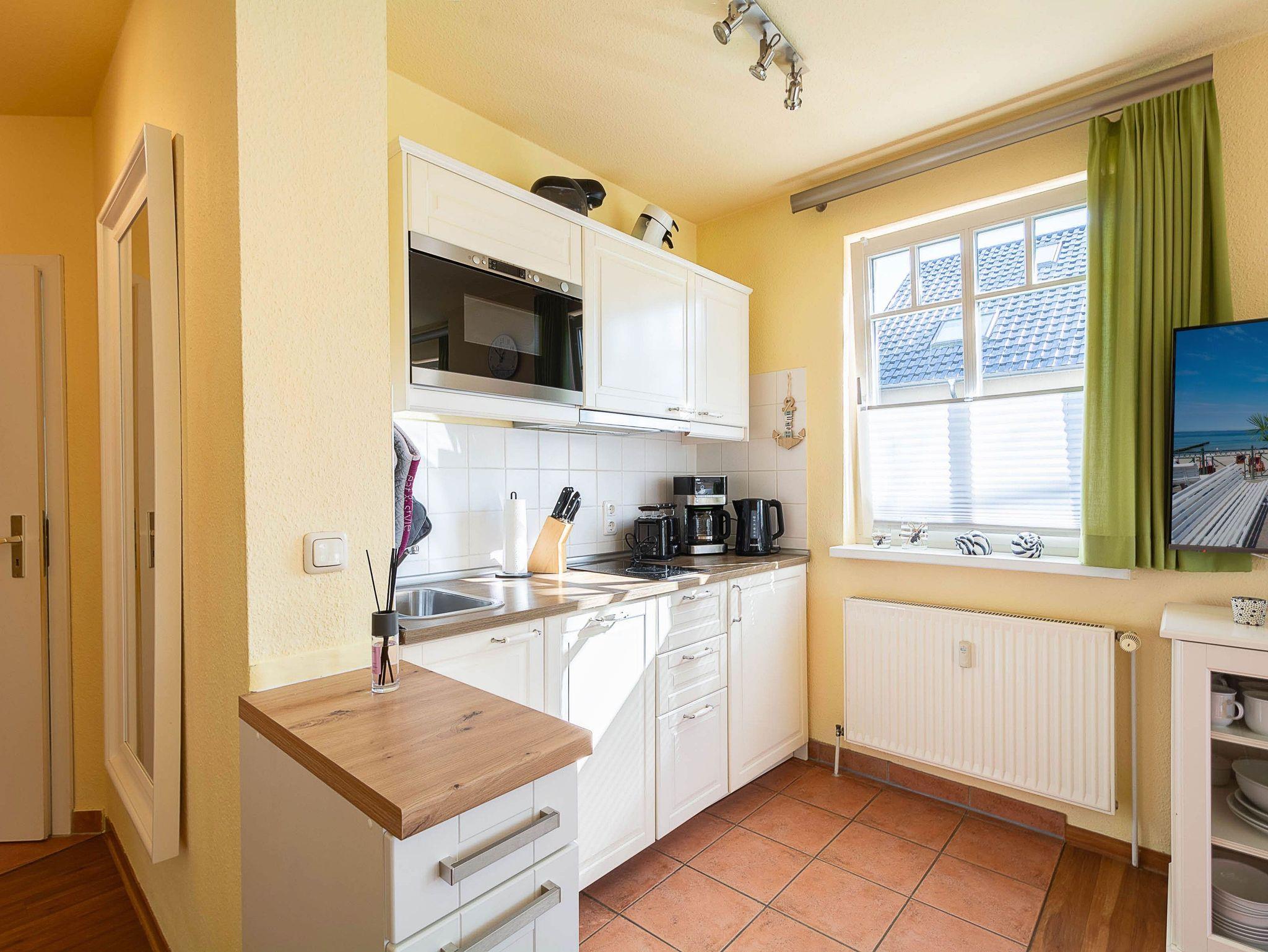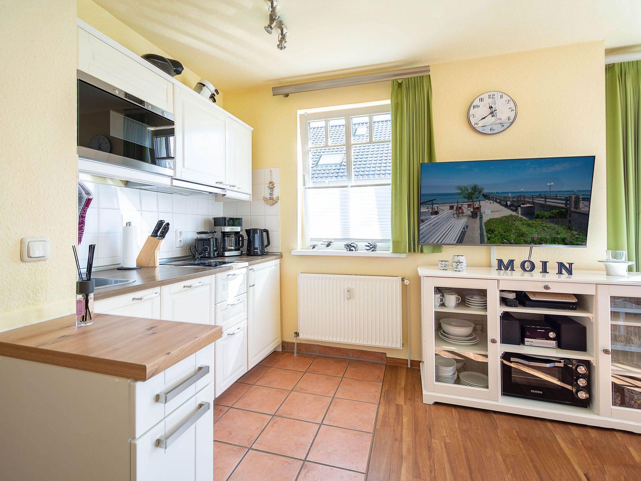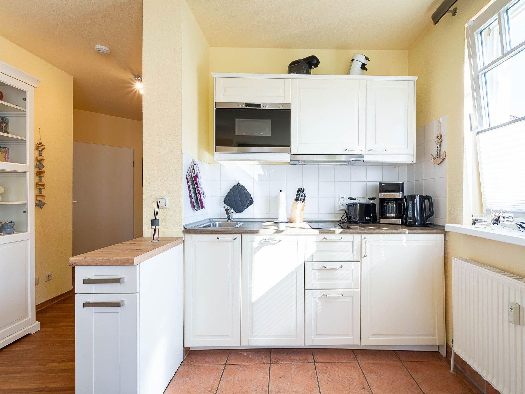 Die offene Küchenzeile ist bestens ausgestattet, damit Sie sich auch im Urlaub rundum wohlfühlen können. Zur Ausstattung gehören ein 2-Platten-Cerankochfeld, ein Mini-Backofen, eine Mikrowelle, ein Geschirrspüler und ein Kühlschrank mit Gefrierfach. Eine Kaffeemaschine, eine Senseo-Kaffeepadmaschine, ein Wasserkocher und ein Toaster stehen ebenfalls bereit.