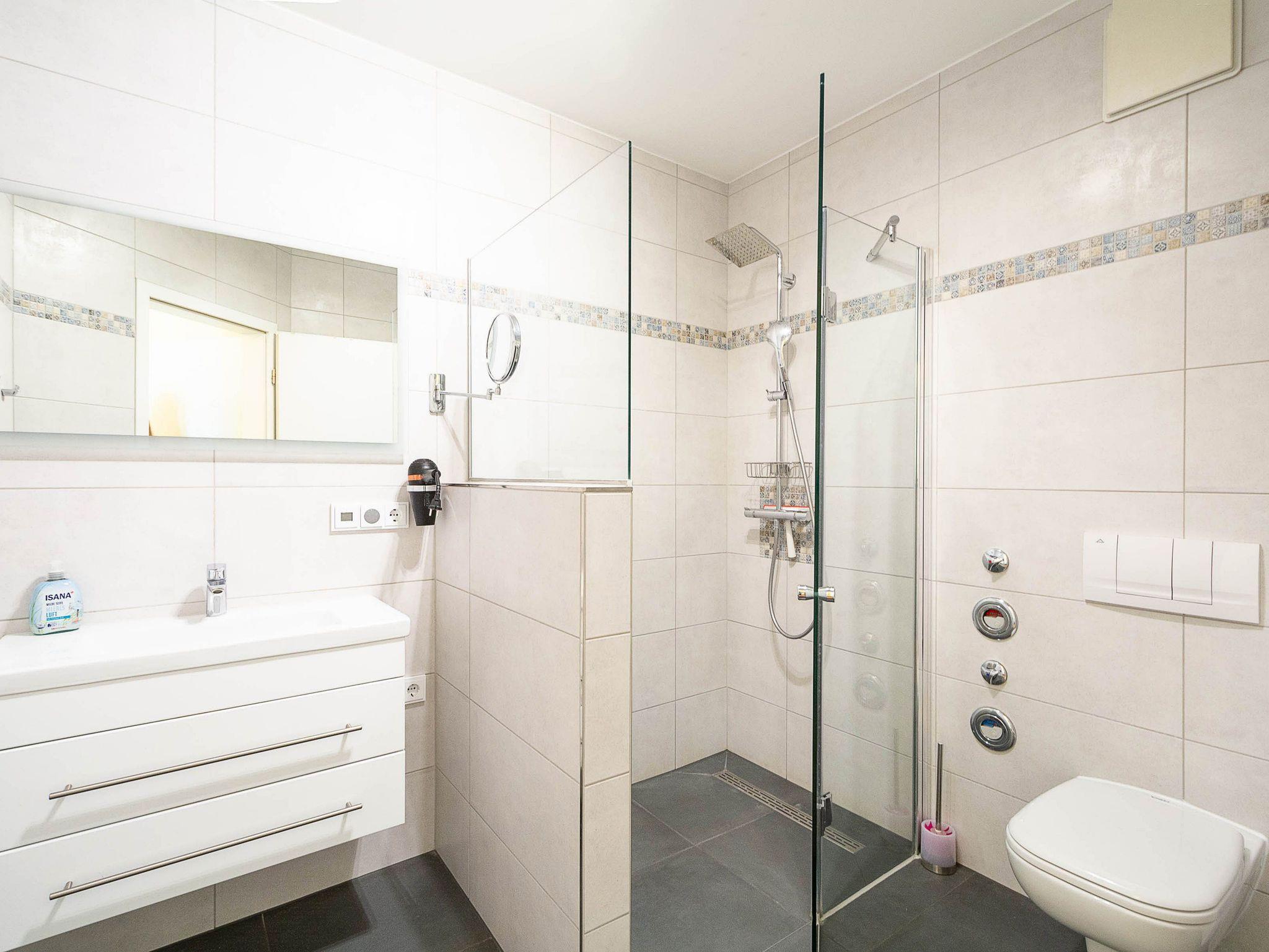 Das stilvolle Badezimmer bietet Ihnen modernen Komfort mit einer bodengleichen Regendusche (120 x 90 cm), einem Waschbecken, einem WC, einem Kosmetikspiegel, einem Haartrockner sowie einem eingebauten Badezimmerradio. Ein Handtuchheizkörper sorgt für angenehme Wärme.