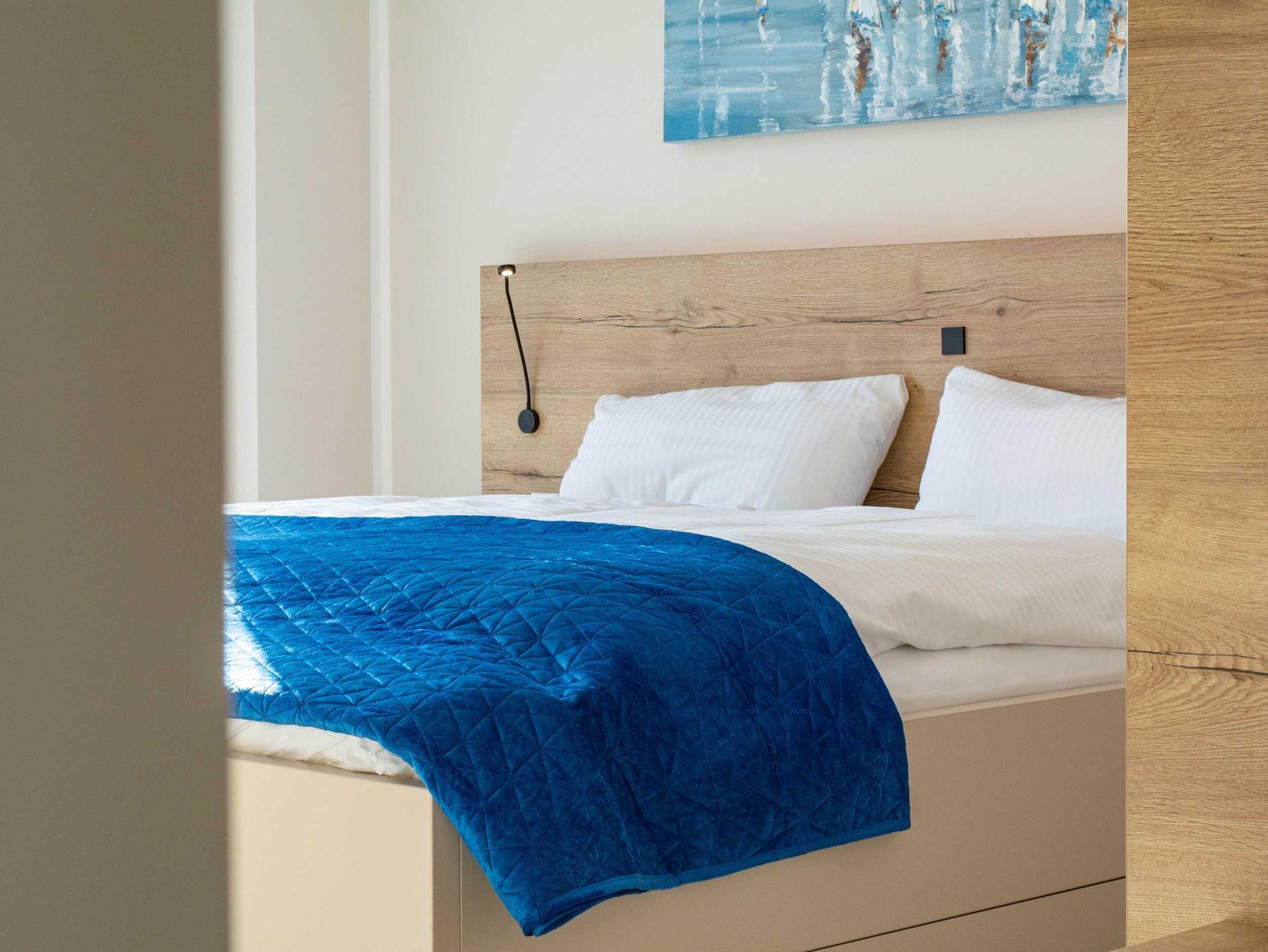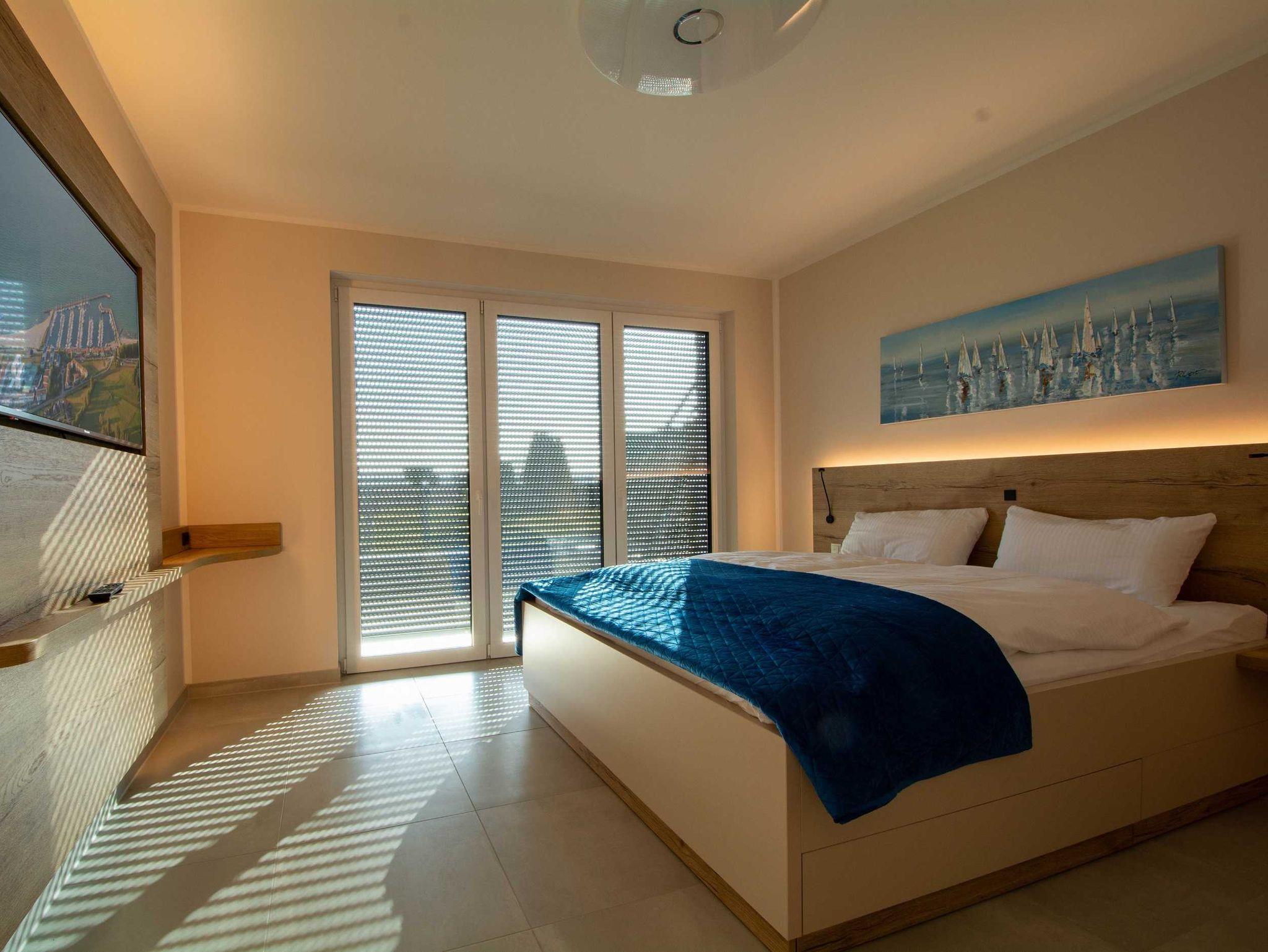Die Schlafzimmer sind mit Doppelbetten, Kleiderschränken sowie Ablageplätzen eingerichtet. Auch hier bieten große Smart-TV (49 Zoll) und eine Ambientebeleuchtung entspannte Stunden. Für eine starke Verdunklung sind Außenrolläden bzw. die Plissees vorgesehen.