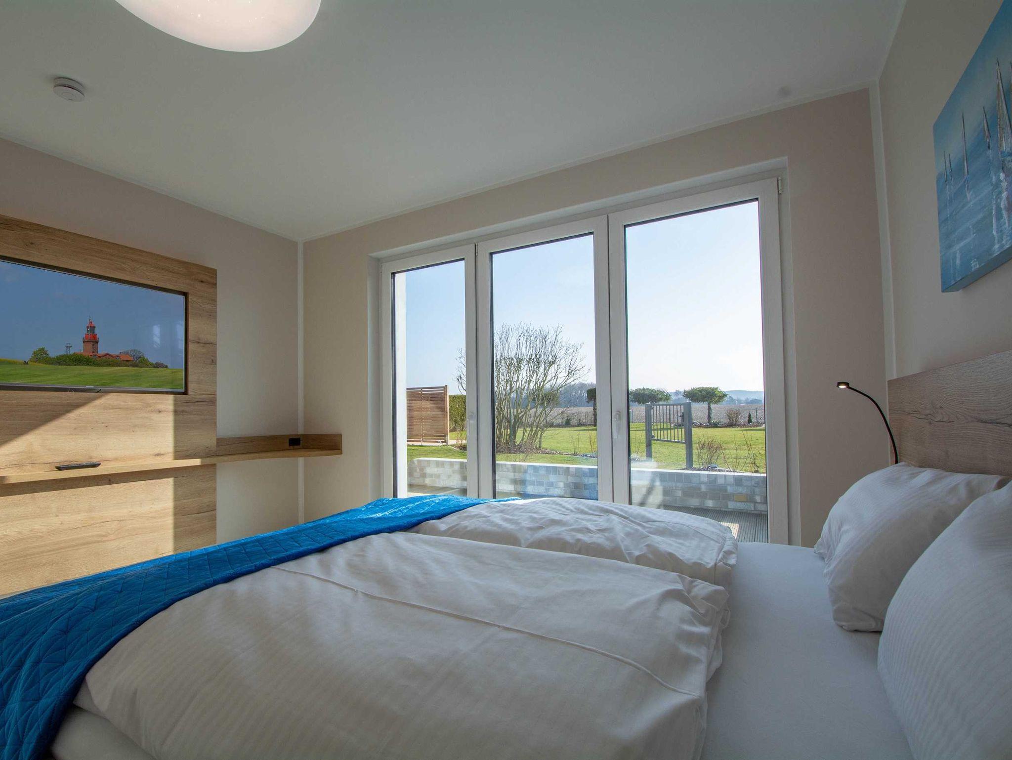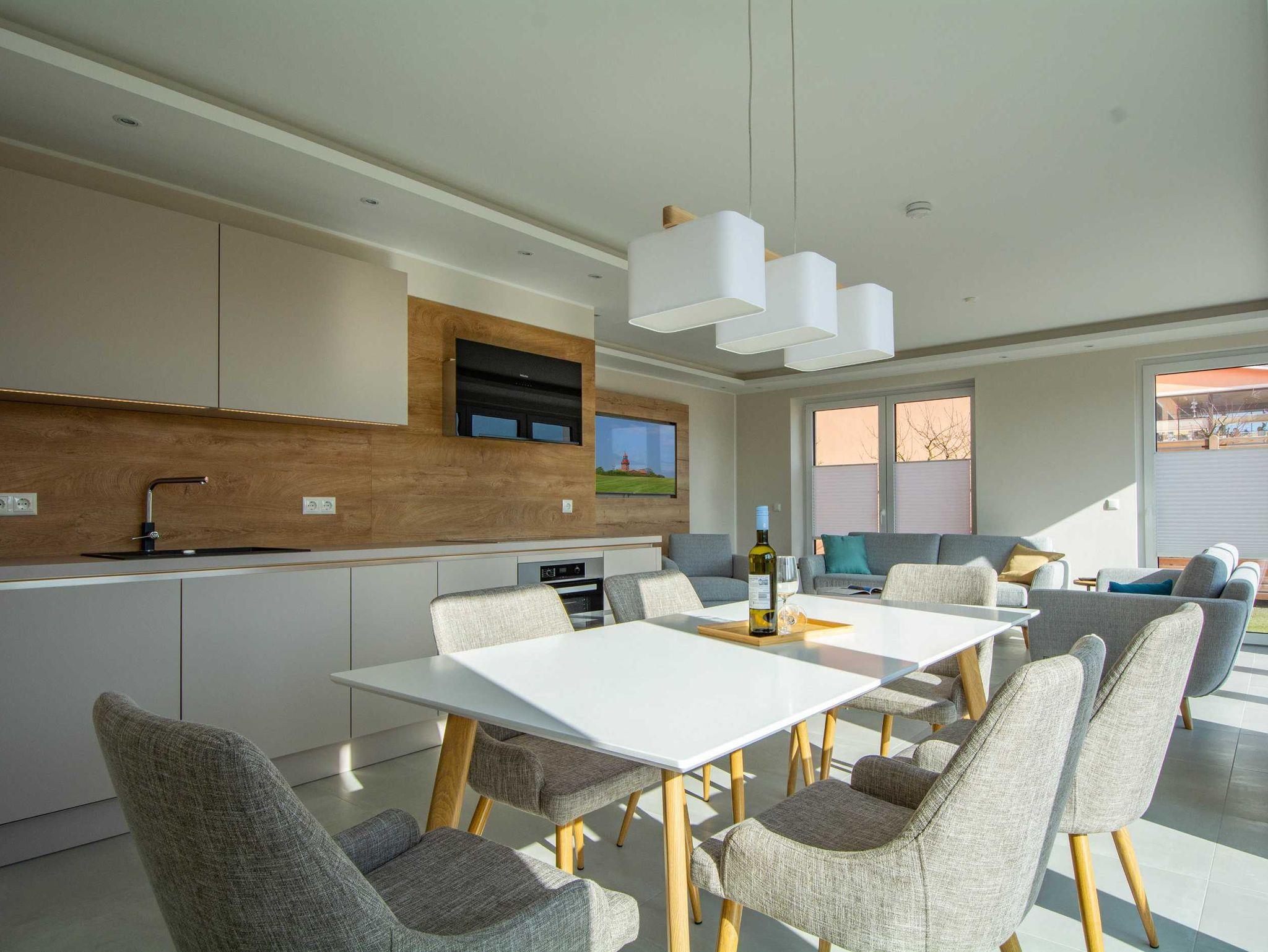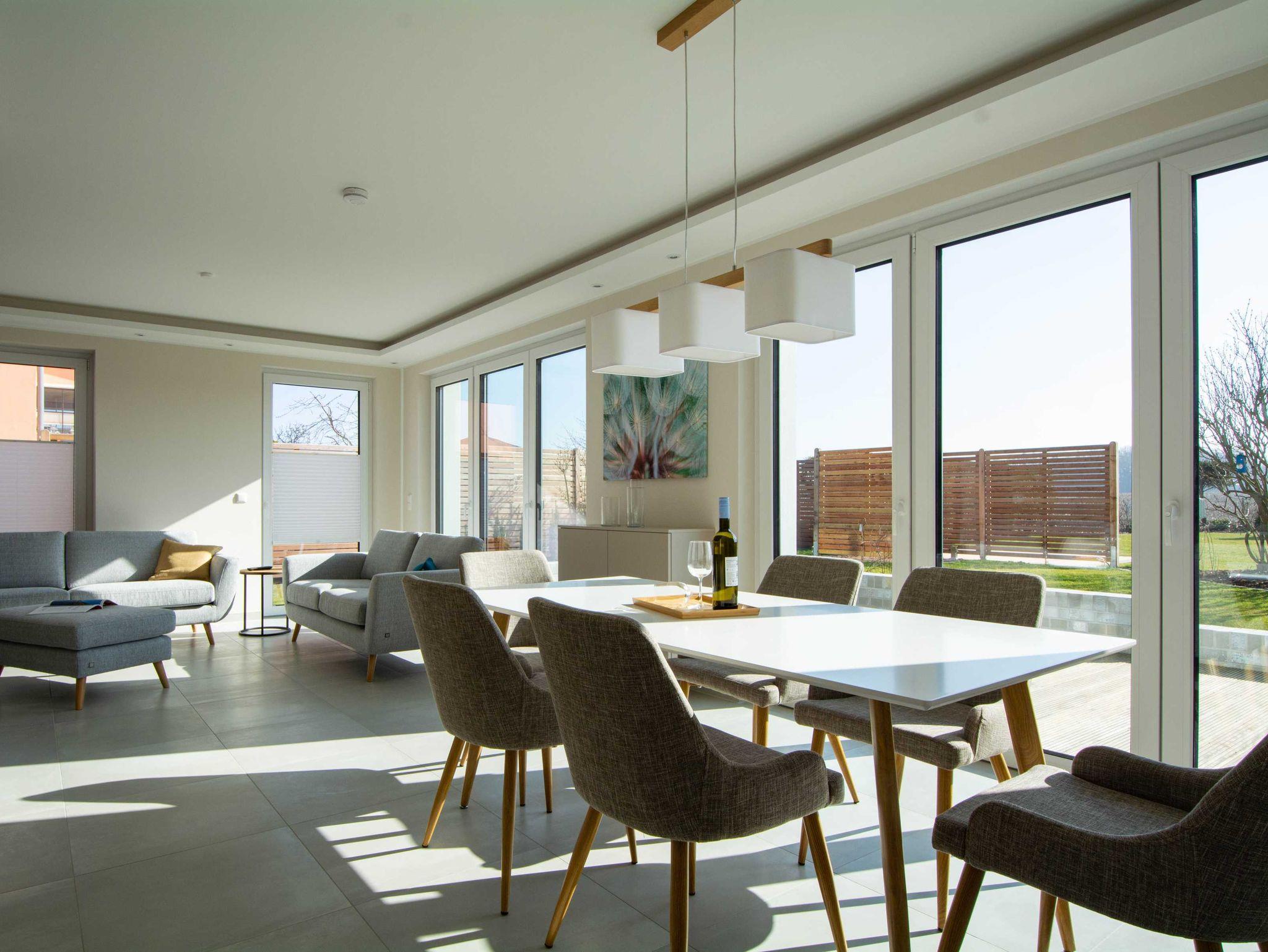 Die großzügige und helle Wohnung wurde 2021 fertigstellt und befindet sich im Erdgeschoss einer modernen Villa mit freiem Blick auf den Bastorfer Leuchtturm. Die Wohnung ist mit Fußbodenheizung in allen Räumen und einem Bussystem zur Steuerung der Haustechnik und Beleuchtung ausgestattet. In den drei Doppel-Schlafzimmern gibt es ebenfalls viel Raum zum Wohlfühlen: großzügige und bequeme Betten, große Kleiderschränke und großzügige Ablageflächen. Mahlzeiten lassen sich in der modernen und durchdachten Küchenzeile im kombinierten Wohn- und Essbereich zubereiten und am hellen Essplatz mit bodentiefen Fenstern und Zugang zur Terrasse genießen. Außerdem lockt die Terrasse mit Frischluft und Ausblick auf den Bastorfer Leuchtturm. Mit 3 Schlafzimmern und 2 Bädern ist die Wohnung für bis zu 6 Erwachsene ein perfekter Erholungsort an der Ostsee und passt mit der modernen und luftigen Einrichtung optimal zur modernen Architektur.
