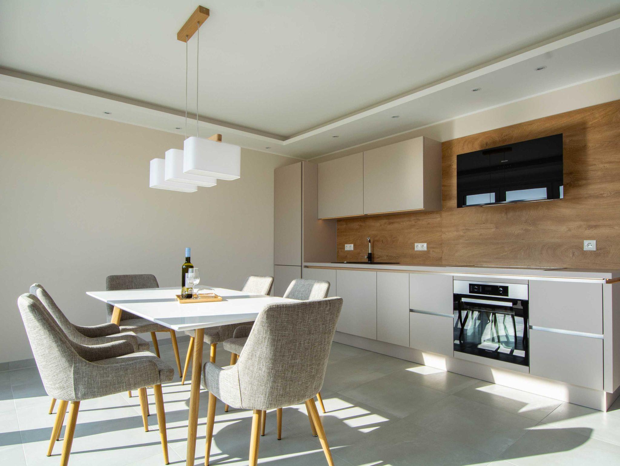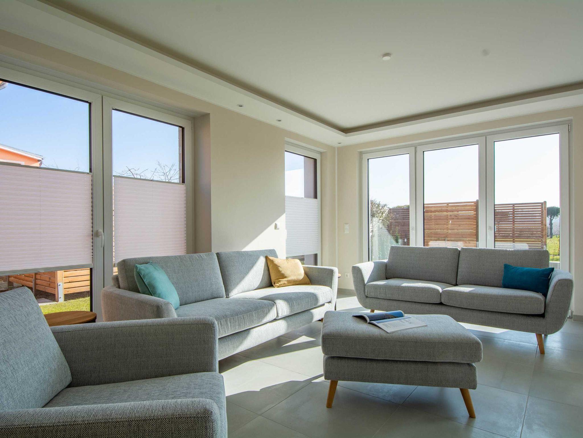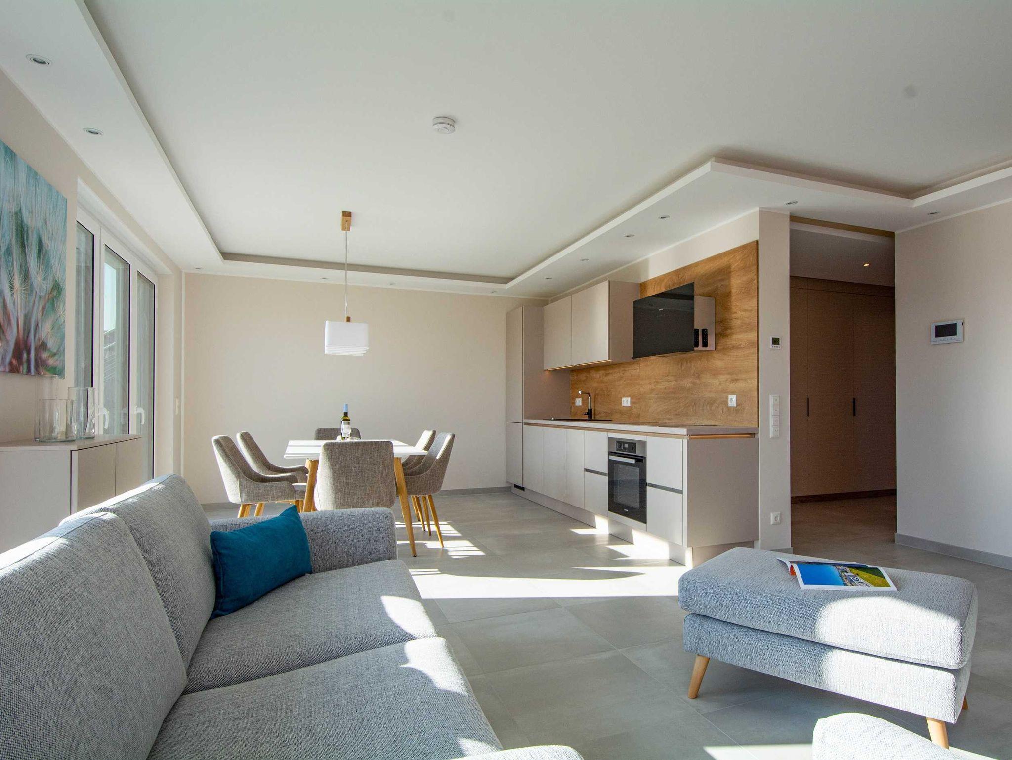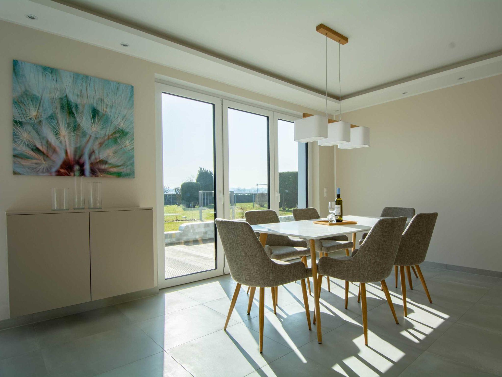 Die großzügige und helle Wohnung wurde 2021 fertigstellt und befindet sich im Erdgeschoss einer modernen Villa mit freiem Blick auf den Bastorfer Leuchtturm. Die Wohnung ist mit Fußbodenheizung in allen Räumen und einem Bussystem zur Steuerung der Haustechnik und Beleuchtung ausgestattet. In den drei Doppel-Schlafzimmern gibt es ebenfalls viel Raum zum Wohlfühlen: großzügige und bequeme Betten, große Kleiderschränke und großzügige Ablageflächen. Mahlzeiten lassen sich in der modernen und durchdachten Küchenzeile im kombinierten Wohn- und Essbereich zubereiten und am hellen Essplatz mit bodentiefen Fenstern und Zugang zur Terrasse genießen. Außerdem lockt die Terrasse mit Frischluft und Ausblick auf den Bastorfer Leuchtturm. Mit 3 Schlafzimmern und 2 Bädern ist die Wohnung für bis zu 6 Erwachsene ein perfekter Erholungsort an der Ostsee und passt mit der modernen und luftigen Einrichtung optimal zur modernen Architektur.
