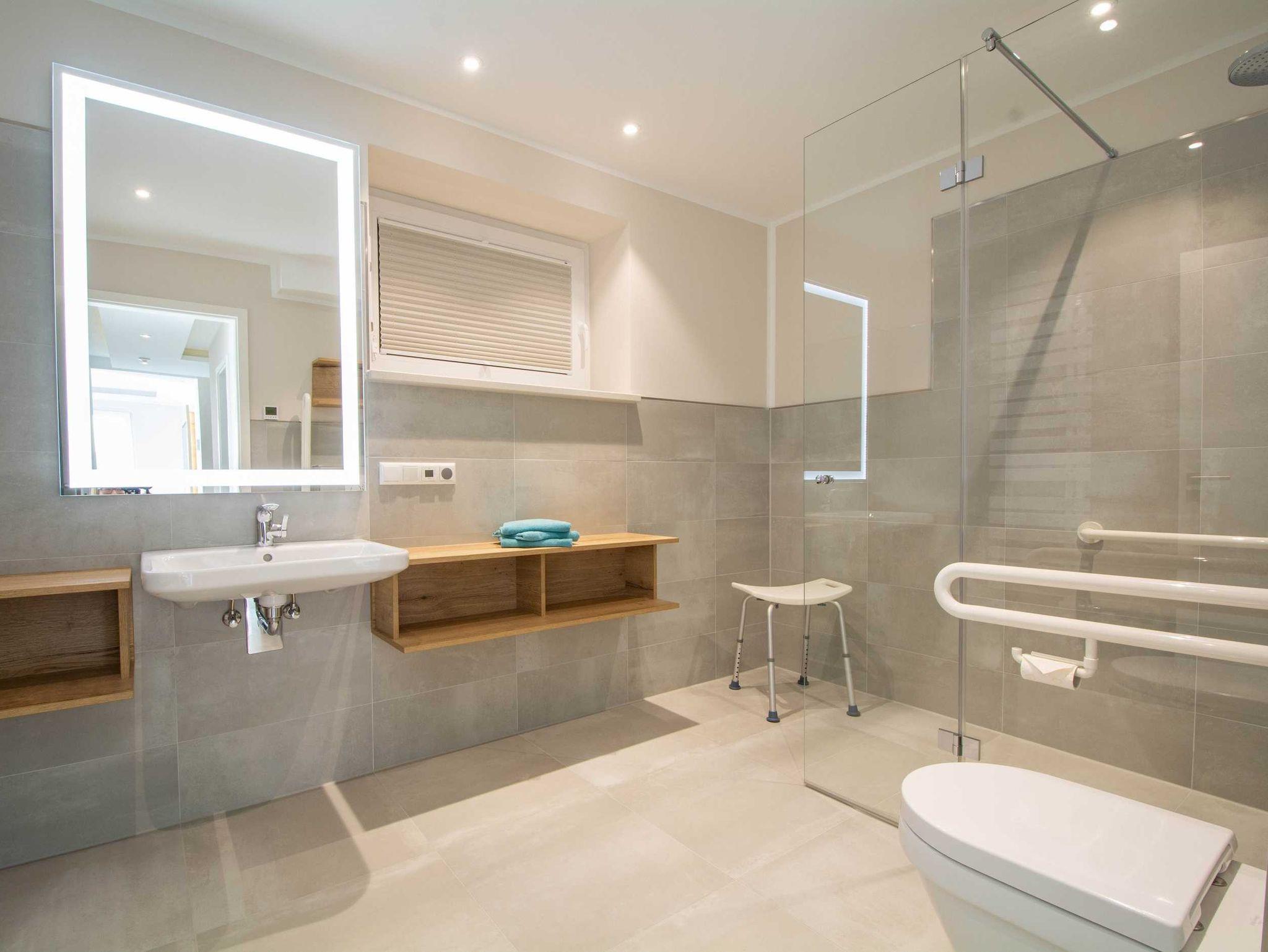 Die Wohnung verfügt über zwei Duschbäder. Das erste Duschbad ist barrierearm mit bodengleicher Regenwalddusche und Haltegriffen in Dusche und an der Toilette sowie einem unterfahrbaren Waschbecken konzipiert. Das zweite Duschbad ist ein Tageslichtbad mit flacher Duschwanne, Regenwalddusche und Handtuchheizung sowie einem in die Wand integriertem Digital-Radio.