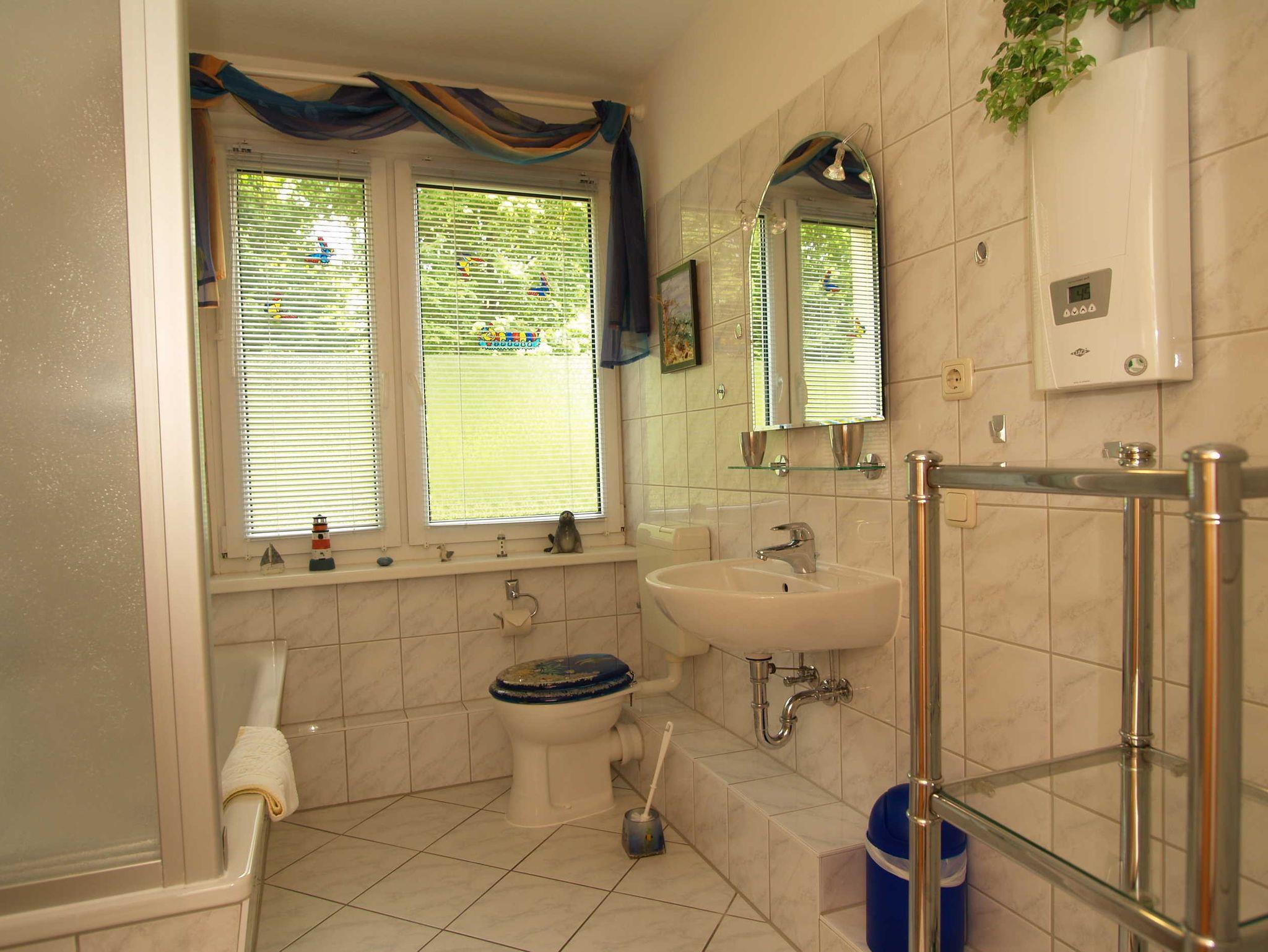 Das geflieste Tageslichtbad mit einer Duschwanne, Waschbecken und WC und vervollständigt das Gesamtbild dieser Ferienwohnung.