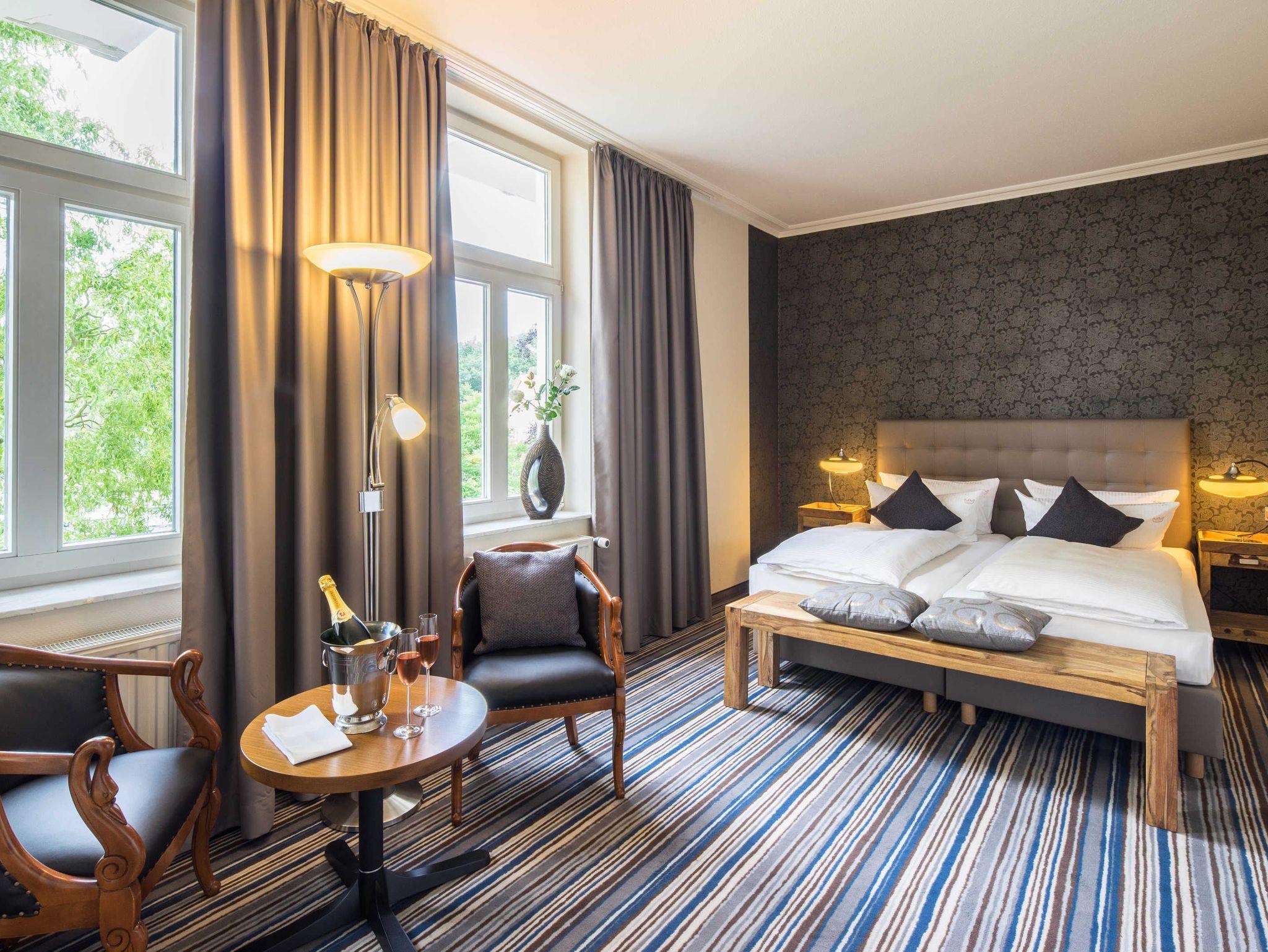 Doppelzimmer teilweise mit Balkon. Bad mit Dusche oder Wanne und überwiegend getrenntem WC. Die Zimmer sind hell und individuell ausgestattet. Das bequeme Boxspringbett ist 180 cm breit. Die Zimmer haben eine Minibar und einen Safe ( Kaution ). Ein Bademantel befindet sich bei Anreise auf Ihrem Zimmer. Teilweise ohne Aufzug.