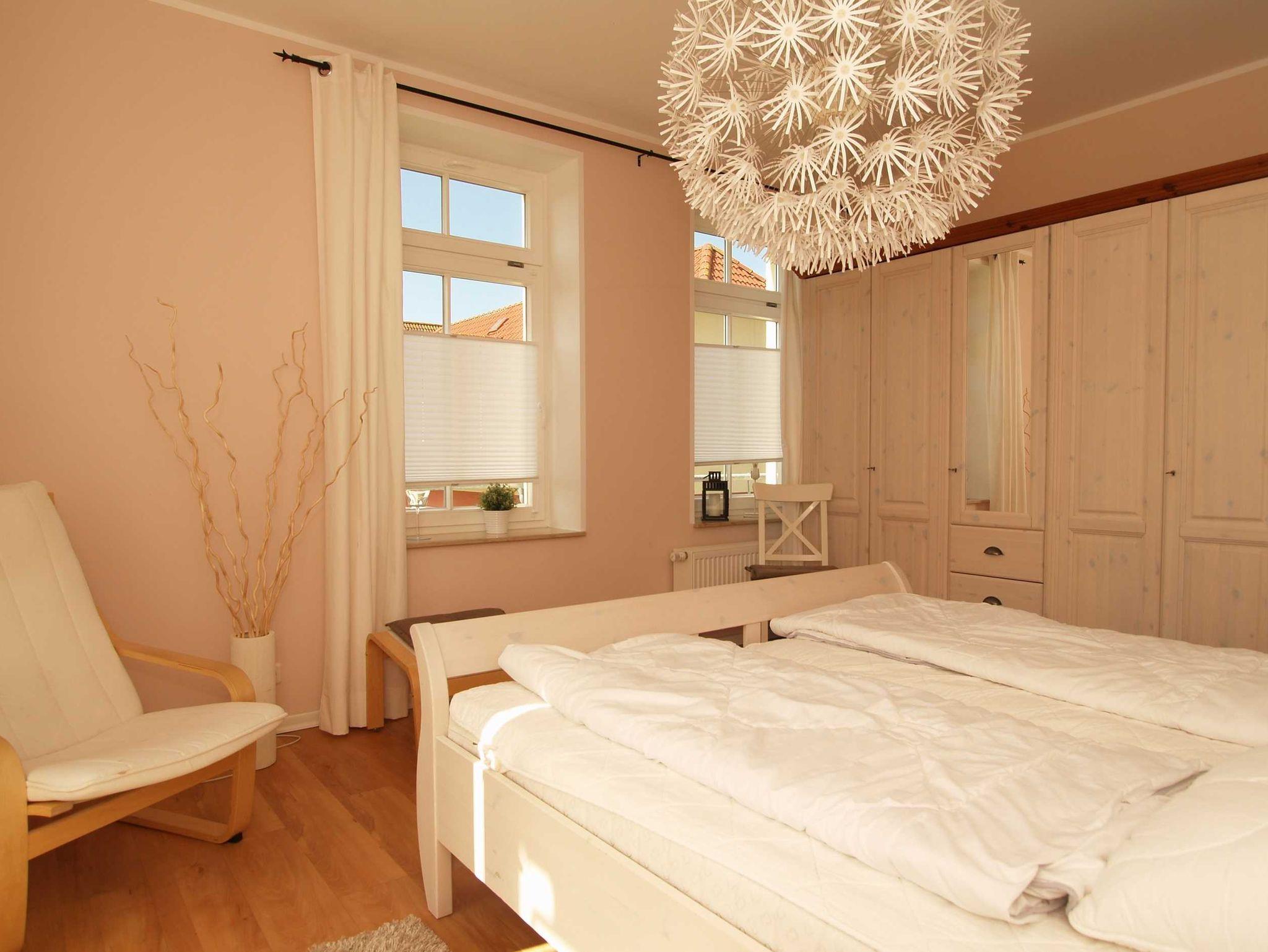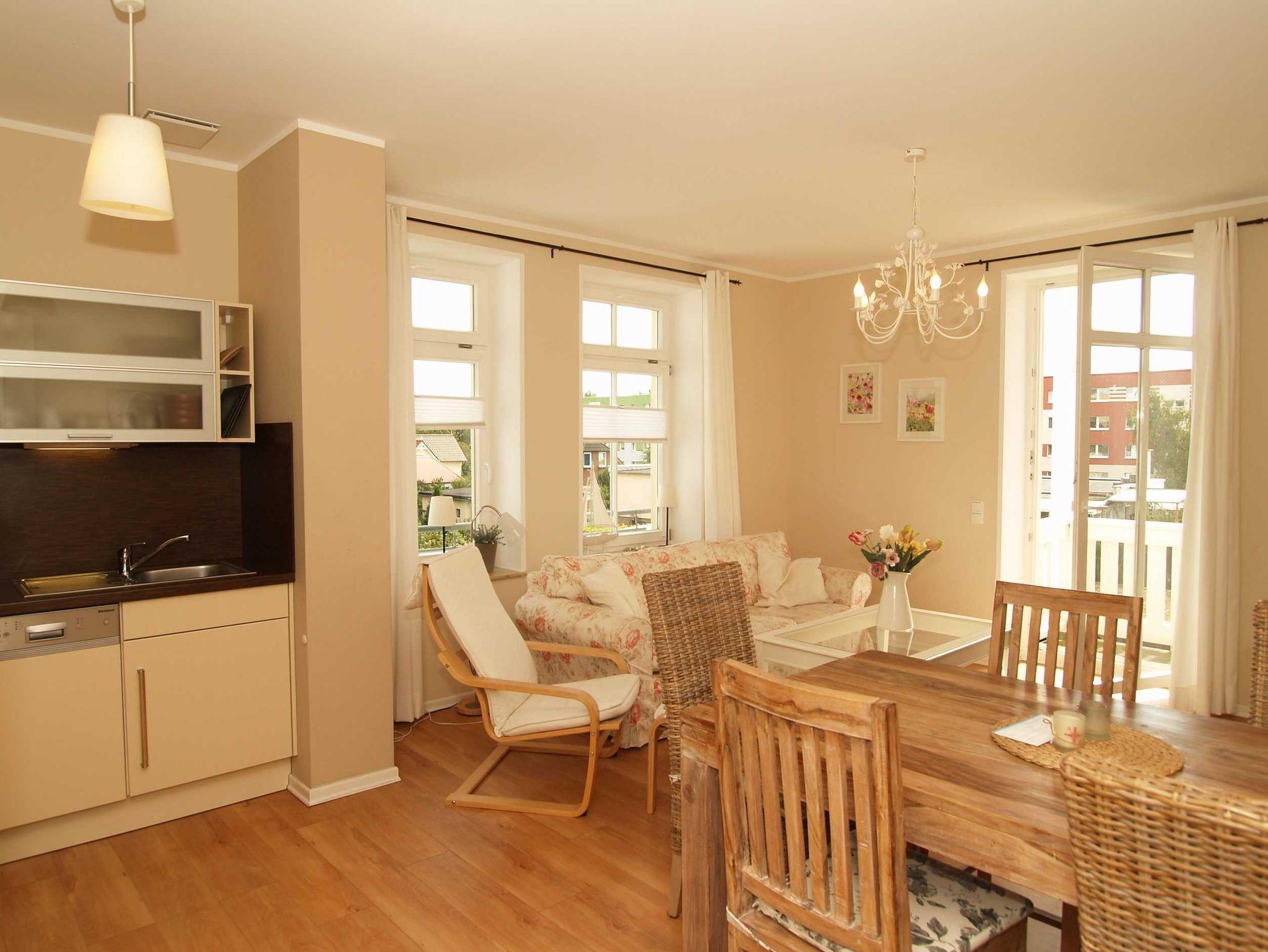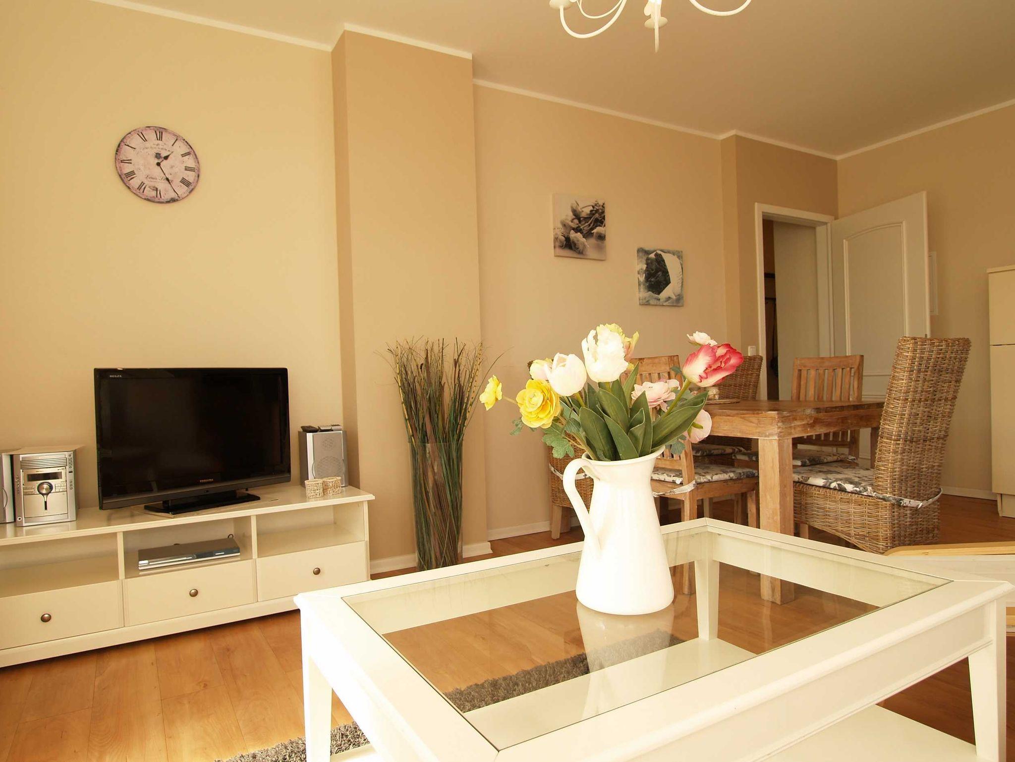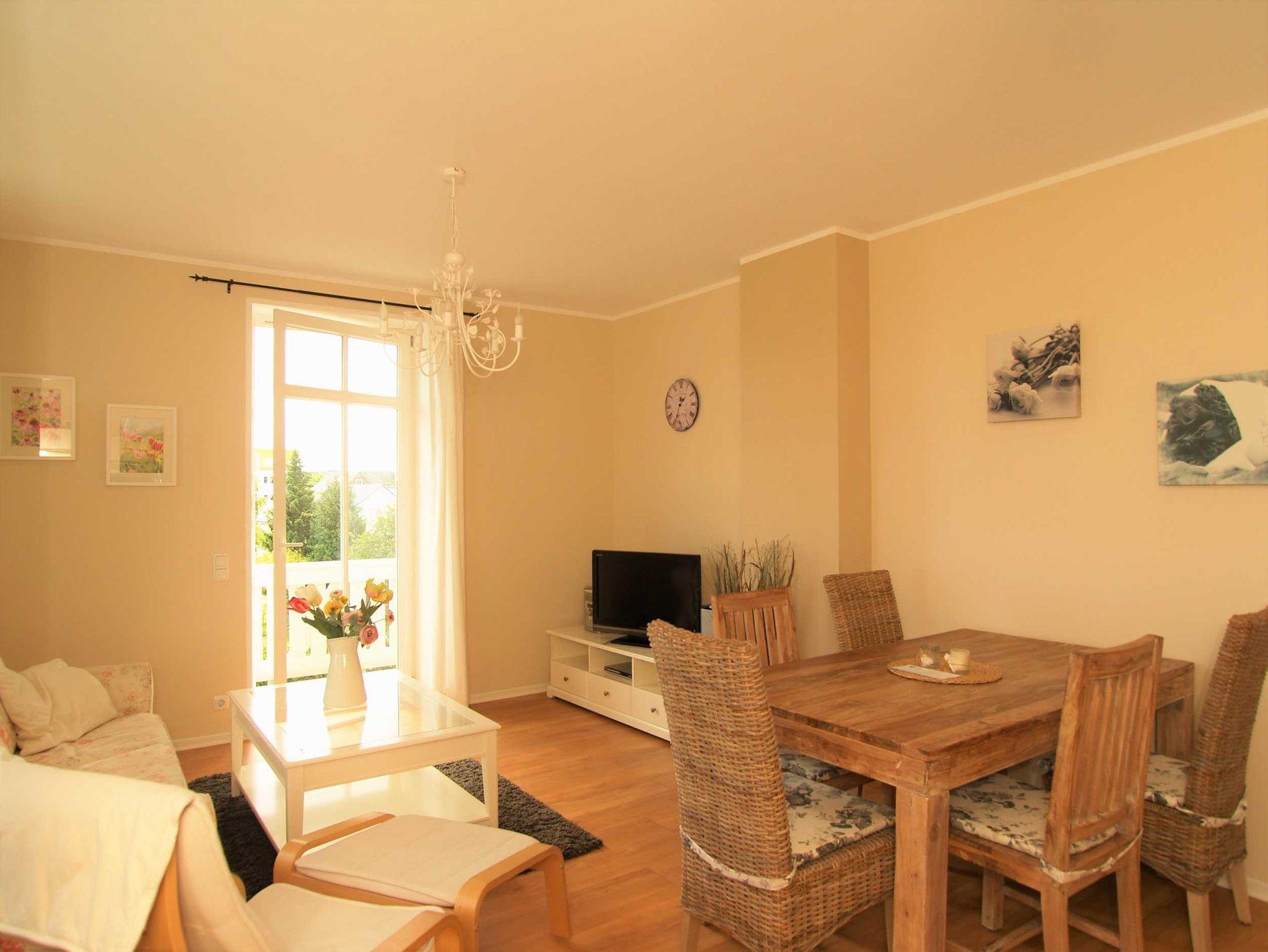 Sie wohnen in einer ca. 75 m² großen 3-Raum-Ferienwohnung, die sich im 2. Obergeschoss der Villa Josephine befindet. Der liebevoll eingerichtete helle Wohnraum ist ausgestattet mit einer gemütlichen Couchgarnitur, einem großzügigen Essplatz sowie einem 42-Zoll-Flachbild-TV.
