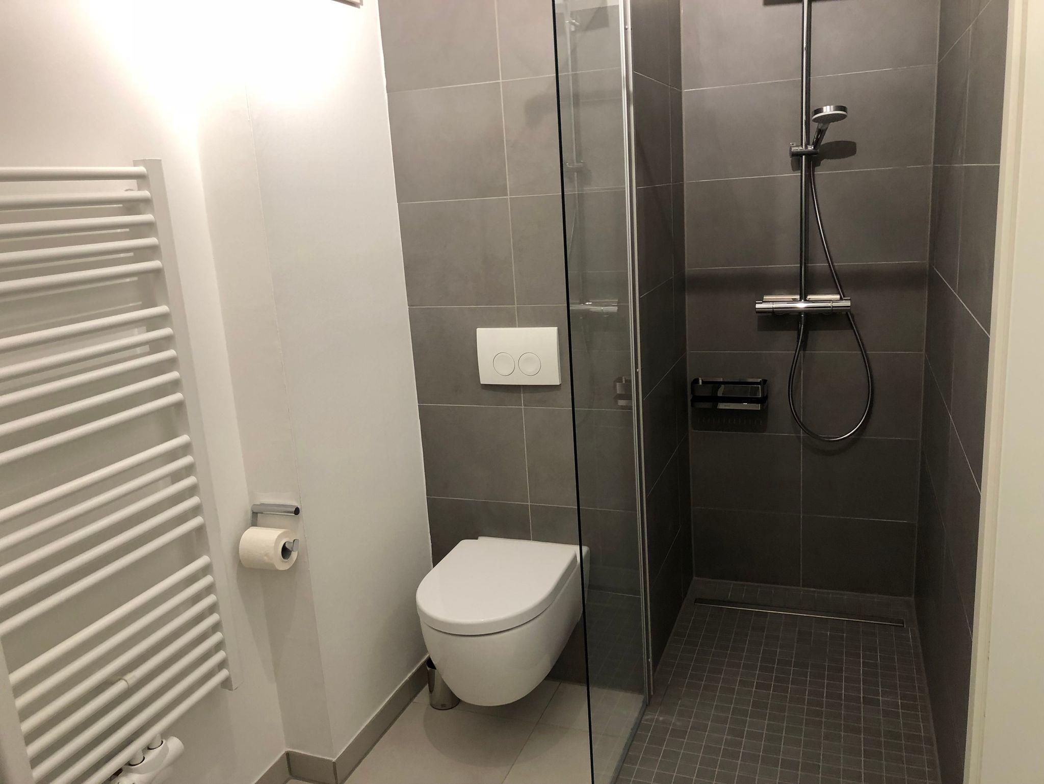 Das moderne Bad mit ebenerdiger Dusche, WC und Handtuchheizkörper vervollständigt das Gesamtbild dieser geschmackvollen und hochwertigen Wohnung.