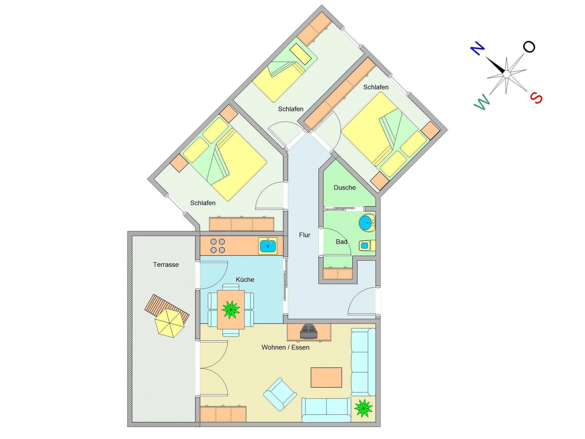 Die liebevoll eingerichtete Ferienwohnung verfügt über 3 Schlafzimmer. Das erste Schlafzimmer ist ausgestattet mit einem Doppelbett (180 cm x 200 cm) und einem großzügigen Kleiderschrank für Ihre Urlaubsgarderobe. Das zweite Schlafzimmer ist ebenfalls mit einem Kleiderschrank eingerichtet sowie mit zwei Einzelbetten (je 90 cm x 200 cm). Im dritten Schlafzimmer befinden sich ein Einzelbett (90cm x 200 cm) und ein kleiner Kleiderschrank. Als Sichtschutz bzw. zum Abdunkeln befinden sich Jalousien in den Schlafzimmern.