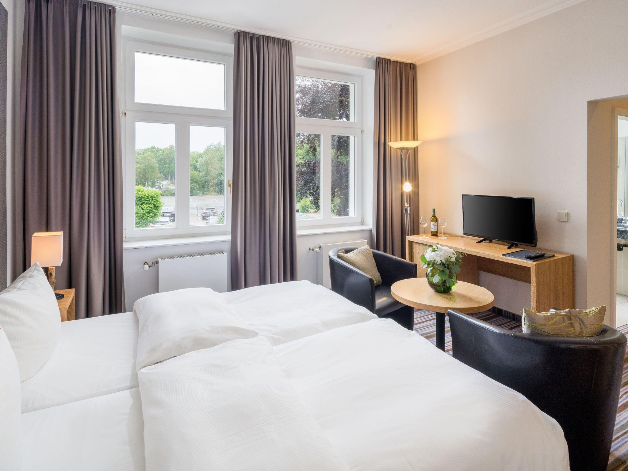 Juniorsuite, Doppelzimmer mit separatem Sitzbereich ca. 30 qm groß, inkl. Schlemmerfrühstück und Reinigung. Teilweise Balkon. Im Stammhaus mit Treppe.