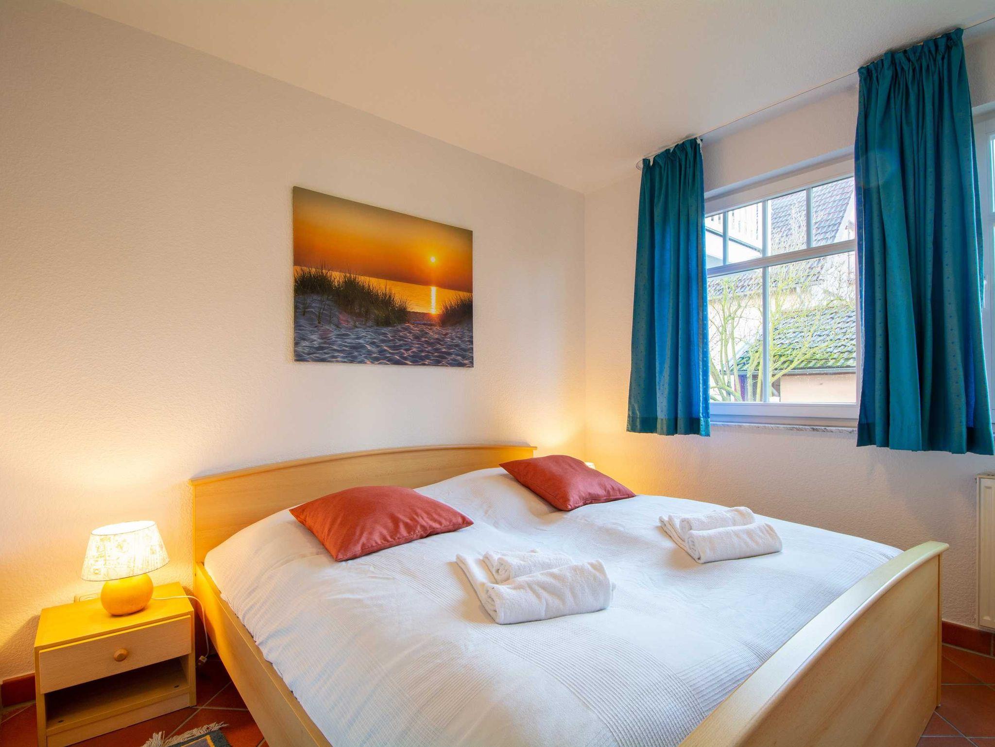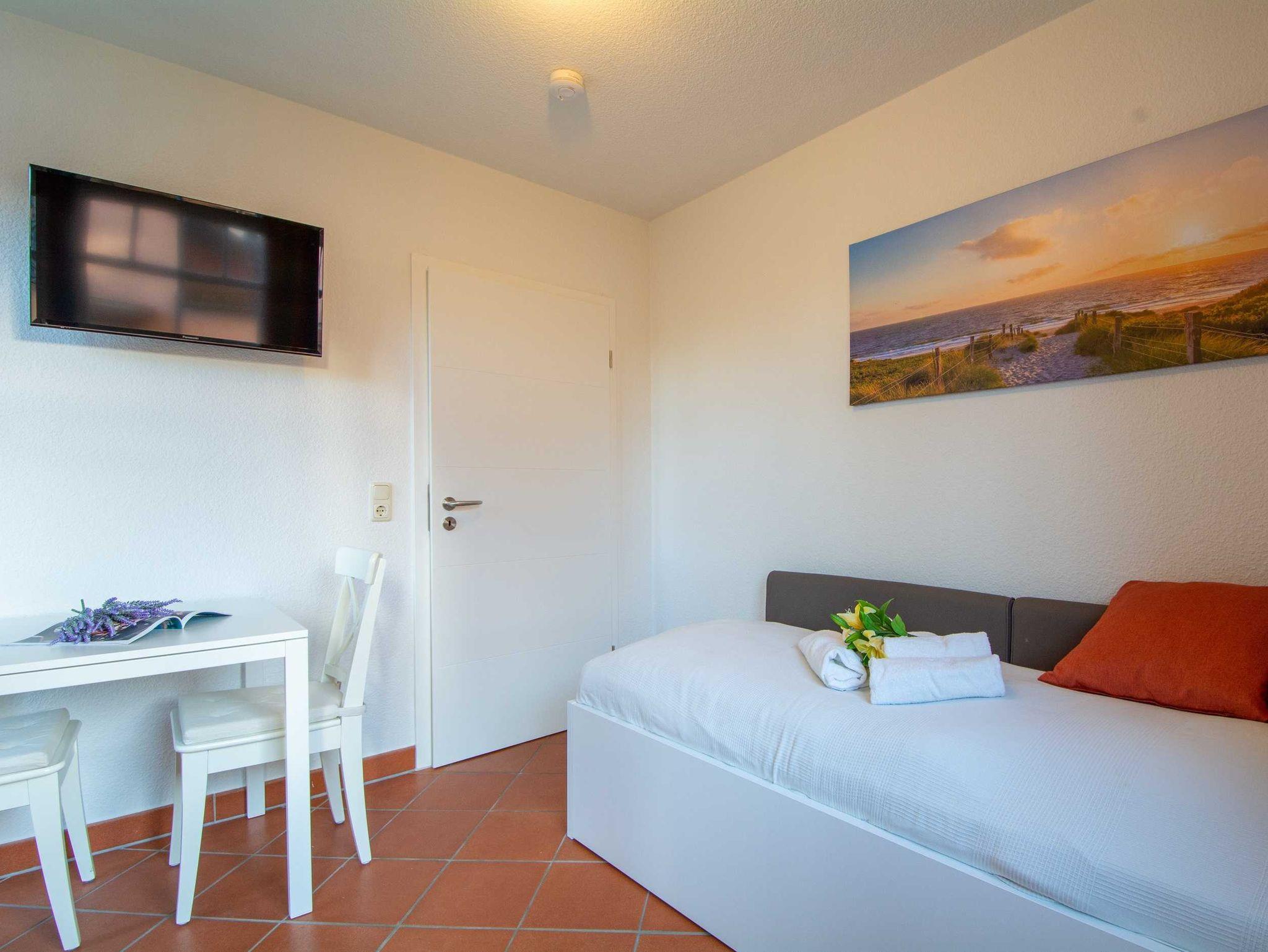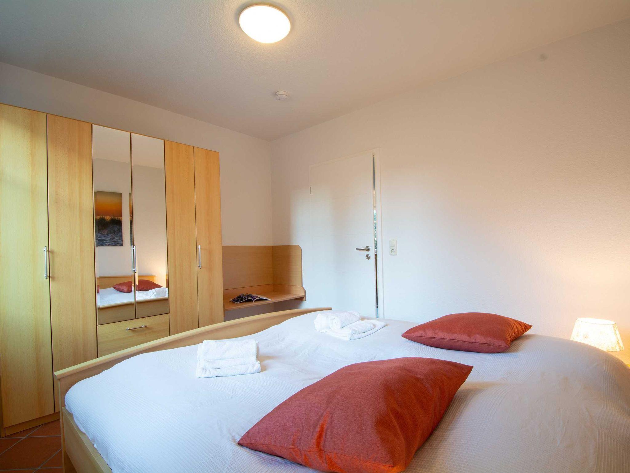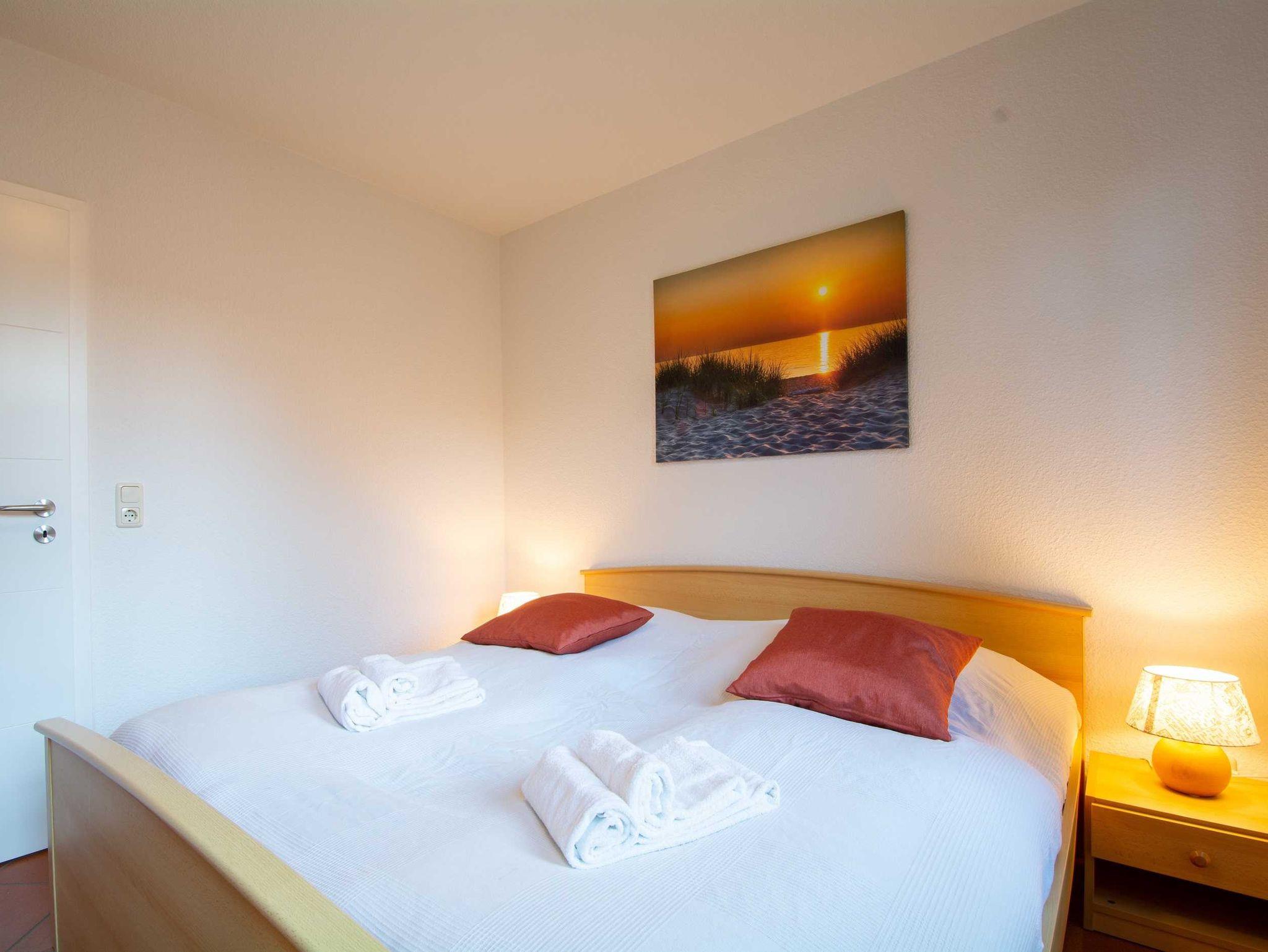 Die Wohnung verfügt über zwei Schlafzimmer: Das große Schlafzimmer ist ausgestattet mit einem Doppelbett (2 x 90cm x 200cm), einem großen Kleiderschrank sowie einer Ablage für Ihre Reisetasche. Das kleine Schlafzimmer ist nach Westen ausgerichtet und hat einen eigenen kleinen Balkon (möbliert mit 1 Tisch und 2 Stühlen). Es verfügt über eine Raumsparliege, welche sich zu einem Doppelbett ausziehen lässt (Größe 90x200cm; 80X190cm) sowie einem kleinen Tisch mit 2 Stühlen, einem Kleiderschrank und einem 32-Zoll-Flachbild-TV. Das großzügige Tageslichtbad ist komplett gefliest, ist ausgestattet mit Dusche und WC sowie einem Handfön und Handtuchheizkörper.