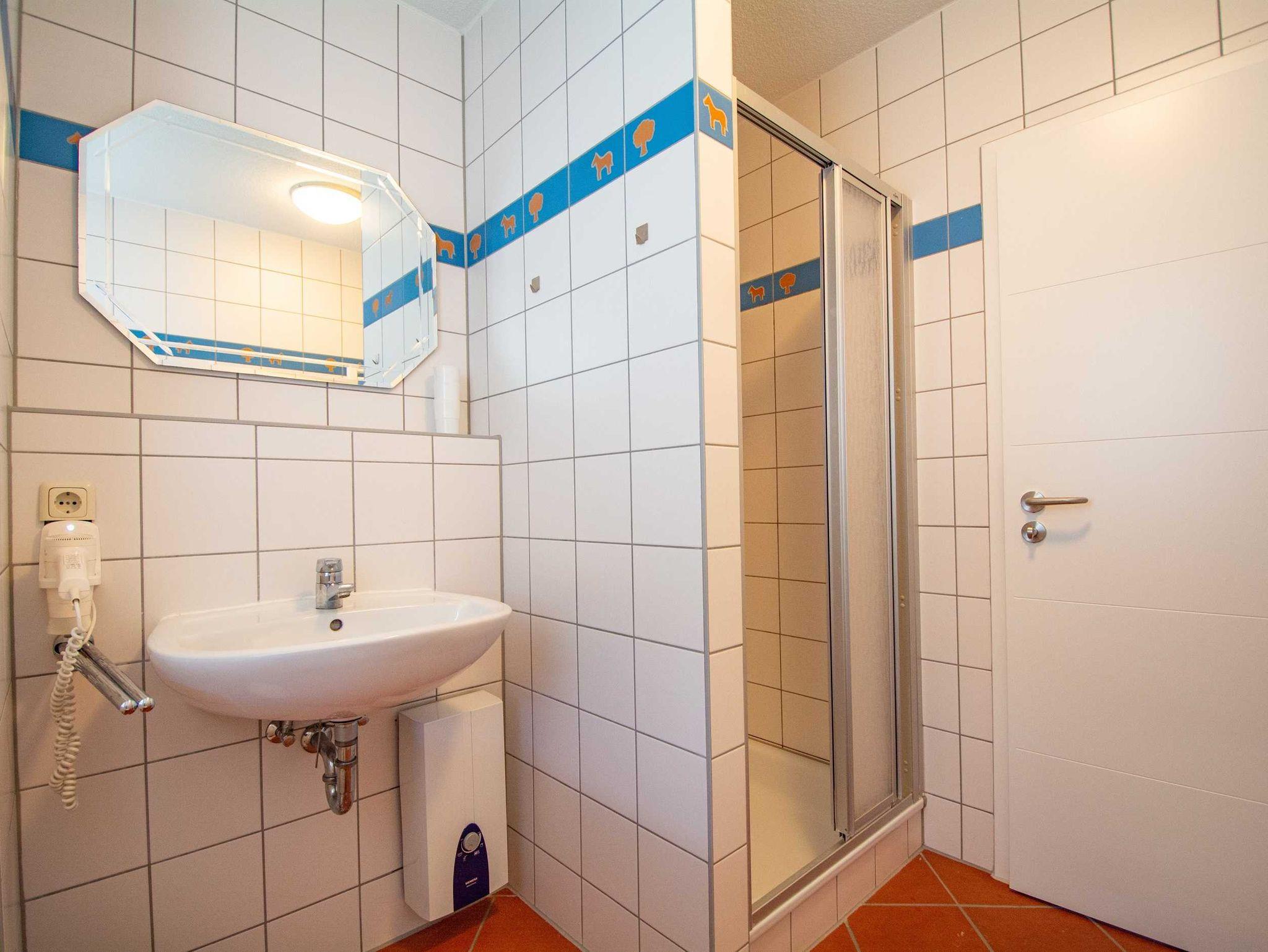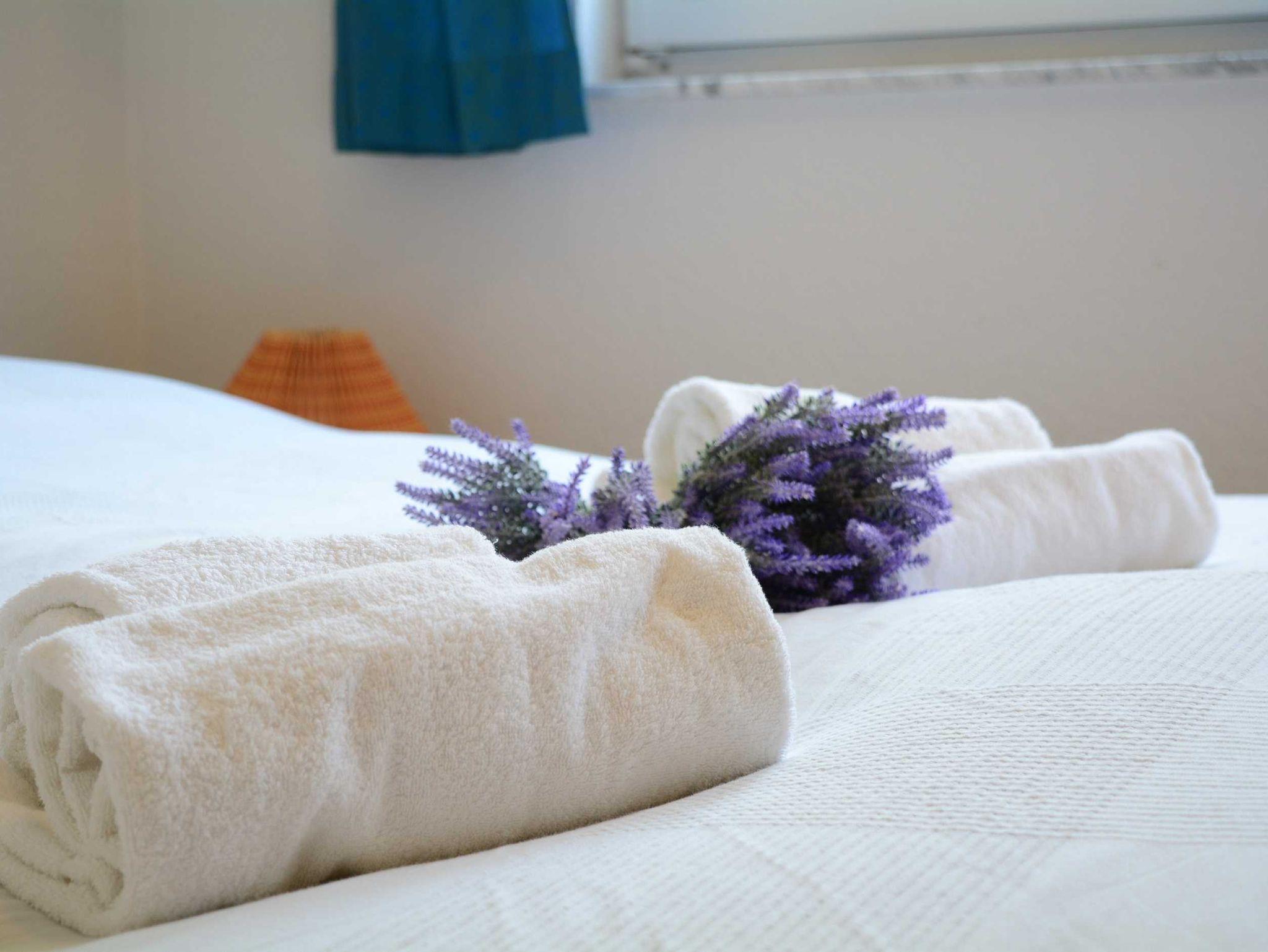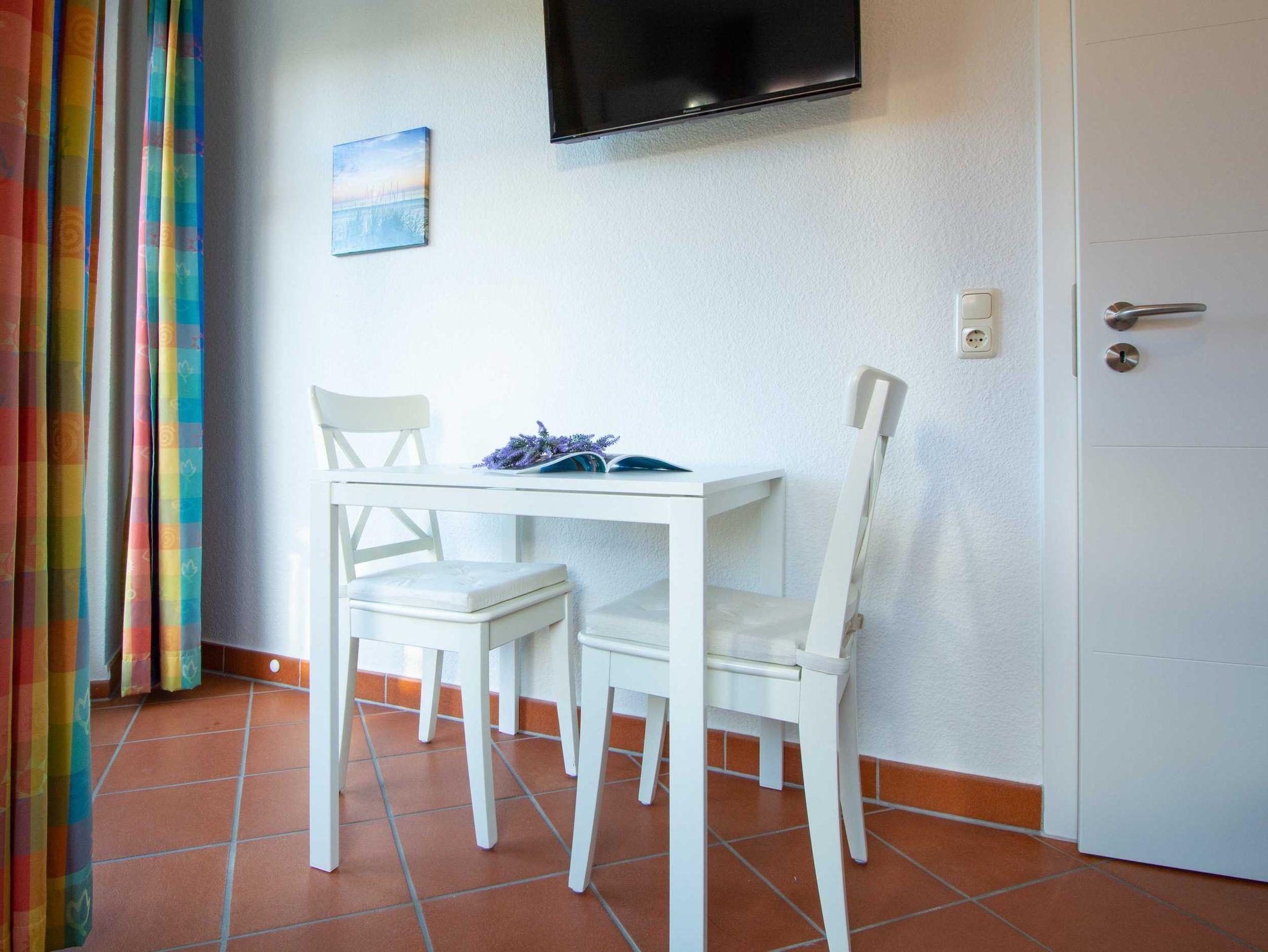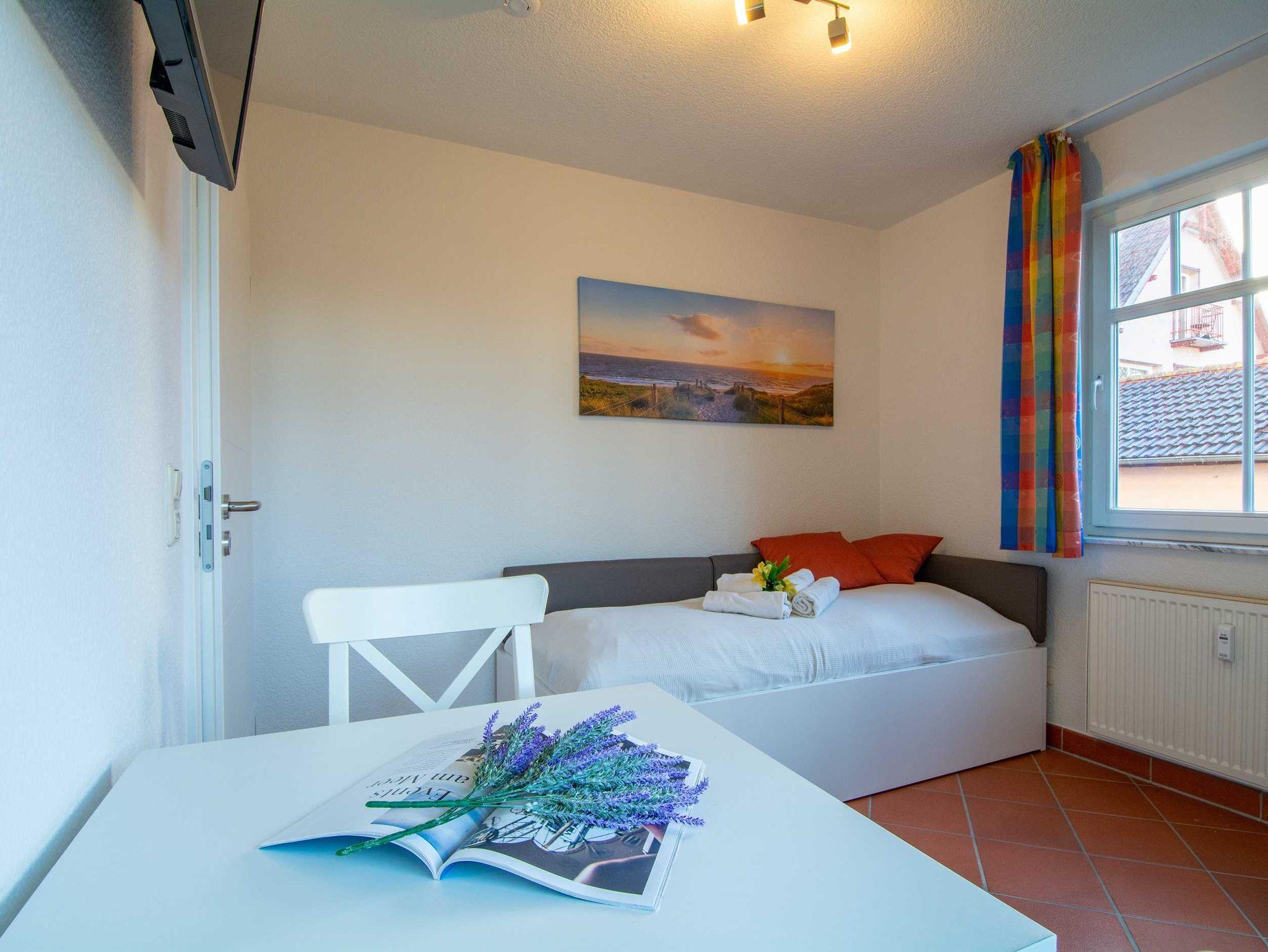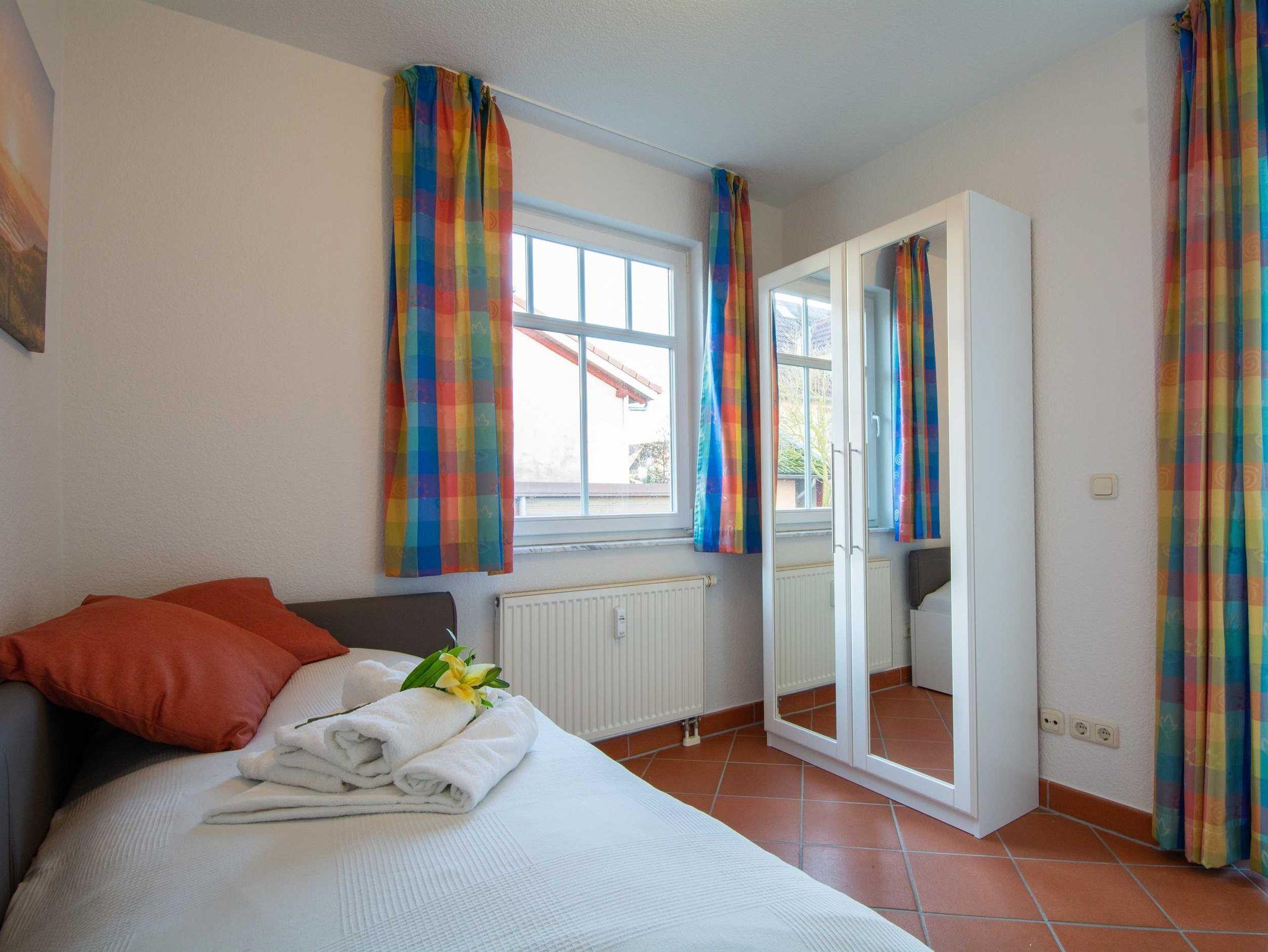 Die Wohnung verfügt über zwei Schlafzimmer: Das große Schlafzimmer ist ausgestattet mit einem Doppelbett (2 x 90cm x 200cm), einem großen Kleiderschrank sowie einer Ablage für Ihre Reisetasche. Das kleine Schlafzimmer ist nach Westen ausgerichtet und hat einen eigenen kleinen Balkon (möbliert mit 1 Tisch und 2 Stühlen). Es verfügt über eine Raumsparliege, welche sich zu einem Doppelbett ausziehen lässt (Größe 90x200cm; 80X190cm) sowie einem kleinen Tisch mit 2 Stühlen, einem Kleiderschrank und einem 32-Zoll-Flachbild-TV. Das großzügige Tageslichtbad ist komplett gefliest, ist ausgestattet mit Dusche und WC sowie einem Handfön und Handtuchheizkörper.