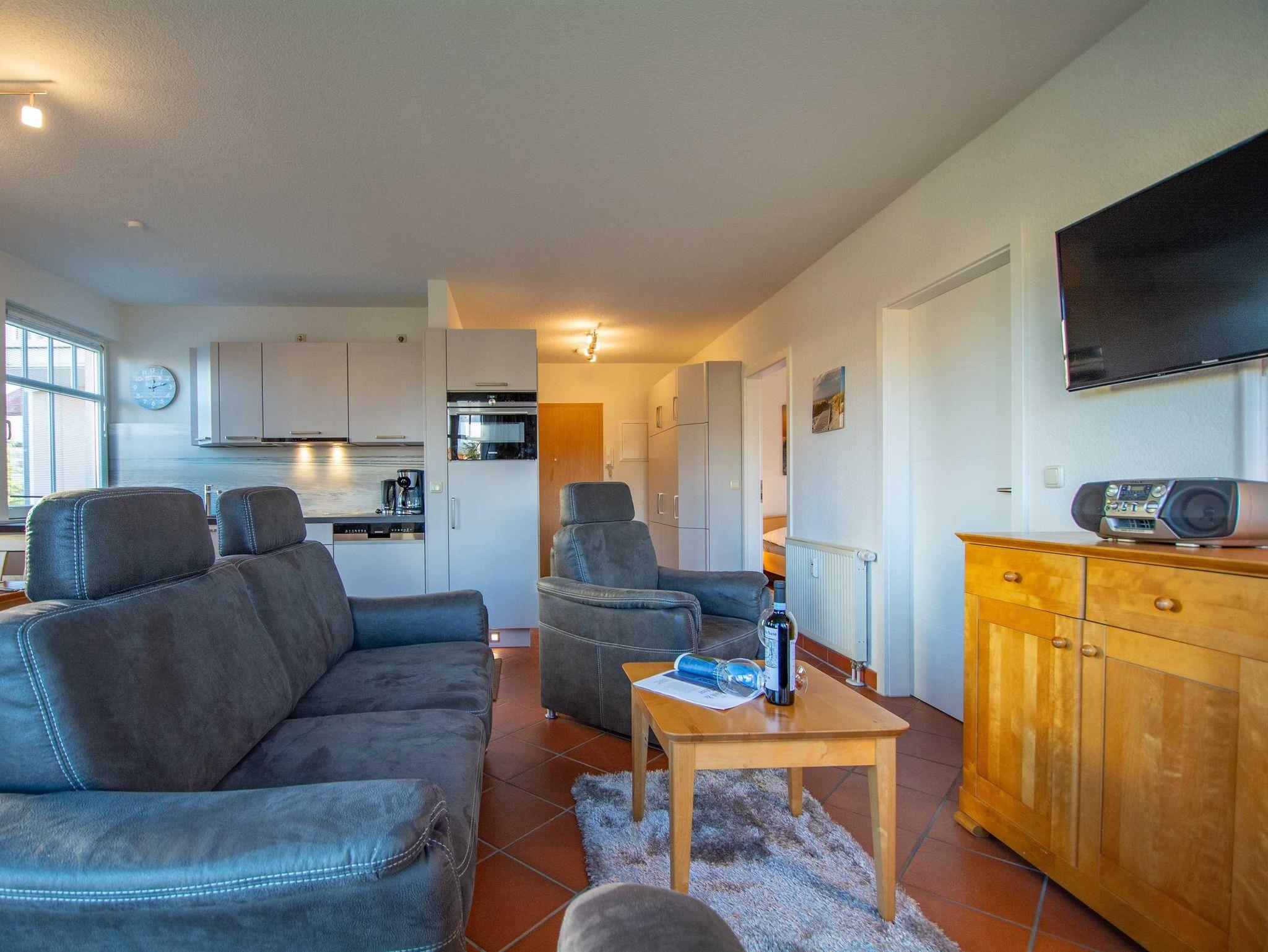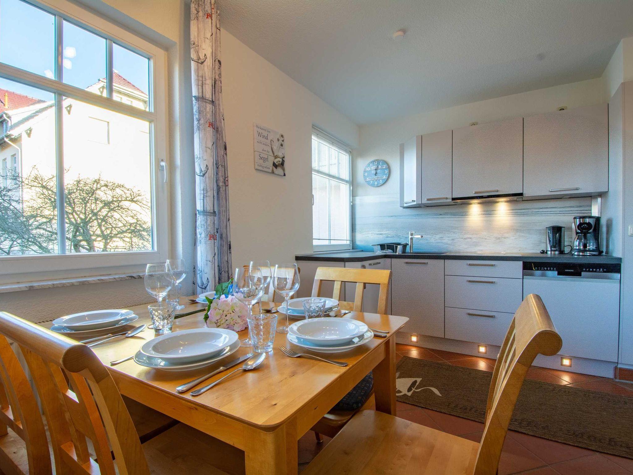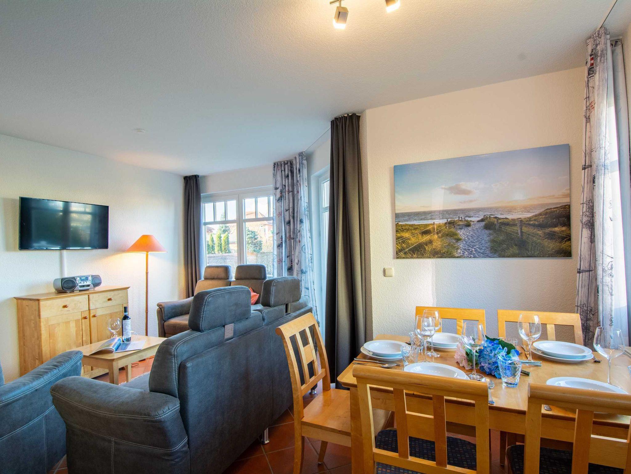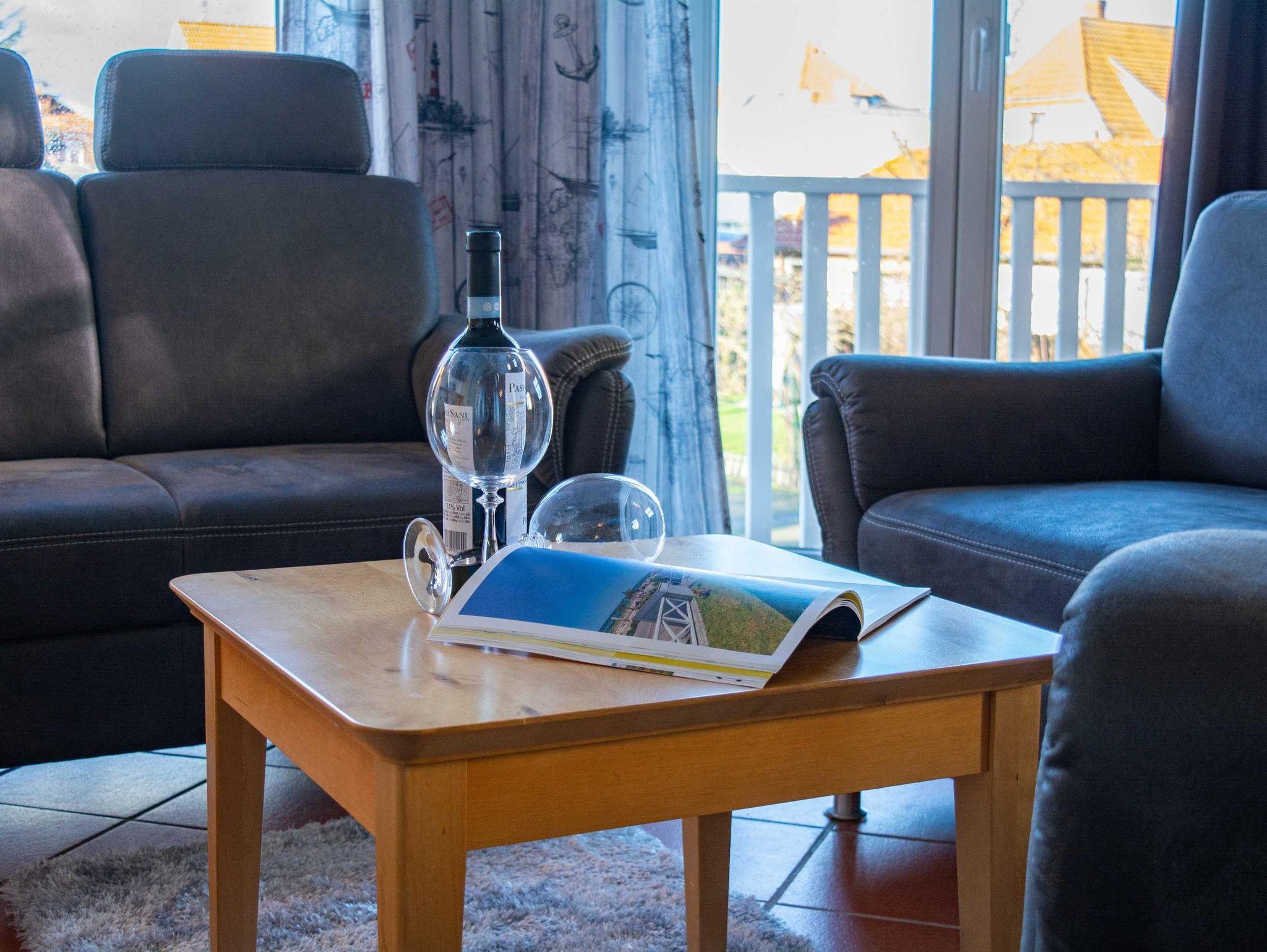 Die liebevoll eingerichtete 3-Raum-Ferienwohnung von ca. 53 m² Größe ist für 2 bis 4 Personen ausgestattet und befindet sich im Hochparterre. Sie betreten die Wohnung über den offenen Flurbereich mit genügend Ablage- und Staufläche für Ihre Kleidung in einer geschlossenen Garderobe, der direkt an das Wohnzimmer anschließt. Der kombinierte Wohn- und Essbereich ist ausgestattet mit einer gemütlichen Couchgarnitur mit Kopfstützen, 39-Zoll-Flachbild-TV und Radio (mit CD-Player), einem Esstisch mit 5 Stühlen sowie der neuen (im Jahr 2021 eingebaut) voll ausgestatteten Küchenzeile (4-Platten-Induktionskochfeld, Backofen, Gefrierkombination mit Tiefkühlfach, Geschirrspüler, Kaffeemaschine, Wasserkocher, Toaster). Ein möblierter Balkon (1 Tisch mit 2 Stühlen) in Richtung Westen ist vom Wohnzimmer und ein weiterer Balkon ist vom zweiten Schlafzimmer aus begehbar.