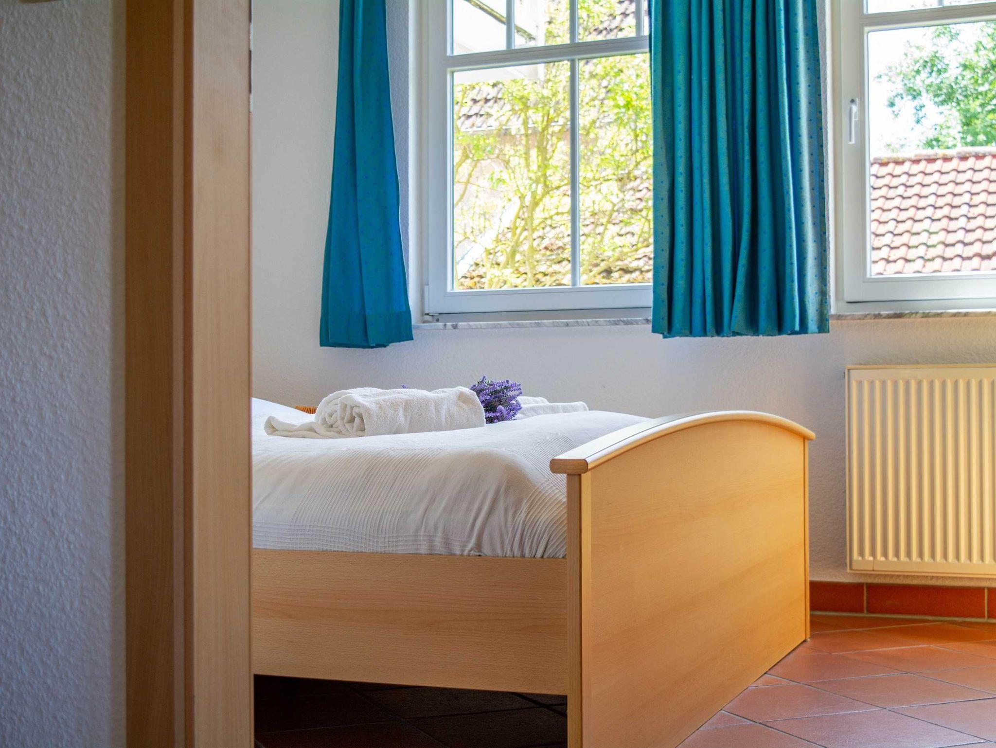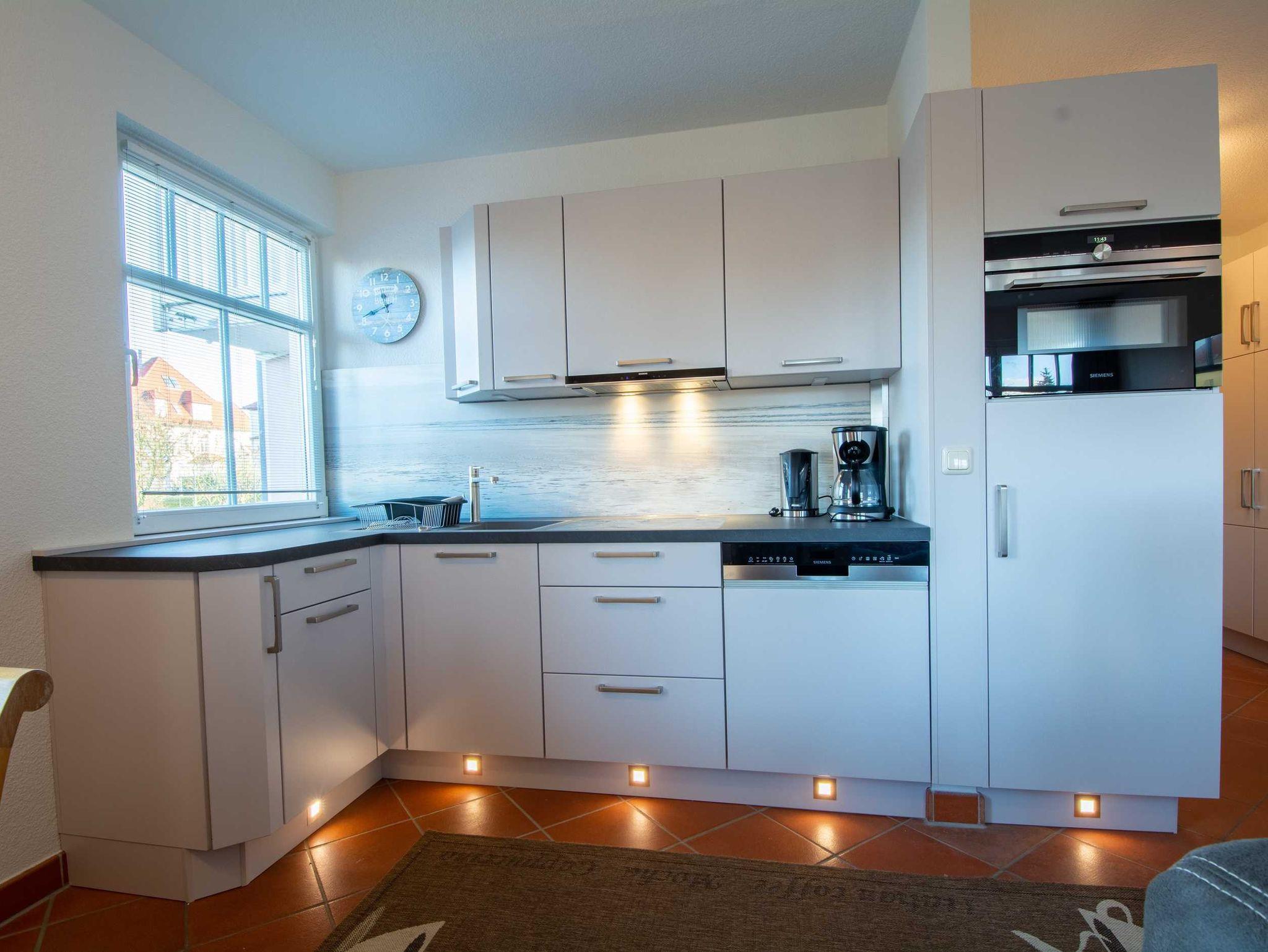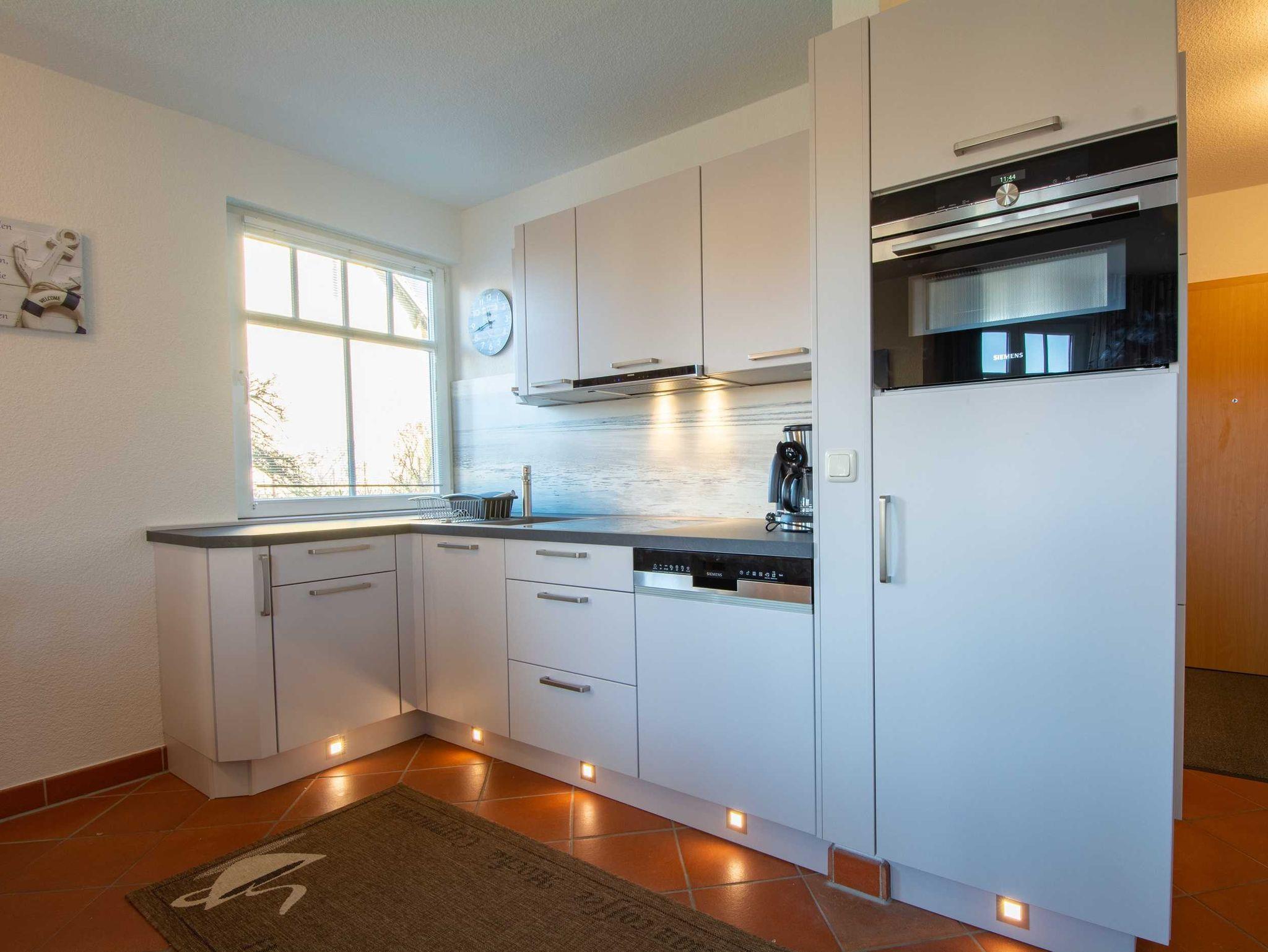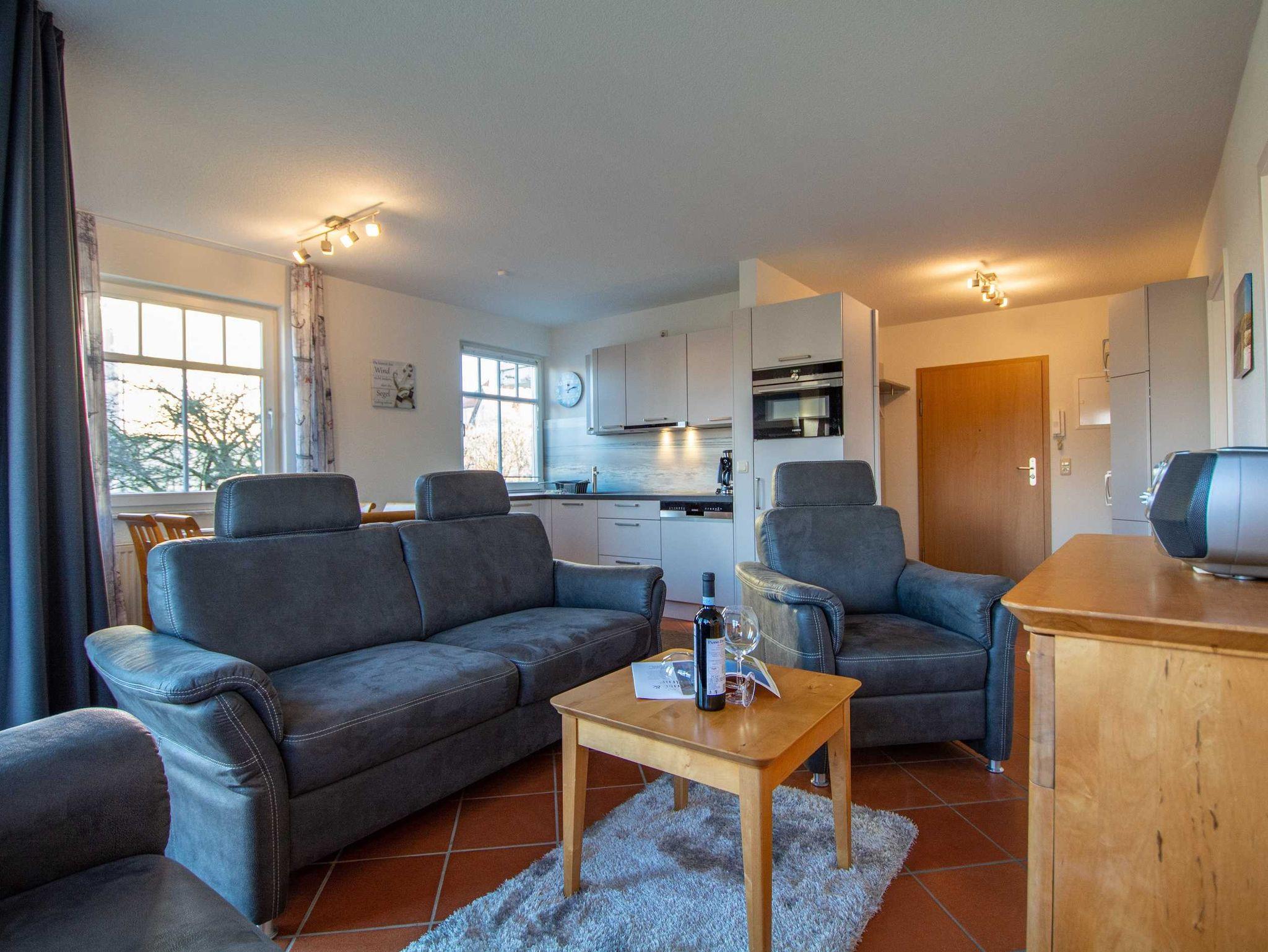 Die liebevoll eingerichtete 3-Raum-Ferienwohnung von ca. 53 m² Größe ist für 2 bis 4 Personen ausgestattet und befindet sich im Hochparterre. Sie betreten die Wohnung über den offenen Flurbereich mit genügend Ablage- und Staufläche für Ihre Kleidung in einer geschlossenen Garderobe, der direkt an das Wohnzimmer anschließt. Der kombinierte Wohn- und Essbereich ist ausgestattet mit einer gemütlichen Couchgarnitur mit Kopfstützen, 39-Zoll-Flachbild-TV und Radio (mit CD-Player), einem Esstisch mit 5 Stühlen sowie der neuen (im Jahr 2021 eingebaut) voll ausgestatteten Küchenzeile (4-Platten-Induktionskochfeld, Backofen, Gefrierkombination mit Tiefkühlfach, Geschirrspüler, Kaffeemaschine, Wasserkocher, Toaster). Ein möblierter Balkon (1 Tisch mit 2 Stühlen) in Richtung Westen ist vom Wohnzimmer und ein weiterer Balkon ist vom zweiten Schlafzimmer aus begehbar.