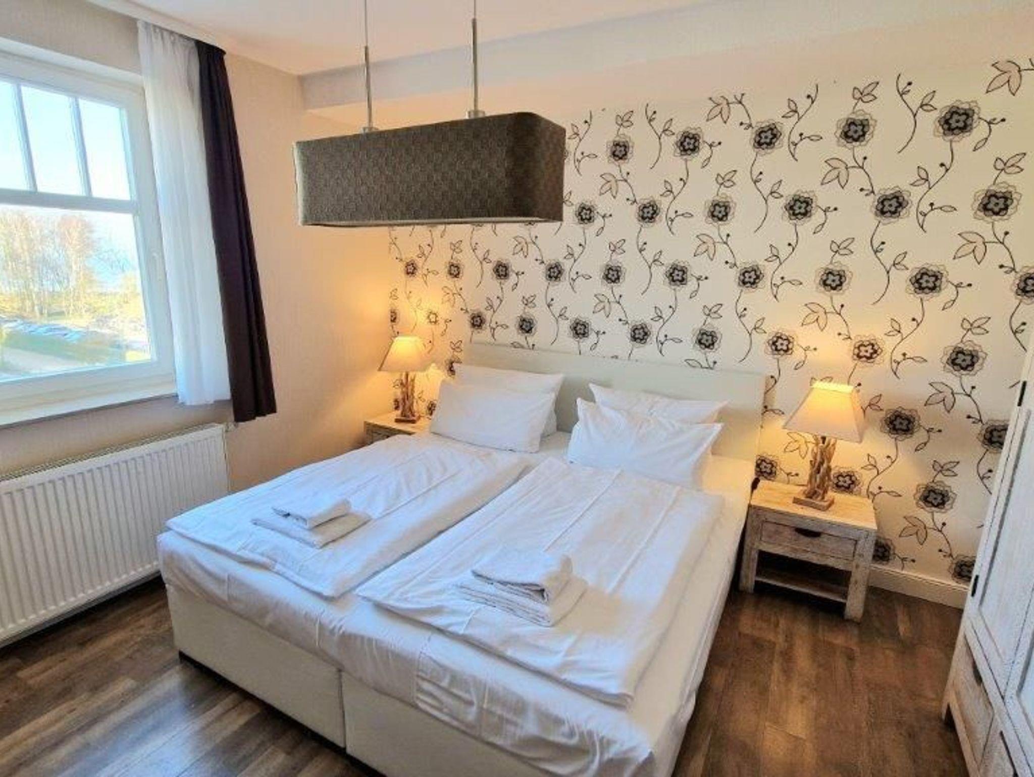 Das 1,80 Meter breite Doppelbett und ein Kleiderschrank komplettieren die Einrichtung.