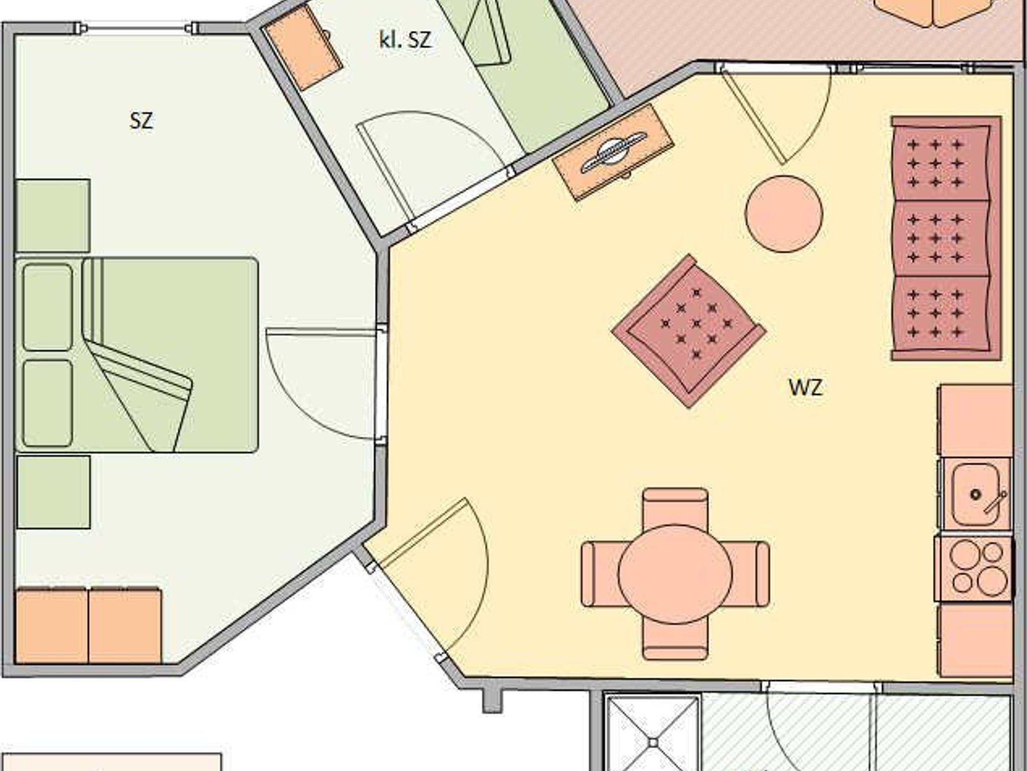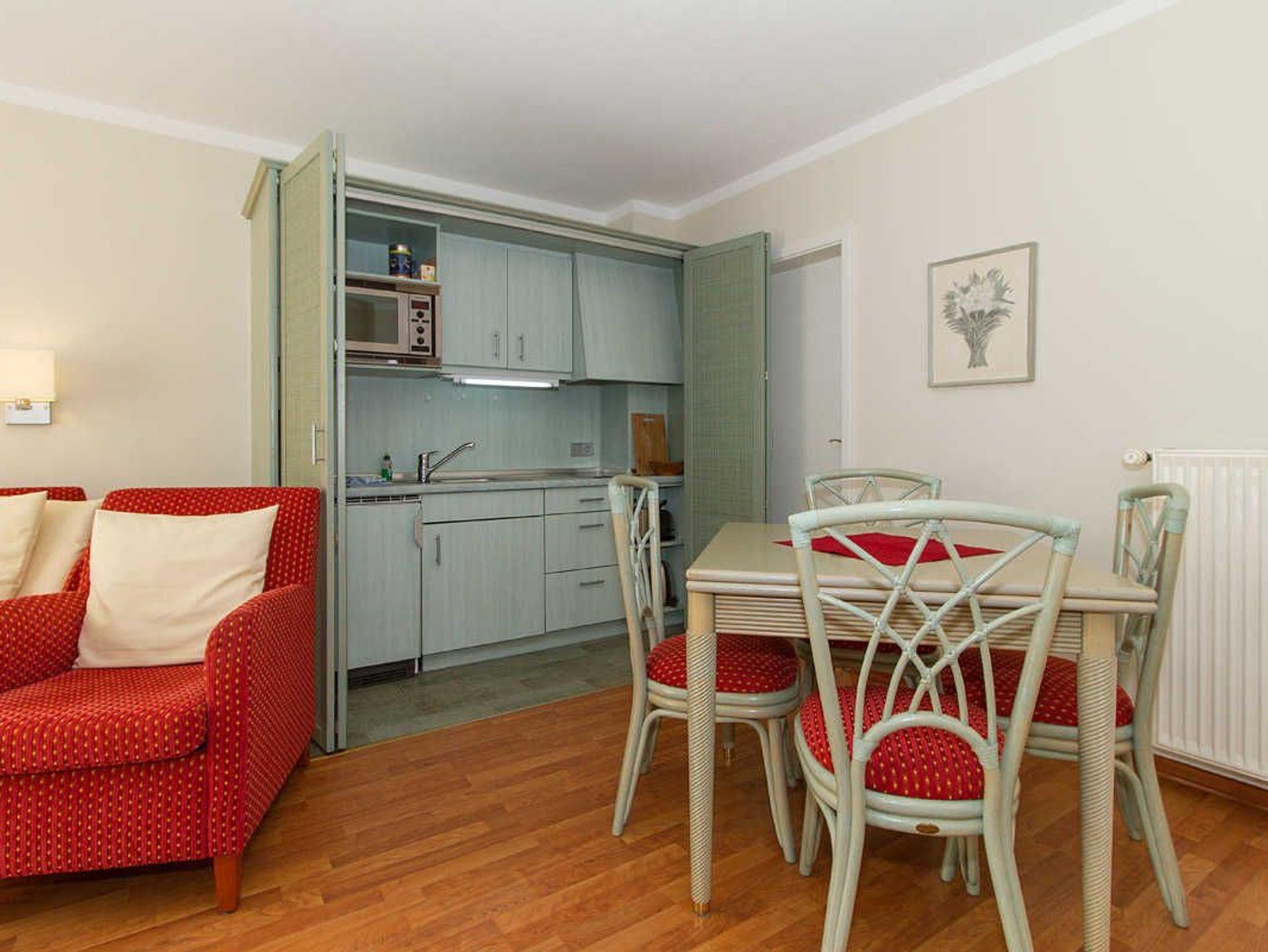 Die Wohnung ist im 3. Obergeschoss gelegen und hat einen Balkon zur Südseite. Die Wohnungsgröße beträgt ca. 45 qm und teilt sich in Wohnzimmer, Küchenzeile, Schlafzimmer, kl. Kinderzimmer, Duschbad. Im Wohnzimmer befindet sich ein Esstisch mit 4 Stühlen, eine Küchenzeile, Kühlschrank, Caranfeld, Mikrowelle mit Backofen, Tresor, HD-Sat TV und Telefon.