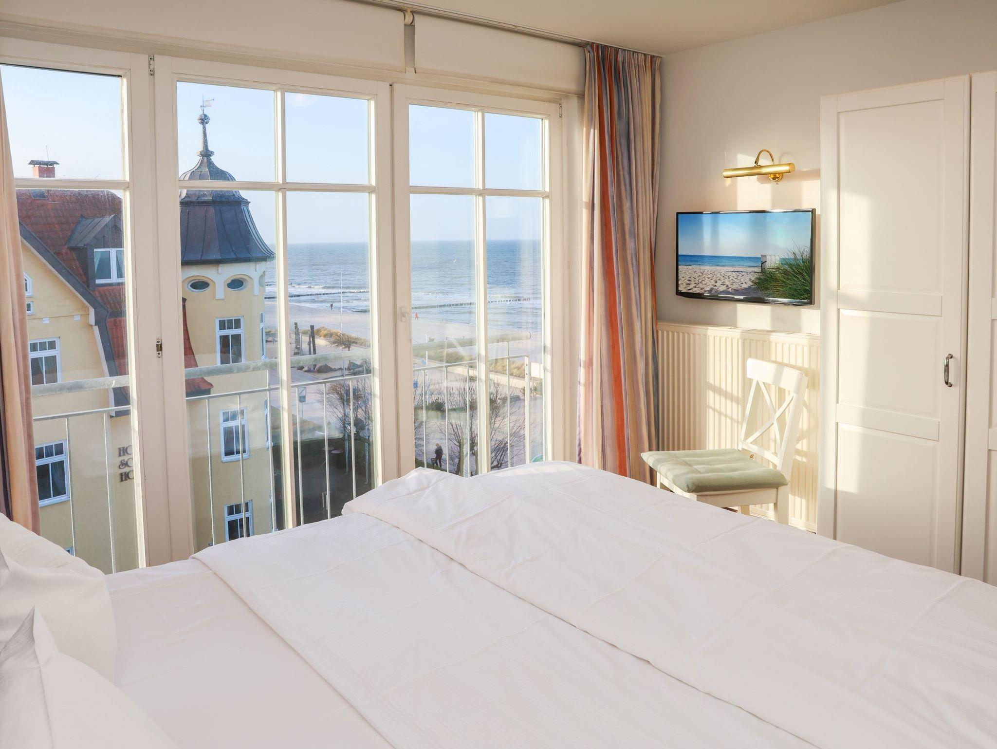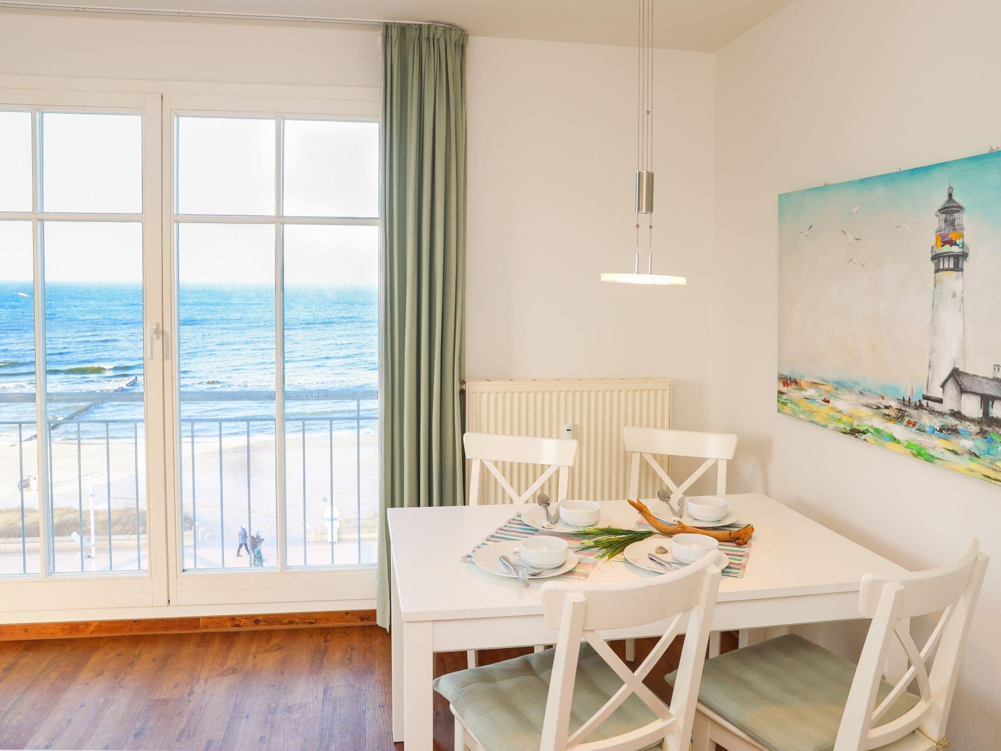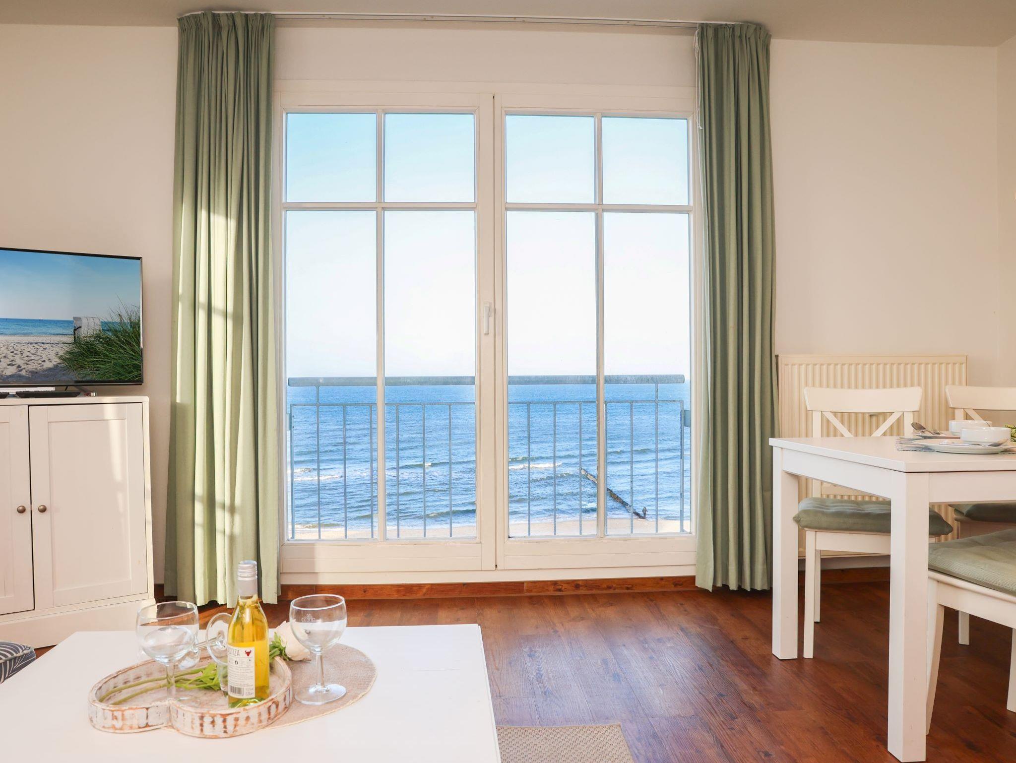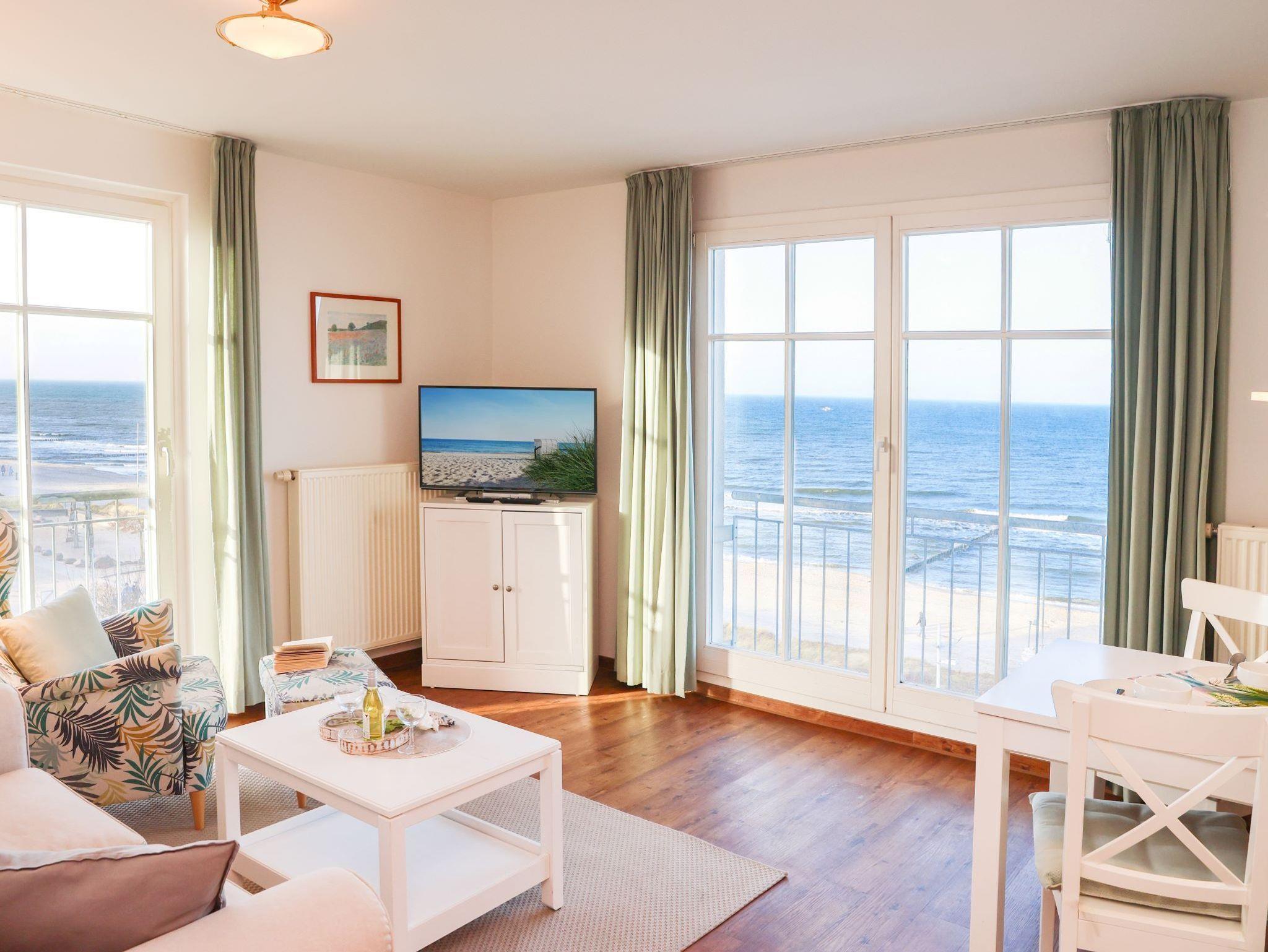 Nur 10 m vom Strand wohnen Sie in einer modern eingerichteten 3-Raum-Ferienwohnung. Die 60 qm große Wohnung liegt in der 4. Etage. Das Wohnzimmer ist mit einer Schlafcouch, Couchtisch, Sessel, Anrichte, Kabel-TV, Radio, Essbereich (Esstisch und 4 Stühle) und Küchenzeile ausgestattet. Das französische Fenster bietet einen freien Blick auf die Ostsee. Im Schlafzimmer stehen ein Doppelbett und ein Kleiderschrank und im Gästezimmer ein Ausziehbares Bett und ein Wäscheschrank. Die Küchenzeile wurde modern ausgestattet mit Mikrowelle, Kühlschrank, Kaffeemaschine, Zweiplattenkochfeld, Geschirrspüler, Toaster und Wasserkocher. Das Bad mit Dusche/WC und der Flur mit Garderobe komplettieren die Wohnung.