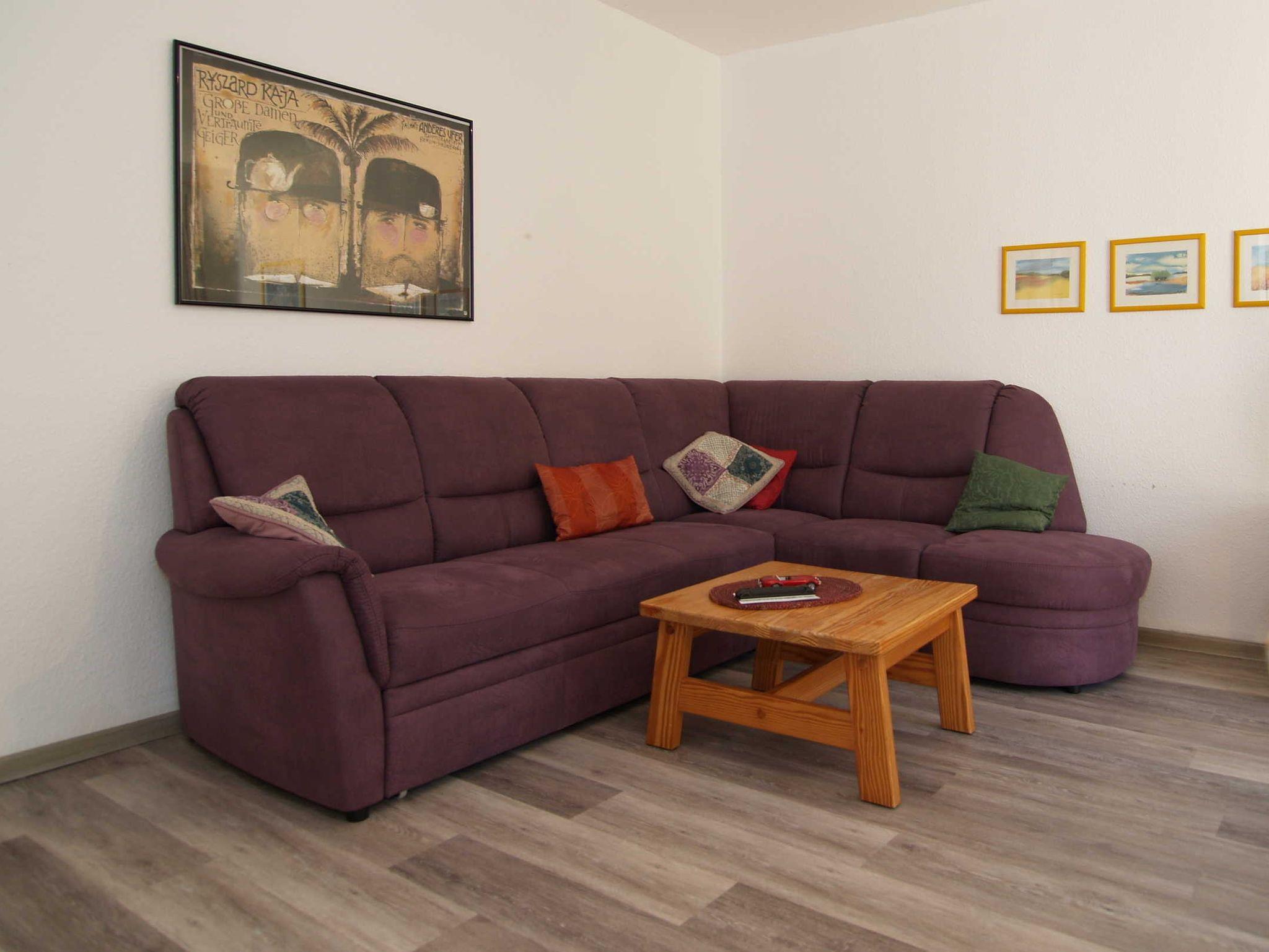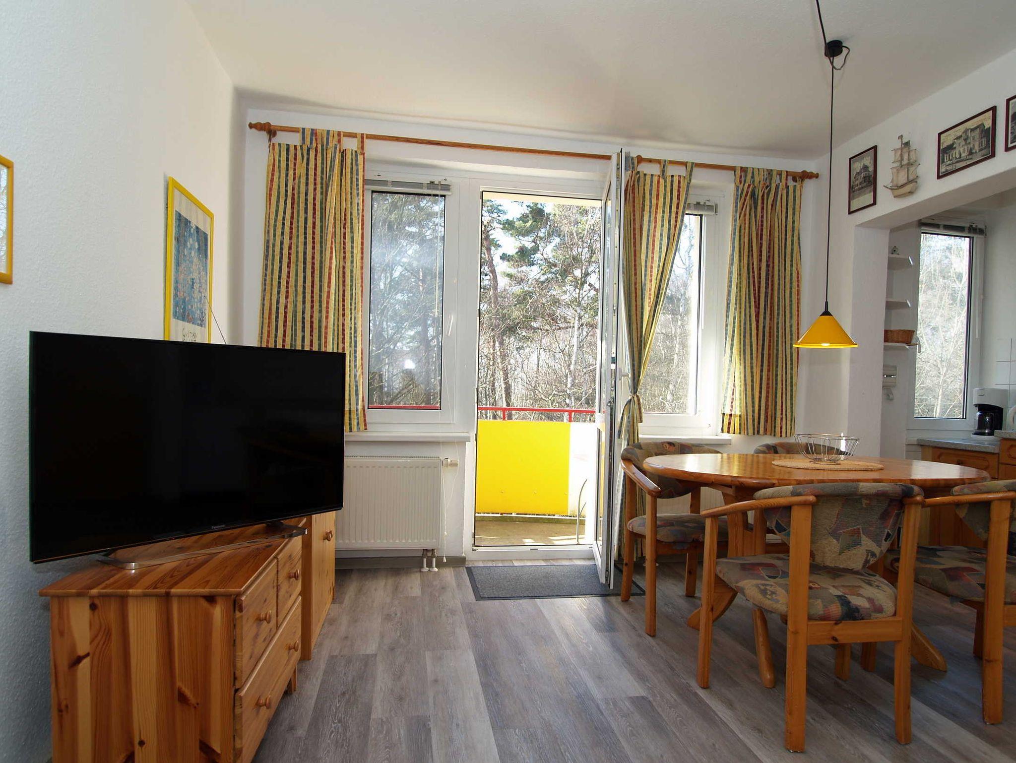 Der gemütliche Wohnraum ist ausgestattet mit einer Wohnlandschaft und einem 39-Zoll-Flachbild-TV. Der angrenzende Essbereich bietet Ihnen reichlich Platz für gemeinsame Mahlzeiten. Die offene Küchenzeile hält für Sie alle wichtigen Küchengeräte und -utensilien bereit, die Sie für Ihr perfektes Dinner benötigen: Ein 4-Platten-Herd mit Dunstabzug, ein Backofen, ein Kühlschrank mit Gefrierfach, ein Geschirrspüler sowie Mikrowelle befinden sich in der Küche. Eine Kaffeemaschine, ein Wasserkocher und ein Toaster sowie genügend Koch- und Essgeschirr vervollständigen die Kücheneinrichtung. Vom Wohnraum betreten Sie den möblierten West-Balkon, der zu langen Abenden zu einem Glas Wein und romantischen Sonnenuntergängen einlädt. Seitlich können Sie von hier auch einen Blick auf die Ostsee erhaschen.