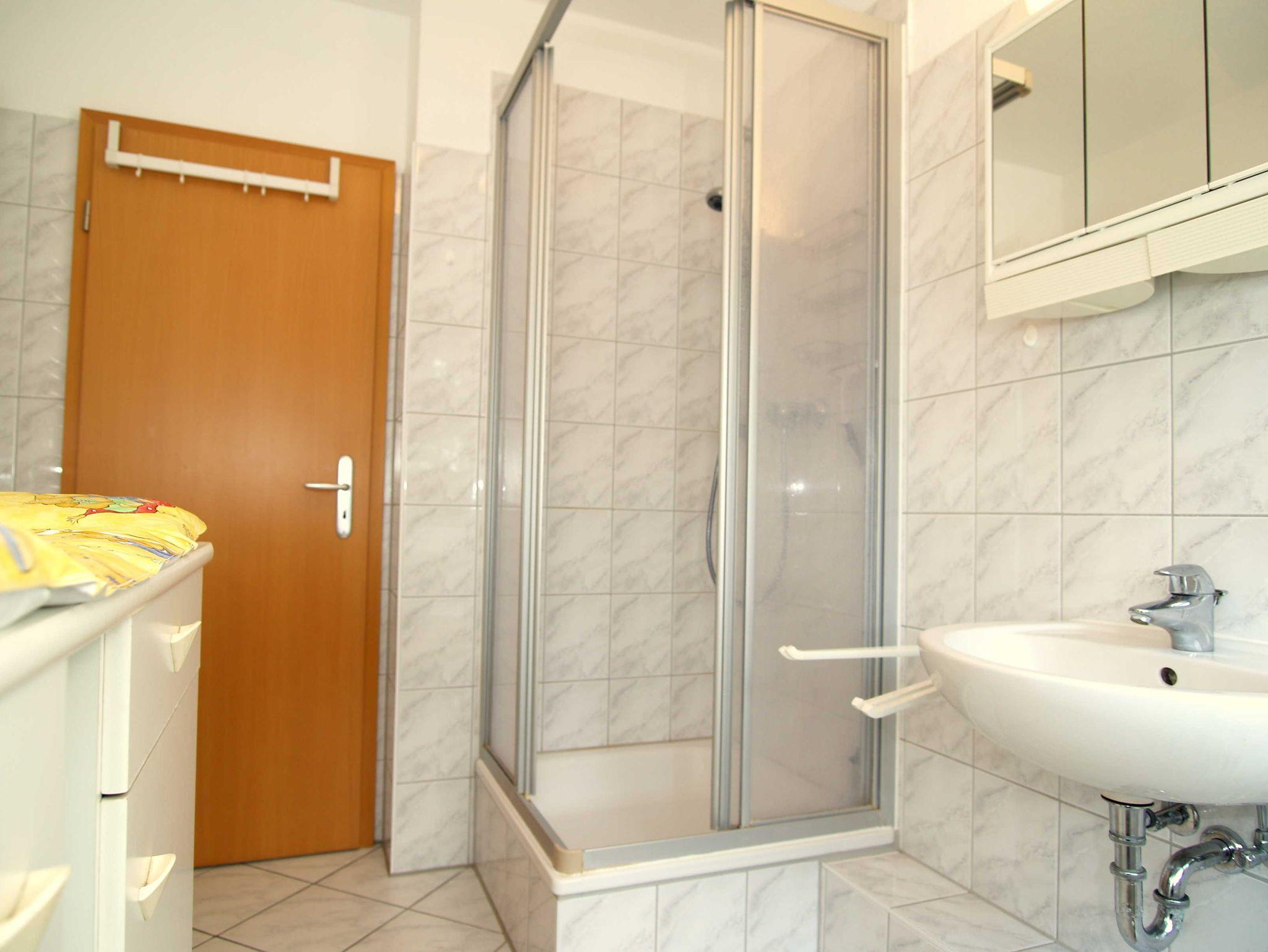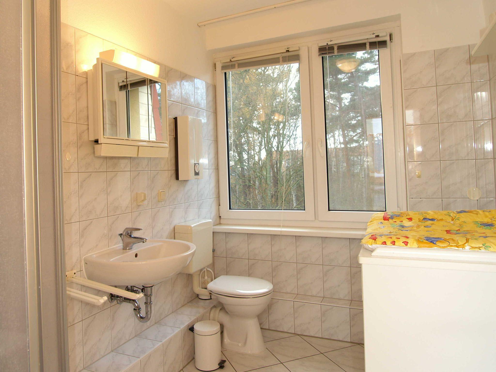 Das geflieste Tageslichtbad mit Dusche, WC und Wickeltisch vervollständigt das Gesamtbild dieser Wohnung.