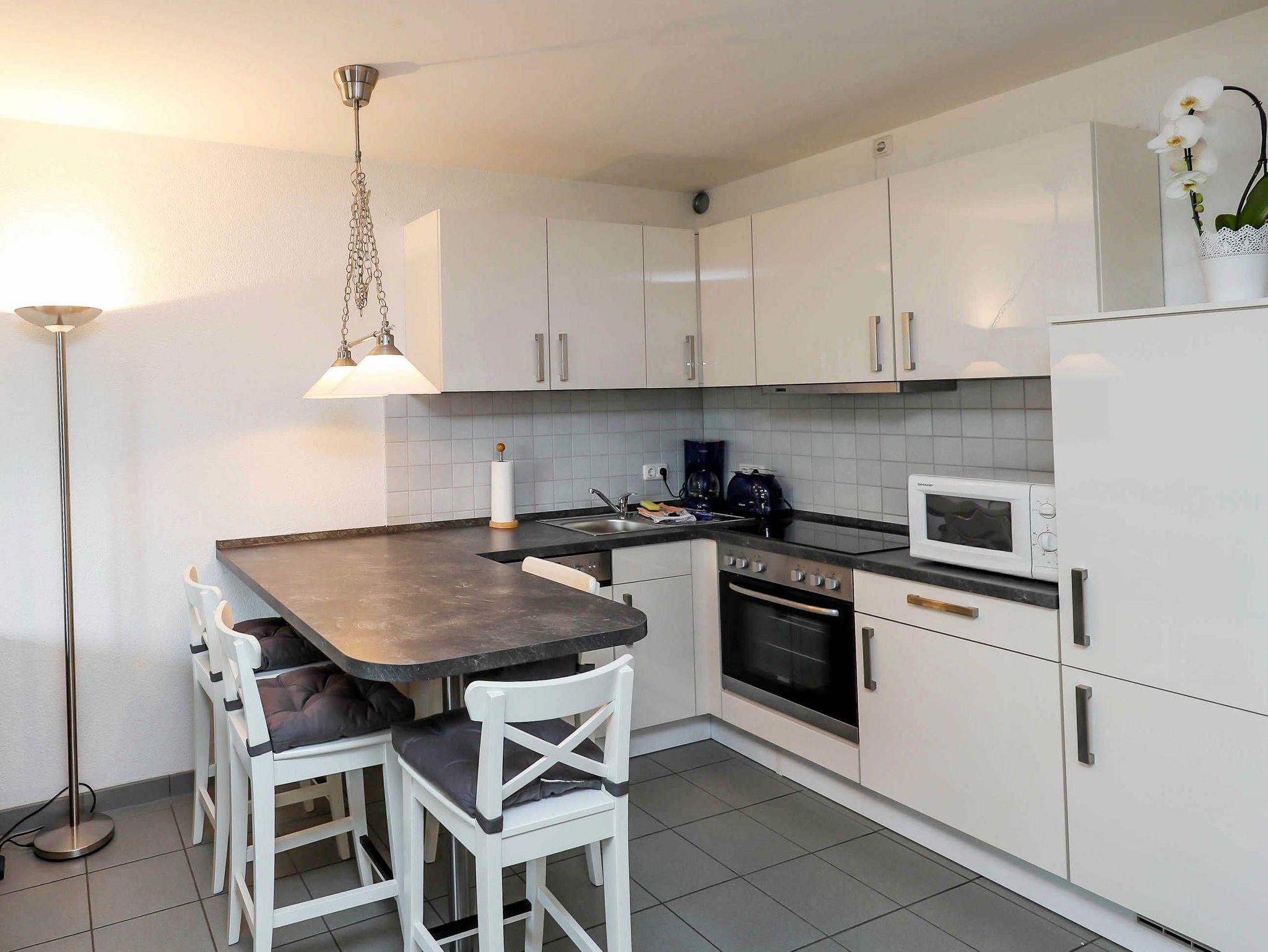 Die offene Küchenzeile hält für Sie alle wichtigen Küchengeräte und -utensilien bereit, die Sie für Ihr perfektes Dinner benötigen: Ein 4-Zonen-Cerankochfeld mit Dunstabzug und Backofen, eine Mikrowelle, ein Geschirrspüler sowie ein Kühlschrank mit Gefrierfach befinden sich in der Küche. Eine Kaffeemaschine, ein Wasserkocher und ein Toaster sowie genügend Koch- und Essgeschirr vervollständigen die Kücheneinrichtung.
