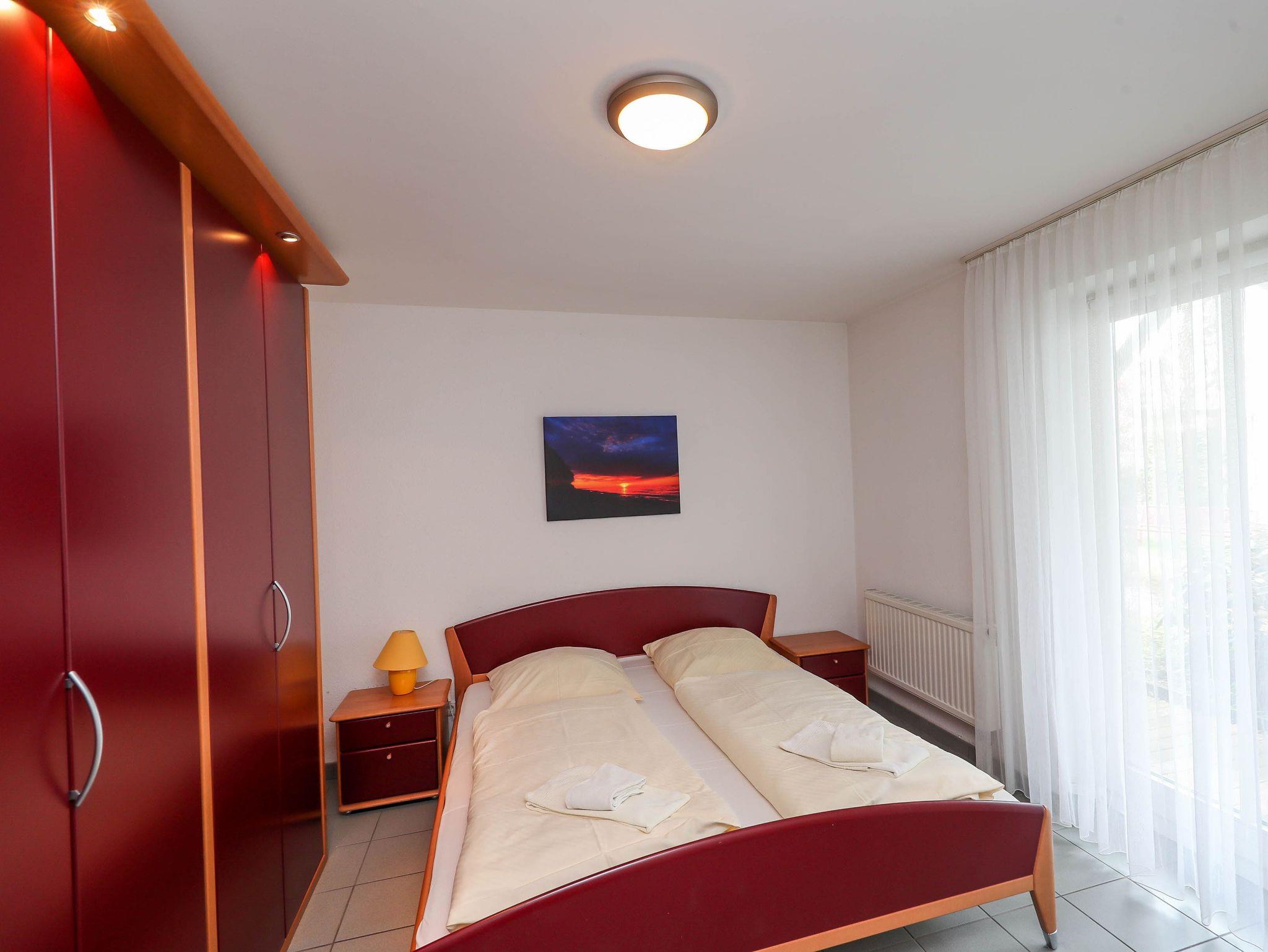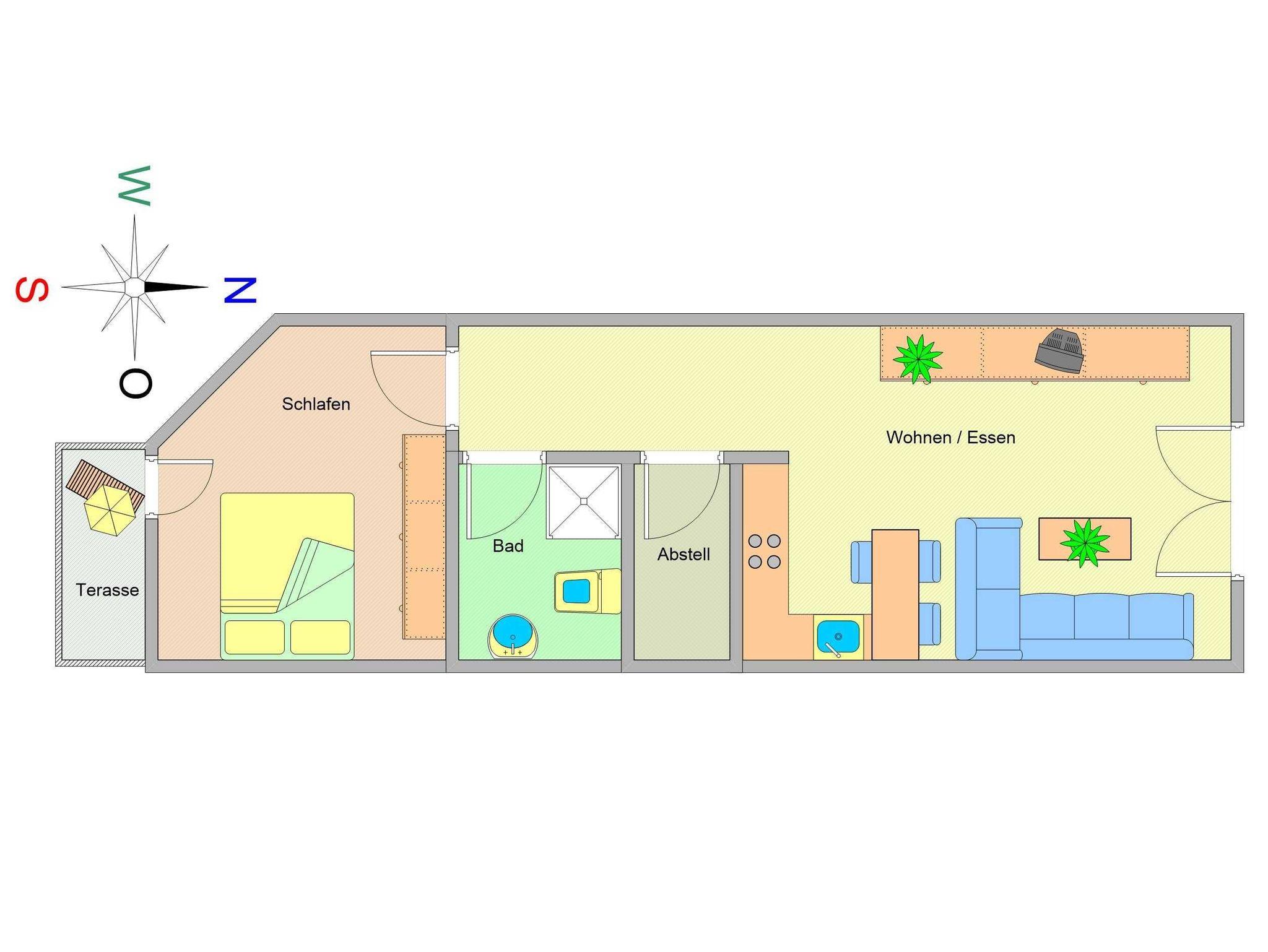 Im Schlafzimmer lädt Sie ein komfortables Doppelbett (2 x 90cm x 200 cm) zur Nachtruhe ein. Der geräumige Kleiderschrank bietet genügend Platz für Ihre Urlaubsgarderobe. Vom Schlafbereich betreten Sie die möblierte Terrasse, die nach Süden ausgerichtet ist. Hier können Sie Sonne tanken, relaxen und den Abend nach einem schönen Tag am Meer ausklingen lassen. Das geflieste Bad mit Dusche und WC vervollständigen das Gesamtbild dieser Wohnung.