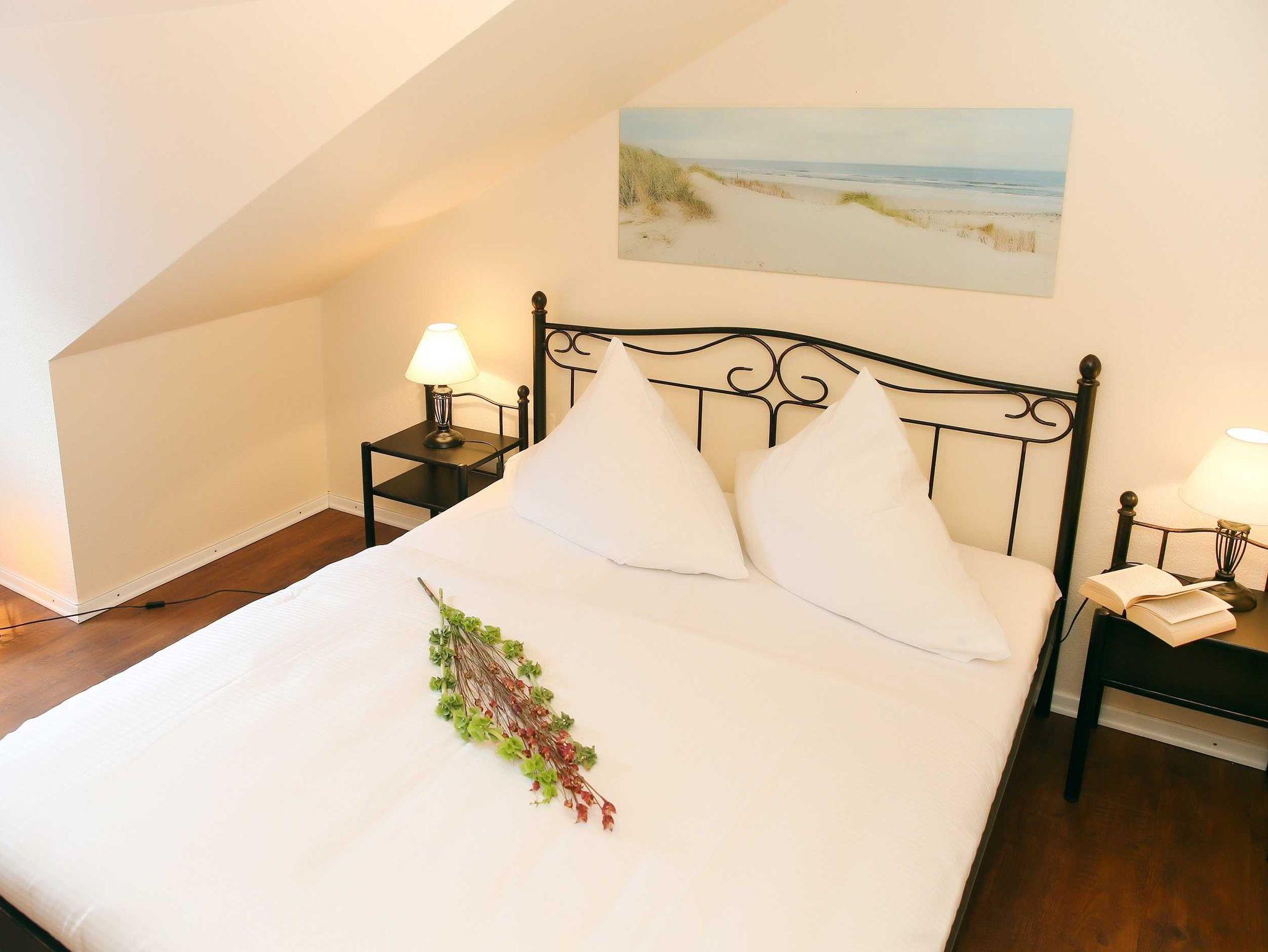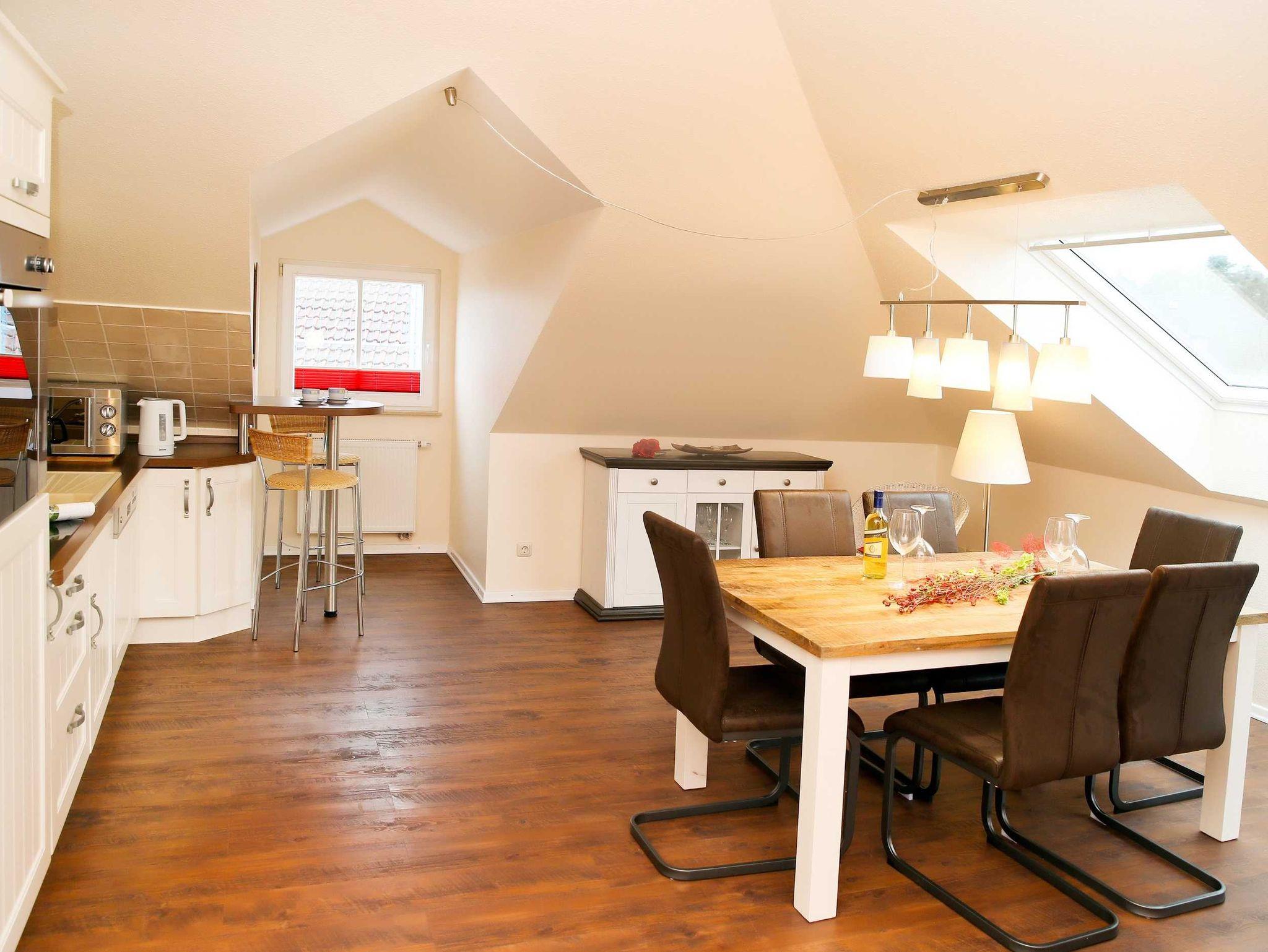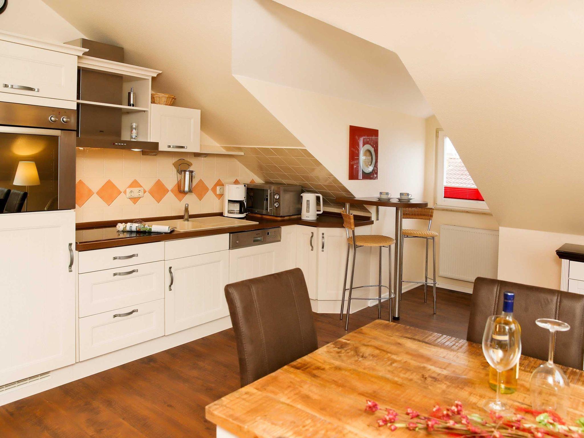 Sie wohnen in einer hochwertig eingerichteten 4-Raum-Ferienwohnung von 93 m² Größe, die sich im ersten Dachgeschoß befindet. Das Wohnzimmer ist ausgestattet mit einer bequemen Sitzgarnitur, Essecke, Flatscreen-TV und Dolby Surround-Anlage mit DVD Player. Vom Wohnraum aus betreten Sie die Südwestdachterrasse, die zum Entspannen einlädt. Die Küche ist ausgestattet mit Geschirrspüler, Mikrowelle, Ceranfeld mit Backofen u.v.m. Die Wohnung verfügt über zwei Schlafzimmer mit Doppelbett, Kleiderschrank und Flatscreen-TV (vom großen Schlafzimmer können Sie den Südostbalkon betreten) sowie ein Schlafzimmer mit Etagenbett. Das Bad mit Eckbadewanne, Dusche und WC vervollständigt das Gesamtbild dieser Wohnung.