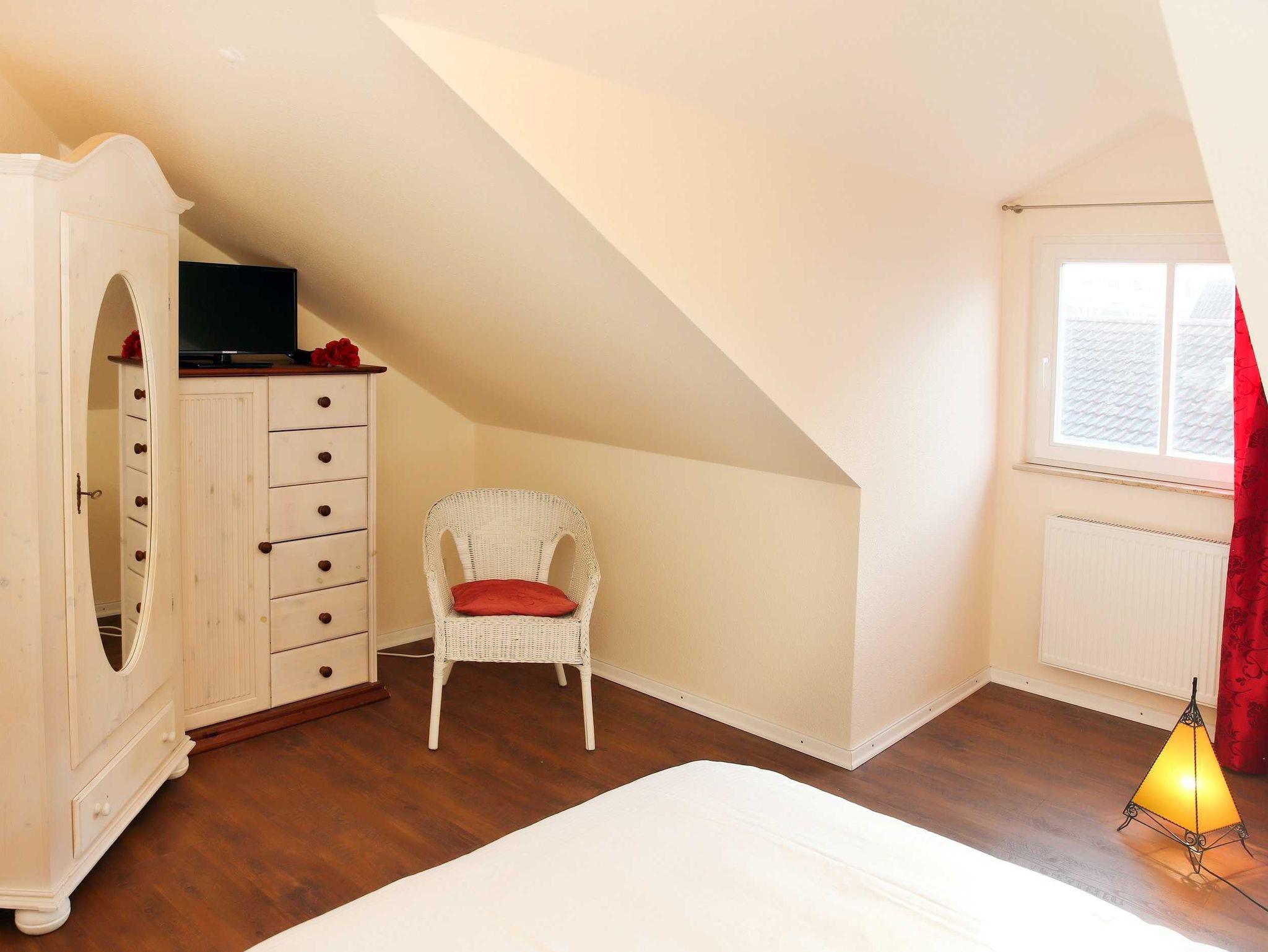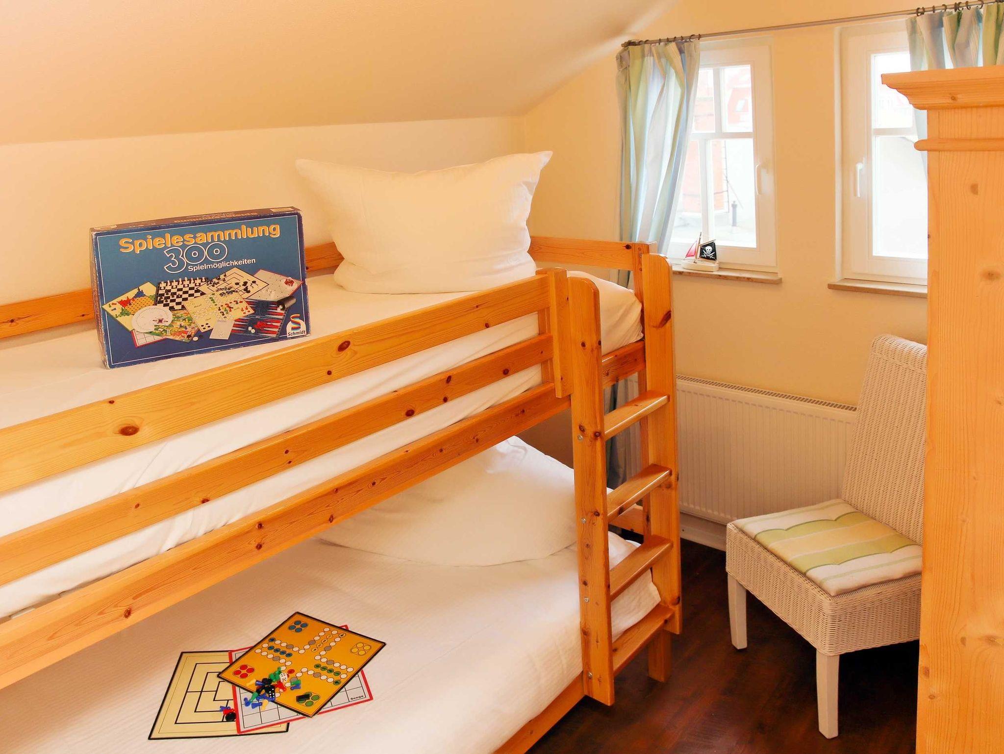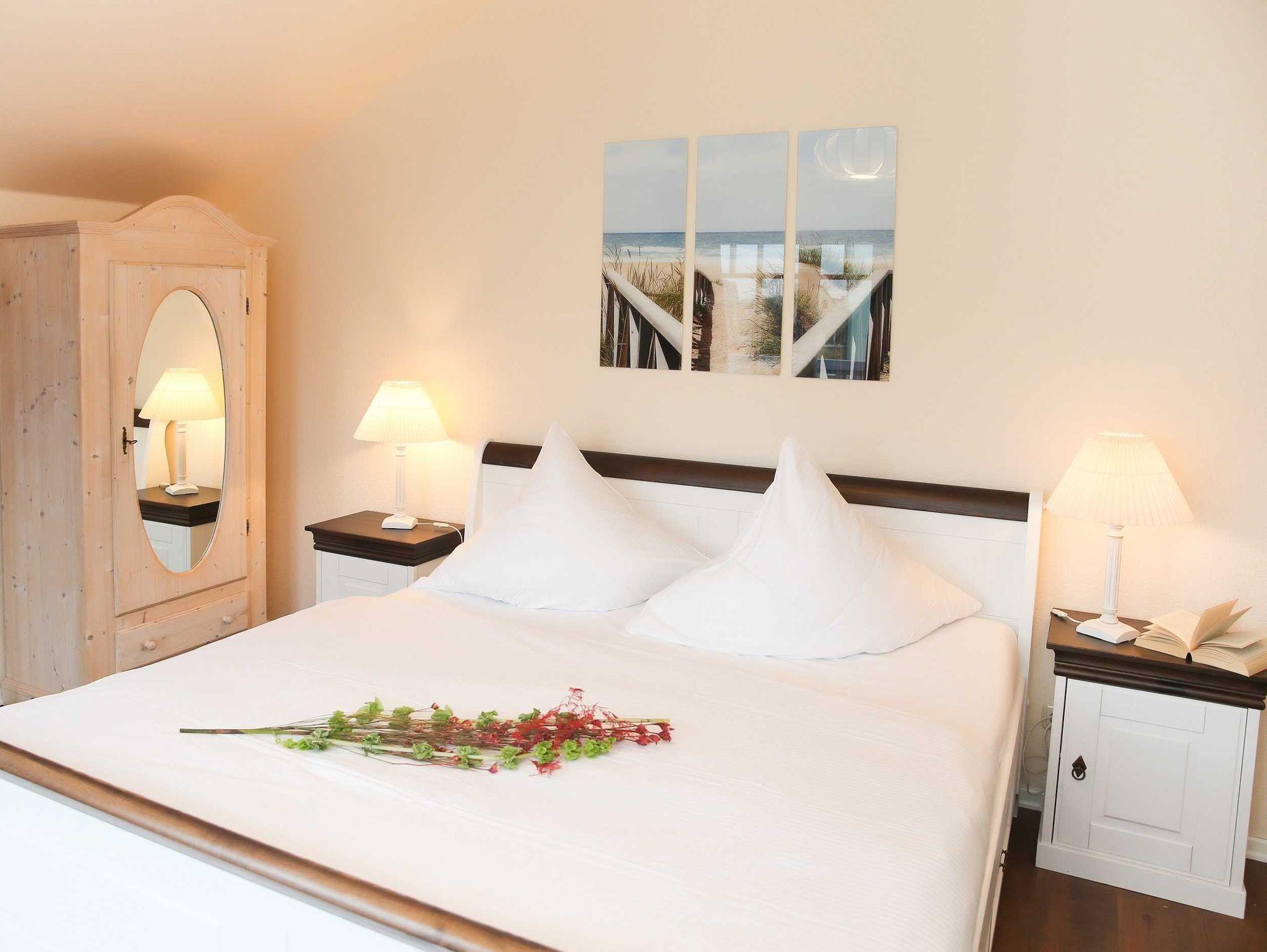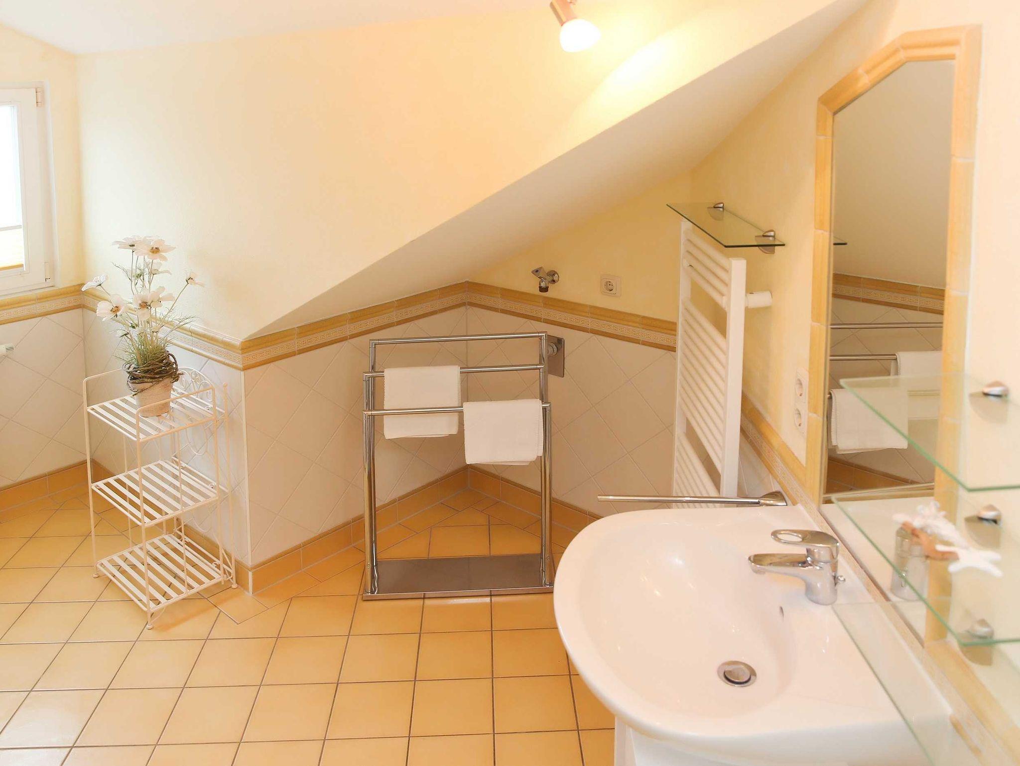 Sie wohnen in einer hochwertig eingerichteten 4-Raum-Ferienwohnung von 93 m² Größe, die sich im ersten Dachgeschoß befindet. Das Wohnzimmer ist ausgestattet mit einer bequemen Sitzgarnitur, Essecke, Flatscreen-TV und Dolby Surround-Anlage mit DVD Player. Vom Wohnraum aus betreten Sie die Südwestdachterrasse, die zum Entspannen einlädt. Die Küche ist ausgestattet mit Geschirrspüler, Mikrowelle, Ceranfeld mit Backofen u.v.m. Die Wohnung verfügt über zwei Schlafzimmer mit Doppelbett, Kleiderschrank und Flatscreen-TV (vom großen Schlafzimmer können Sie den Südostbalkon betreten) sowie ein Schlafzimmer mit Etagenbett. Das Bad mit Eckbadewanne, Dusche und WC vervollständigt das Gesamtbild dieser Wohnung.