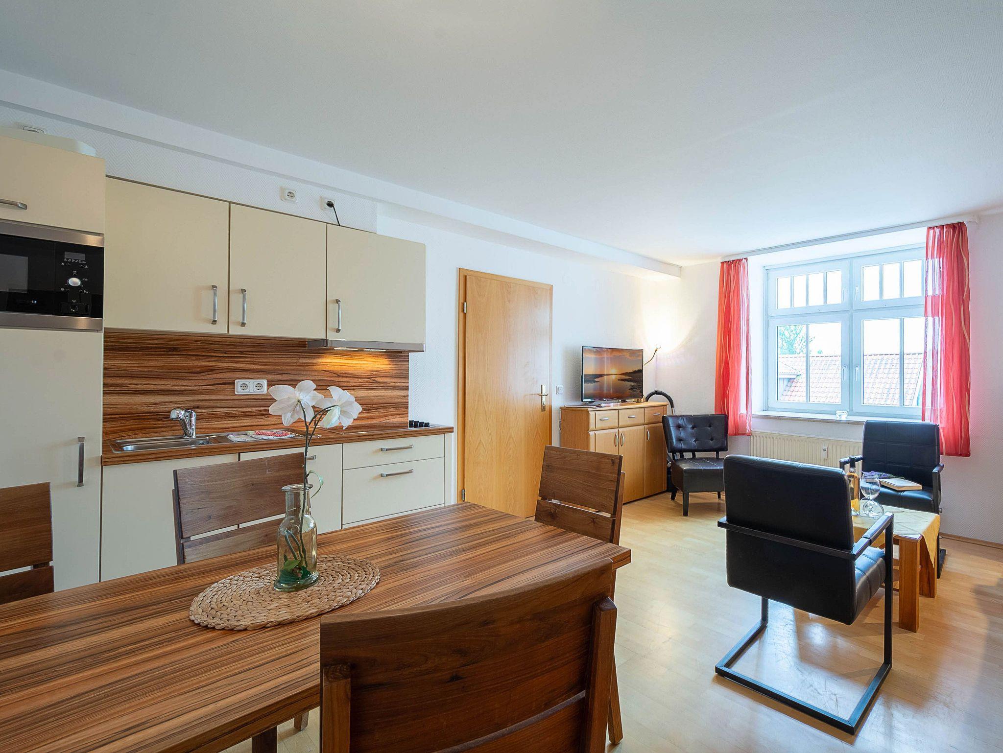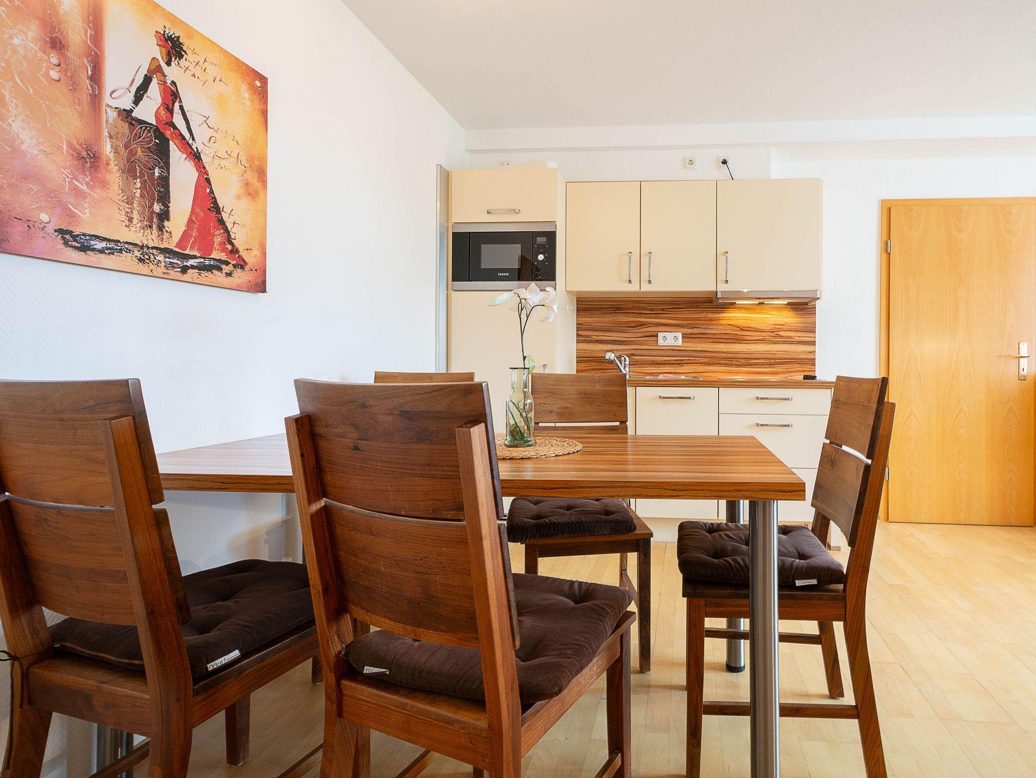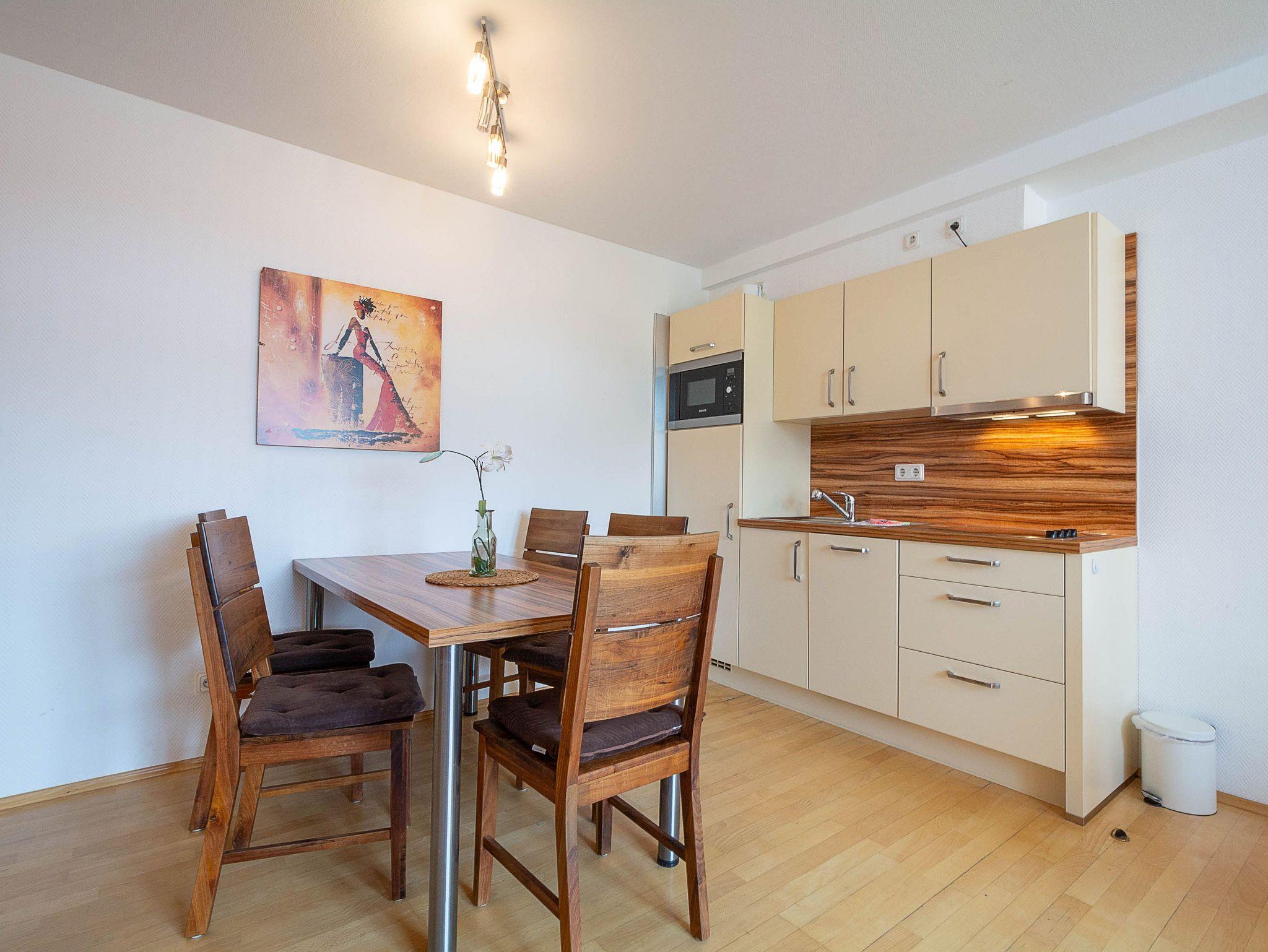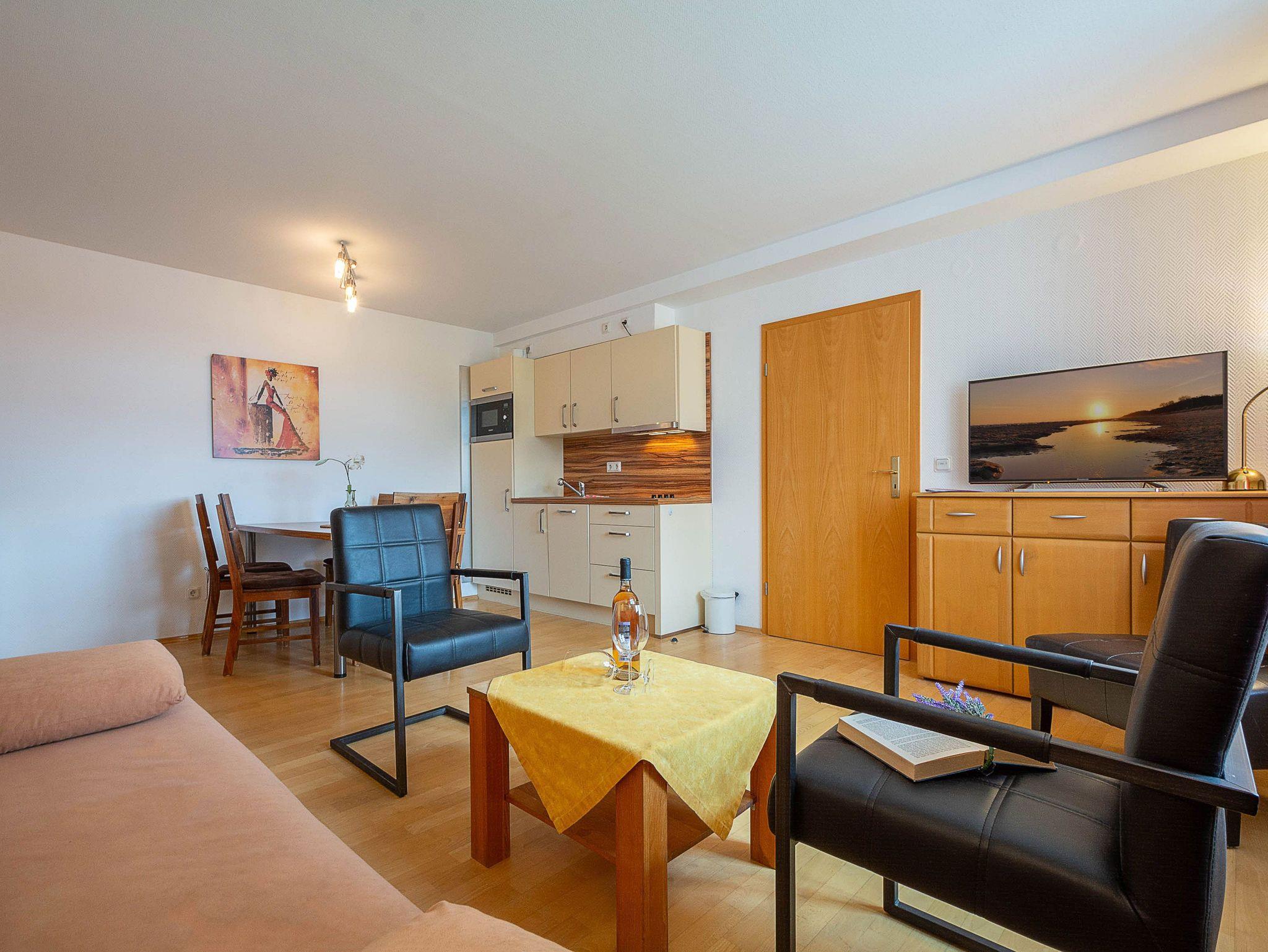 Sie wohnen in einer komfortabel eingerichteten 2-Raum-Wohnung von ca. 43 m² Größe, die im zweiten Obergeschoß liegt. Im Wohnzimmer befinden sich neben einer bequemen Sitzgruppe und dem Essplatz, Stereoanlage und TV-Gerät. Die Küchenzeile verfügt über 4-Platten-Herd (Ceran), Geschirrspüler, Kühlschrank mit Gefrierfach, Mikrowelle usw. Das Schlafzimmer ist ausgestattet mit einem Doppelbett, einem geräumigen Kleiderschrank und einem Flatscreen-TV. Vom Schlafzimmer gelangen Sie direkt in das Badezimmer. Das Badezimmer mit Wanne und WC und vervollständigen das Gesamtbild dieser Wohnung.