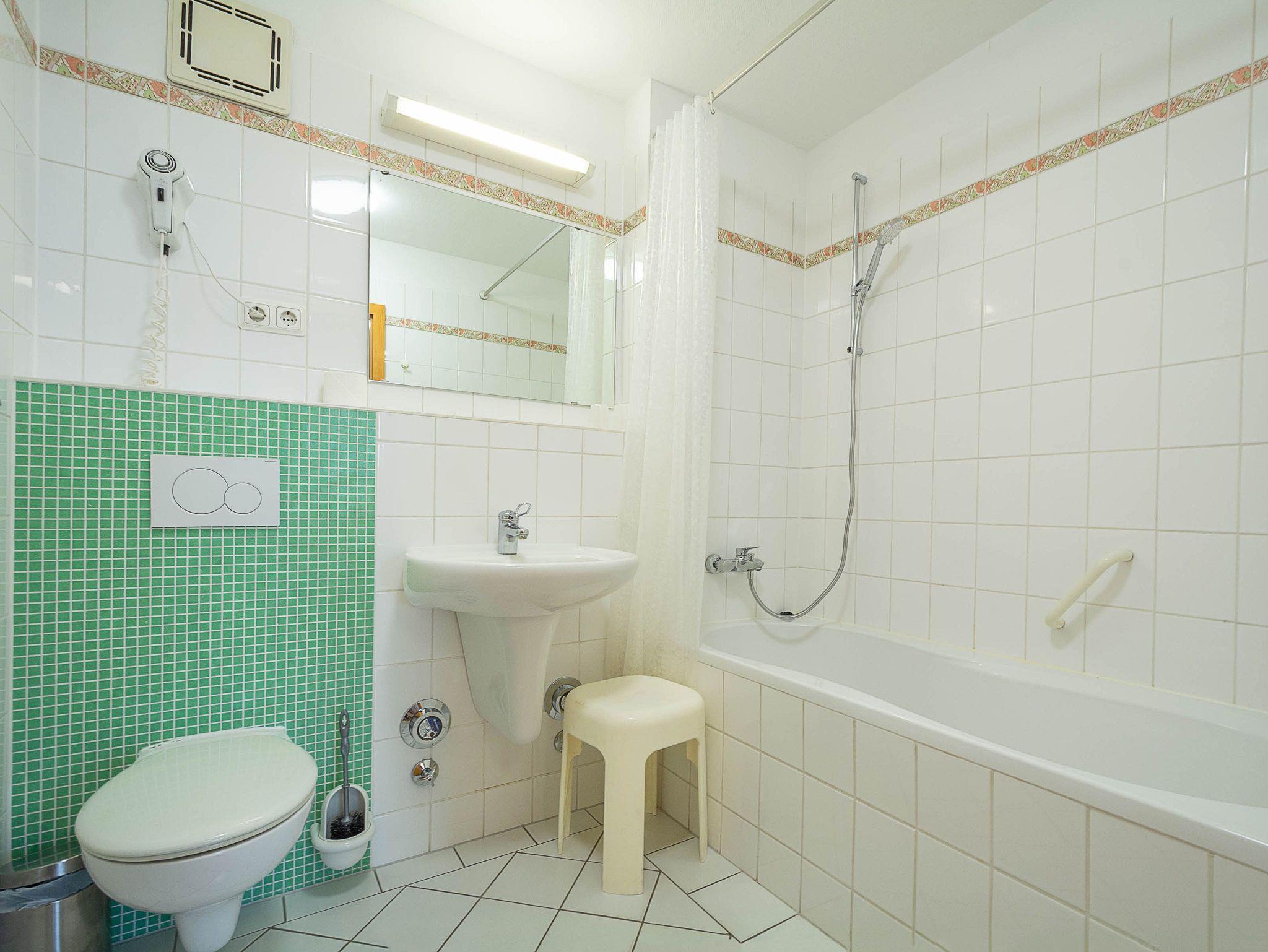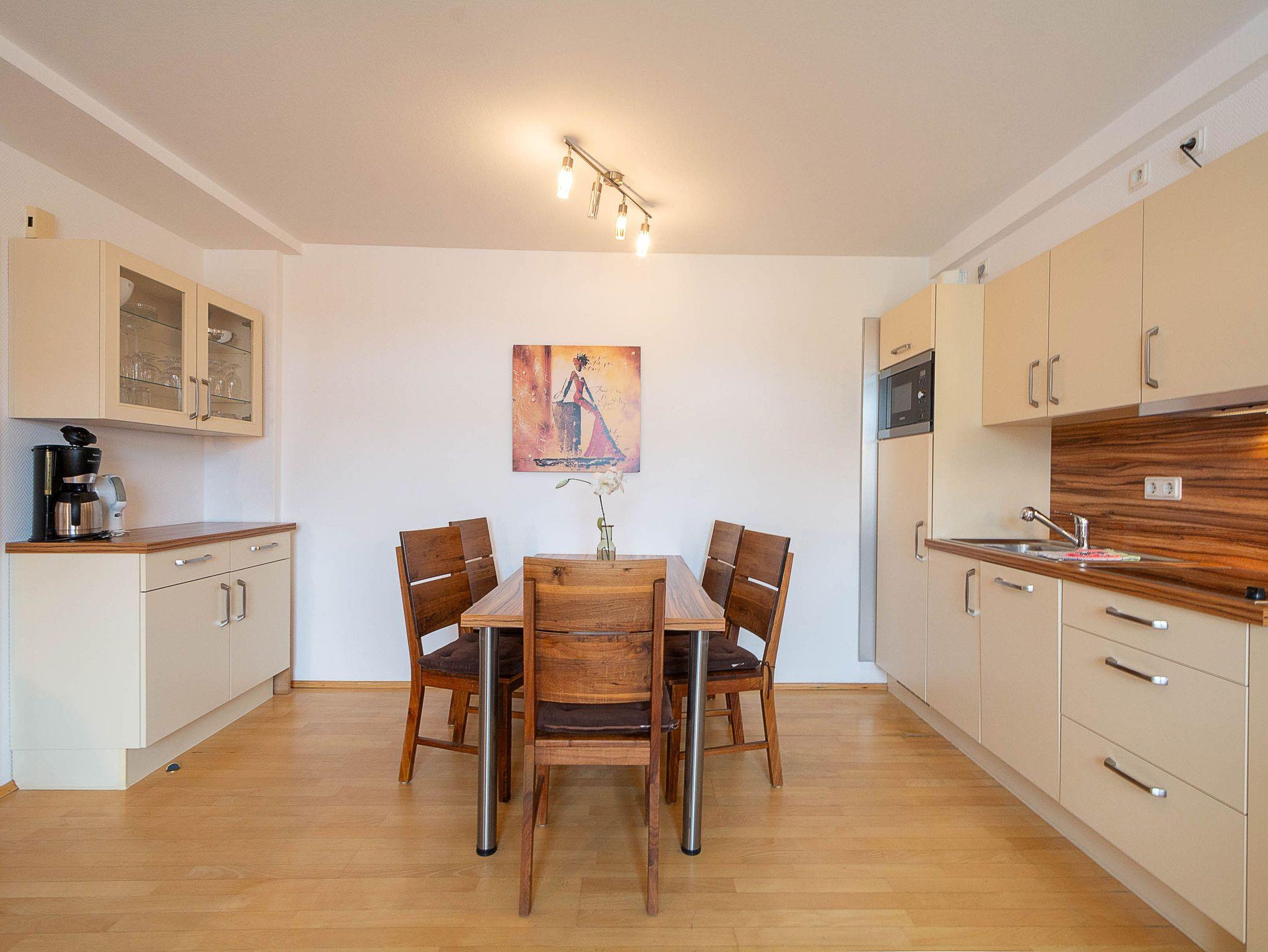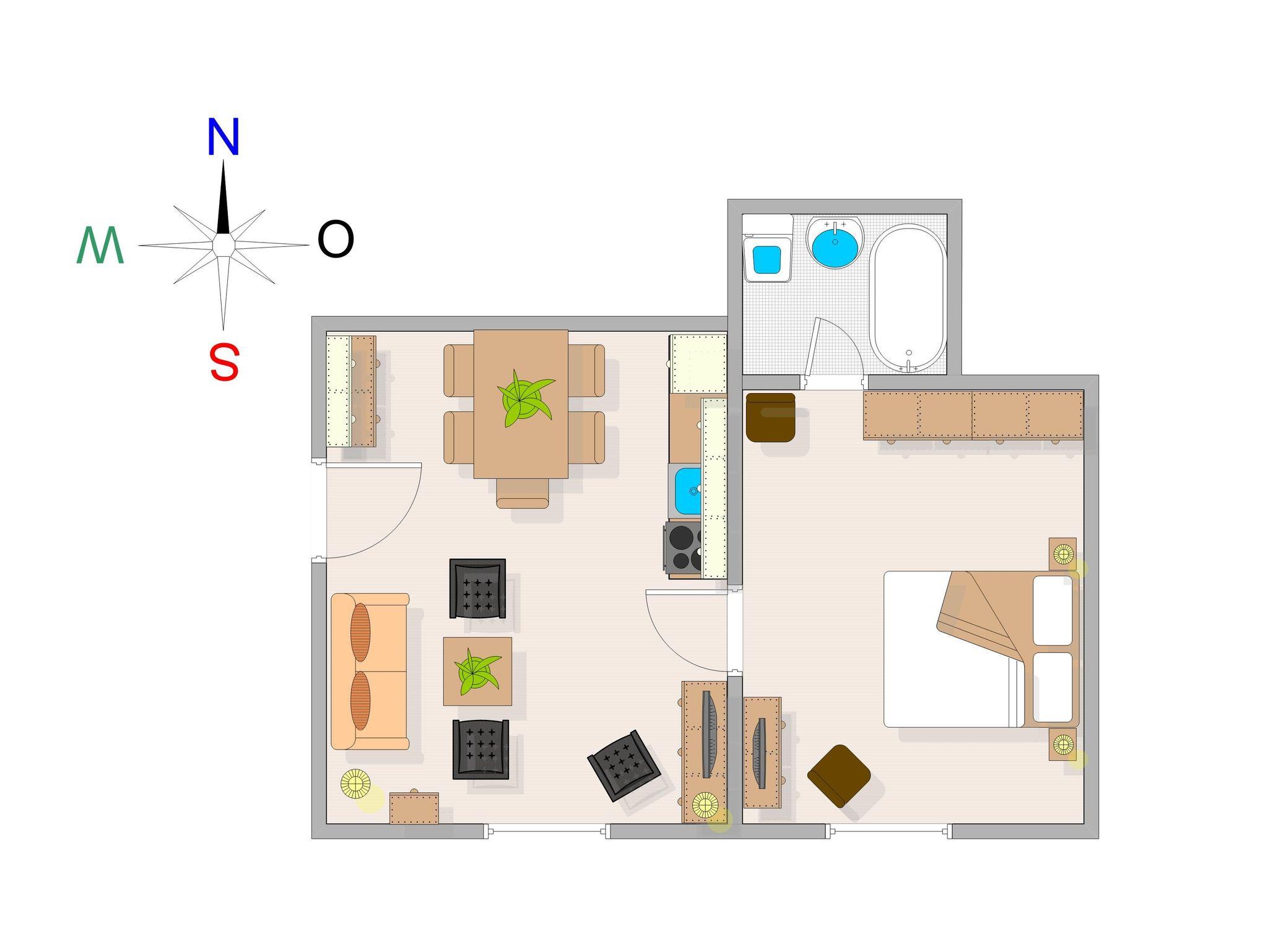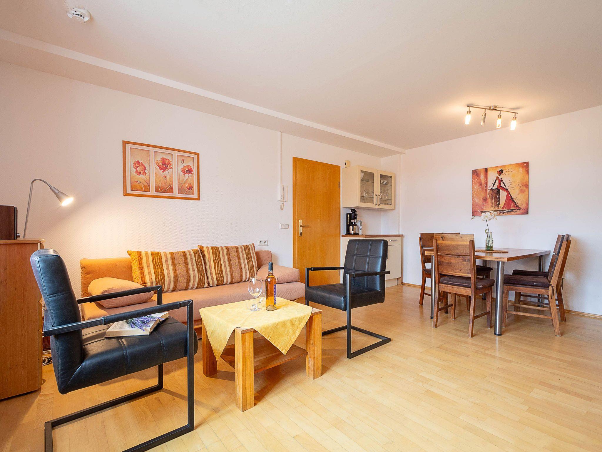 Sie wohnen in einer komfortabel eingerichteten 2-Raum-Wohnung von ca. 43 m² Größe, die im zweiten Obergeschoß liegt. Im Wohnzimmer befinden sich neben einer bequemen Sitzgruppe und dem Essplatz, Stereoanlage und TV-Gerät. Die Küchenzeile verfügt über 4-Platten-Herd (Ceran), Geschirrspüler, Kühlschrank mit Gefrierfach, Mikrowelle usw. Das Schlafzimmer ist ausgestattet mit einem Doppelbett, einem geräumigen Kleiderschrank und einem Flatscreen-TV. Vom Schlafzimmer gelangen Sie direkt in das Badezimmer. Das Badezimmer mit Wanne und WC und vervollständigen das Gesamtbild dieser Wohnung.