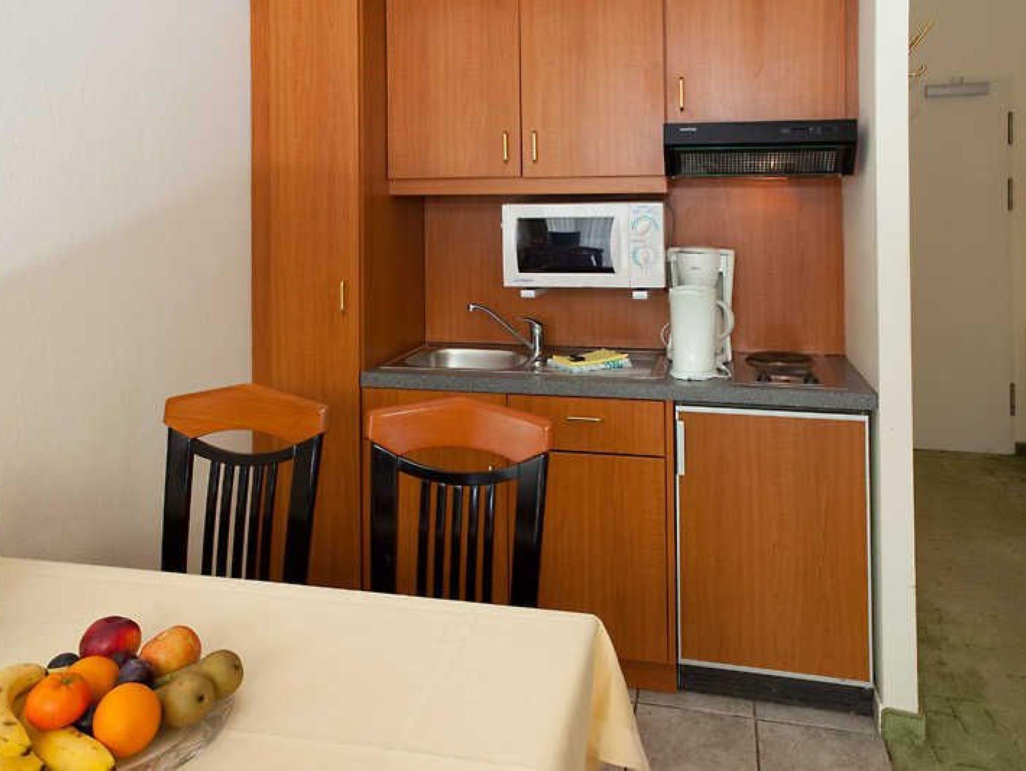 Die funktional gestaltete Ferienwohnung in der 1. Etage hat einen offenen Wohnbereich mit Küchenzeile und Essbereich, ein Schlafzimmer mit Doppelbett, ein Gästezimmer mit Einzelbett und einen Balkon. Die funktionale Küchenzeile ist mit 2-Platten-Kochfeld, Kühlschrank mit Gefrierfach, Mikrowelle, Kaffeemaschine, Toaster und div. Geschirr ausgestattet. Ein Bad mit Dusche, Waschbecken und WC komplettieren den guten Gesamteindruck der Wohnung.