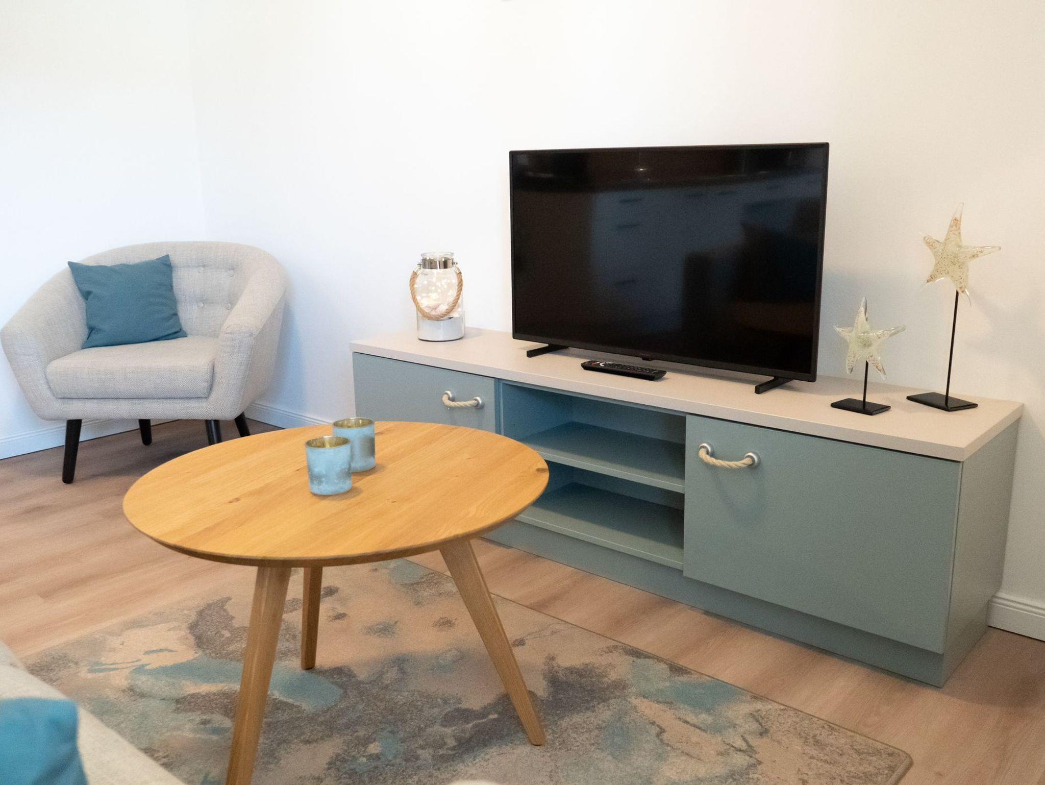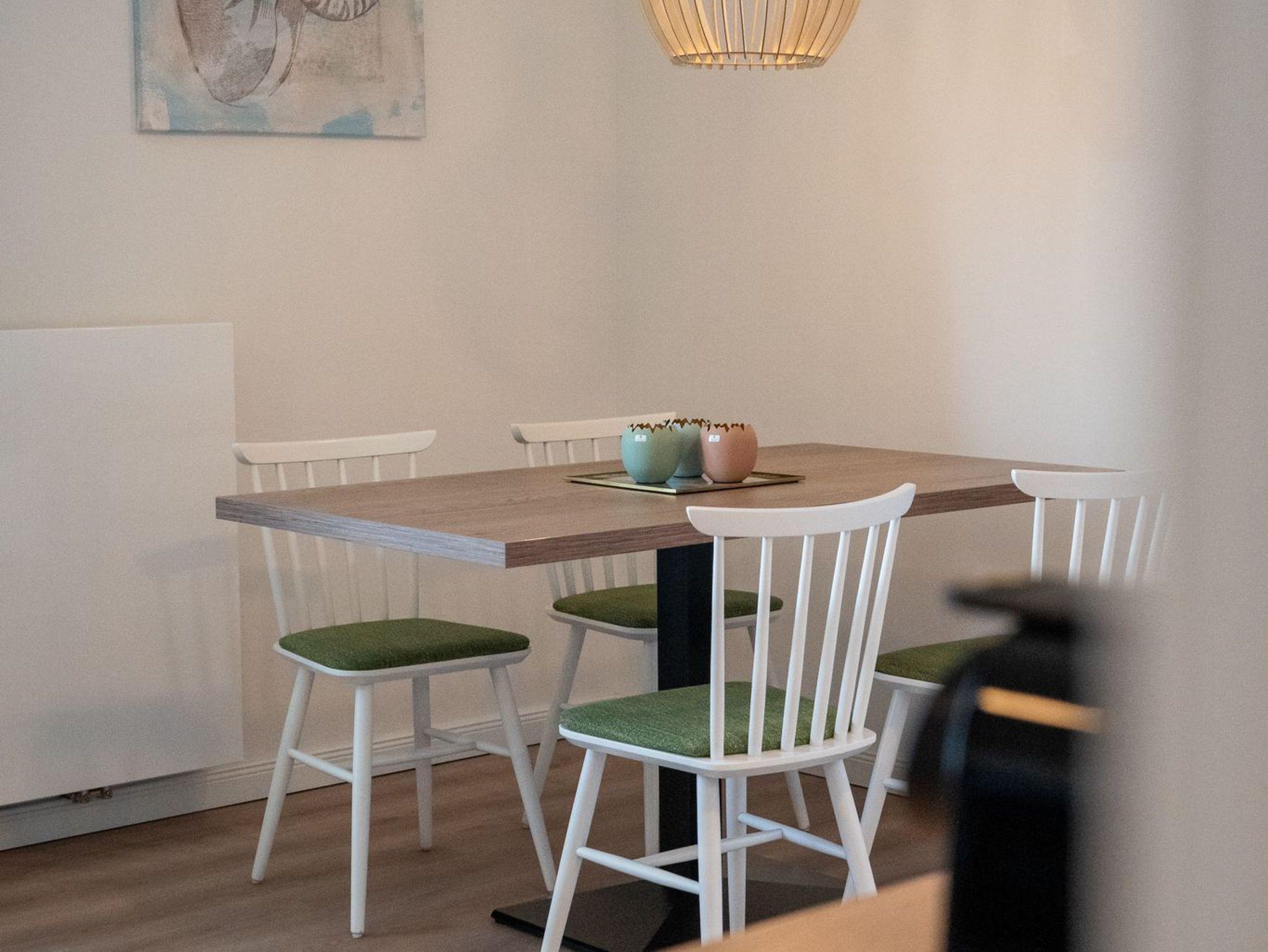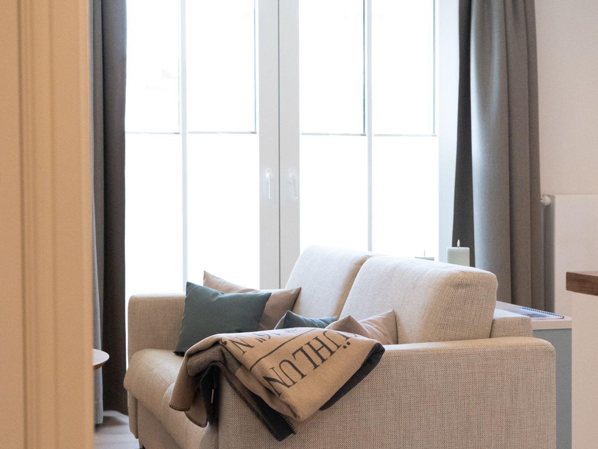 Zu Ihrem Apartment gehört ein großer und lichtdurchfluteter Wohn- und Essbereich mit offener Küche. Im Wohnraum befindet sich ein Sofa, welches mit einer Schlaffunktion ausgerüstet ist.
