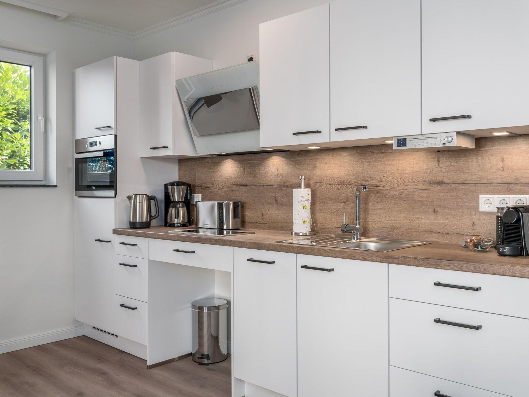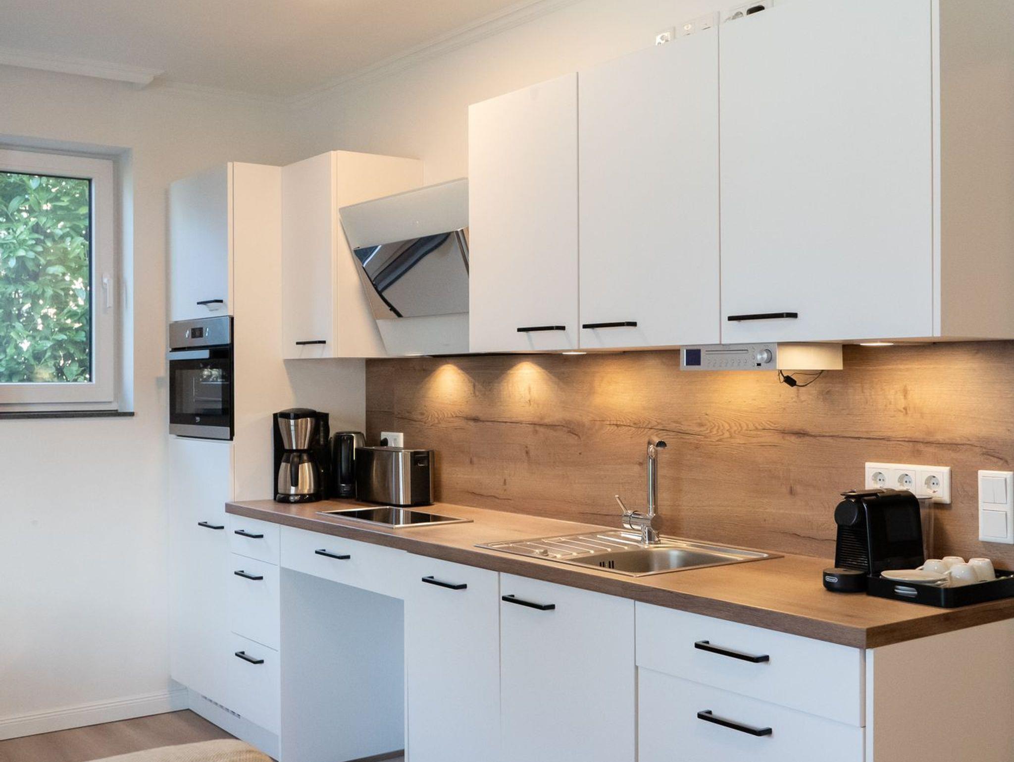 Die modern eingerichtete Küche ist sehr gut ausgestattet und verfügt über ein 2- Platten Glaskeramik-Kochfeld, Mikrowelle, Backofen, Kühlschrank mit Gefrierfach, Geschirrspüler, Wasserkocher, ein Küchenradio sowie Toaster. Eine Kaffeemaschine sowie eine Nespressomaschine sind ebenfalls vorhanden.