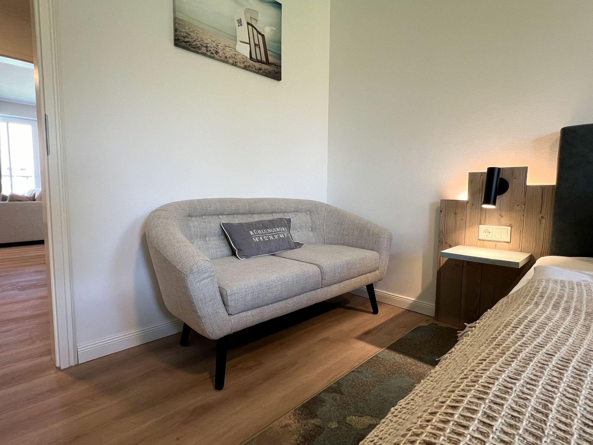 Das Schlafzimmer verfügt über ein 1,80 x 2,00 m Boxspringbett, ein TV-Gerät, einen Kleiderschrank mit ausreichend Ablageflächen und Safe sowie einen Kofferablageplatz.