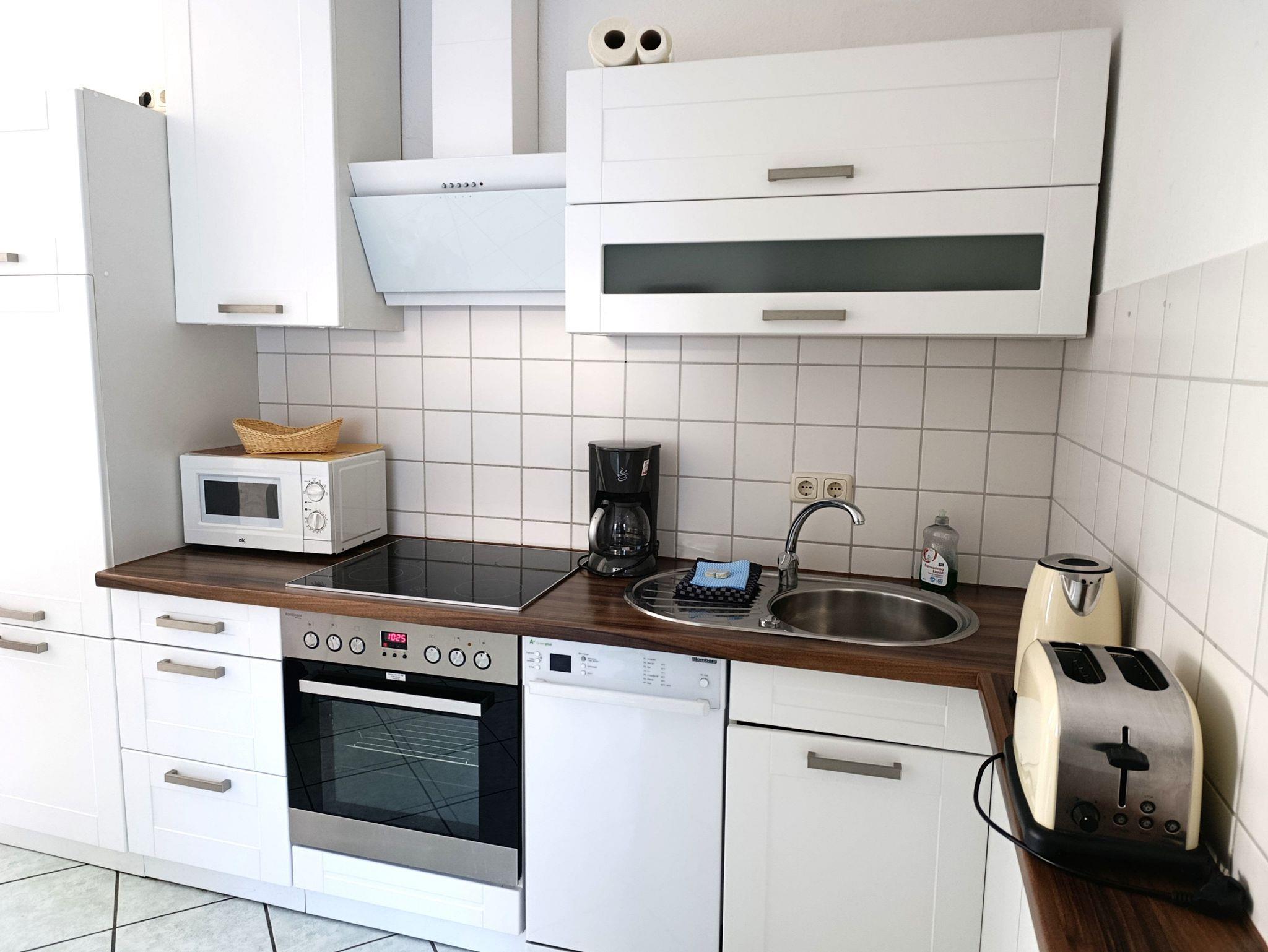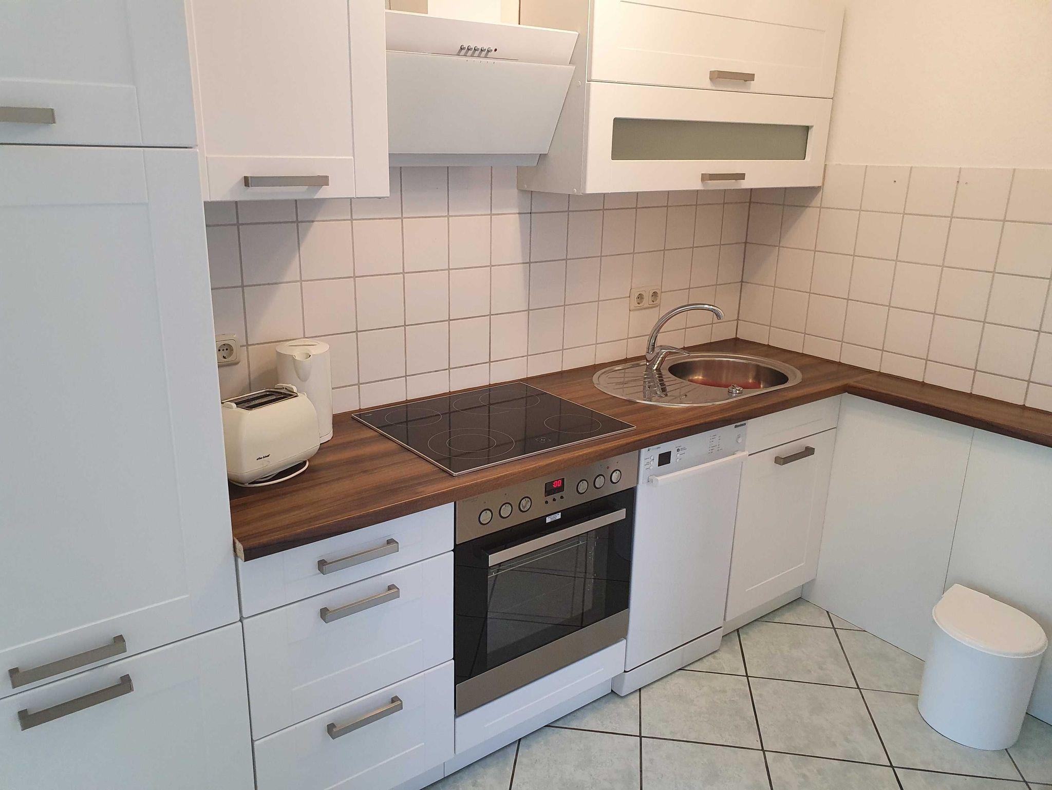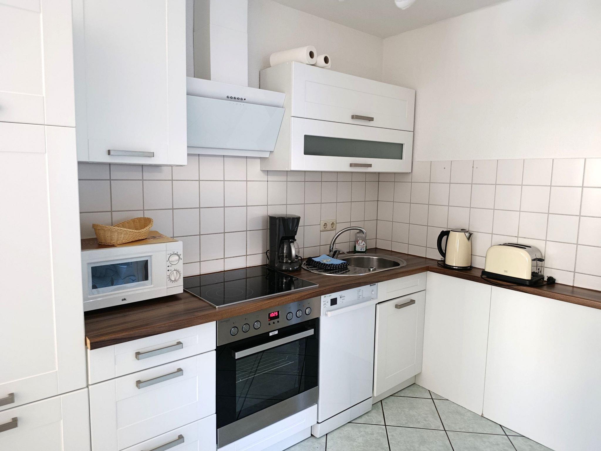 Die funktional gestaltete Ferienwohnung im Erdgeschoss hat einen offenen Wohnbereich mit Küchenzeile und Essbereich, ein Schlafzimmer mit Doppelbett, Nachtschränke und Kleiderschrank. Ein Gästezimmer mit einem Boxspringbett (140x200), Kleiderschrank und ein Tv. Die sehr funktionale Küchenzeile ist mit 4-Platten-Ceranfeld, Backofen, Kühlschrank, kleinen Gefrierschrank, Mikrowelle, Geschirrspüler, Kaffeemaschine und div. Geschirr ausgestattet. Ein Bad mit Fenster, Dusche, Waschbecken und WC komplettieren den guten Gesamteindruck der Wohnung.