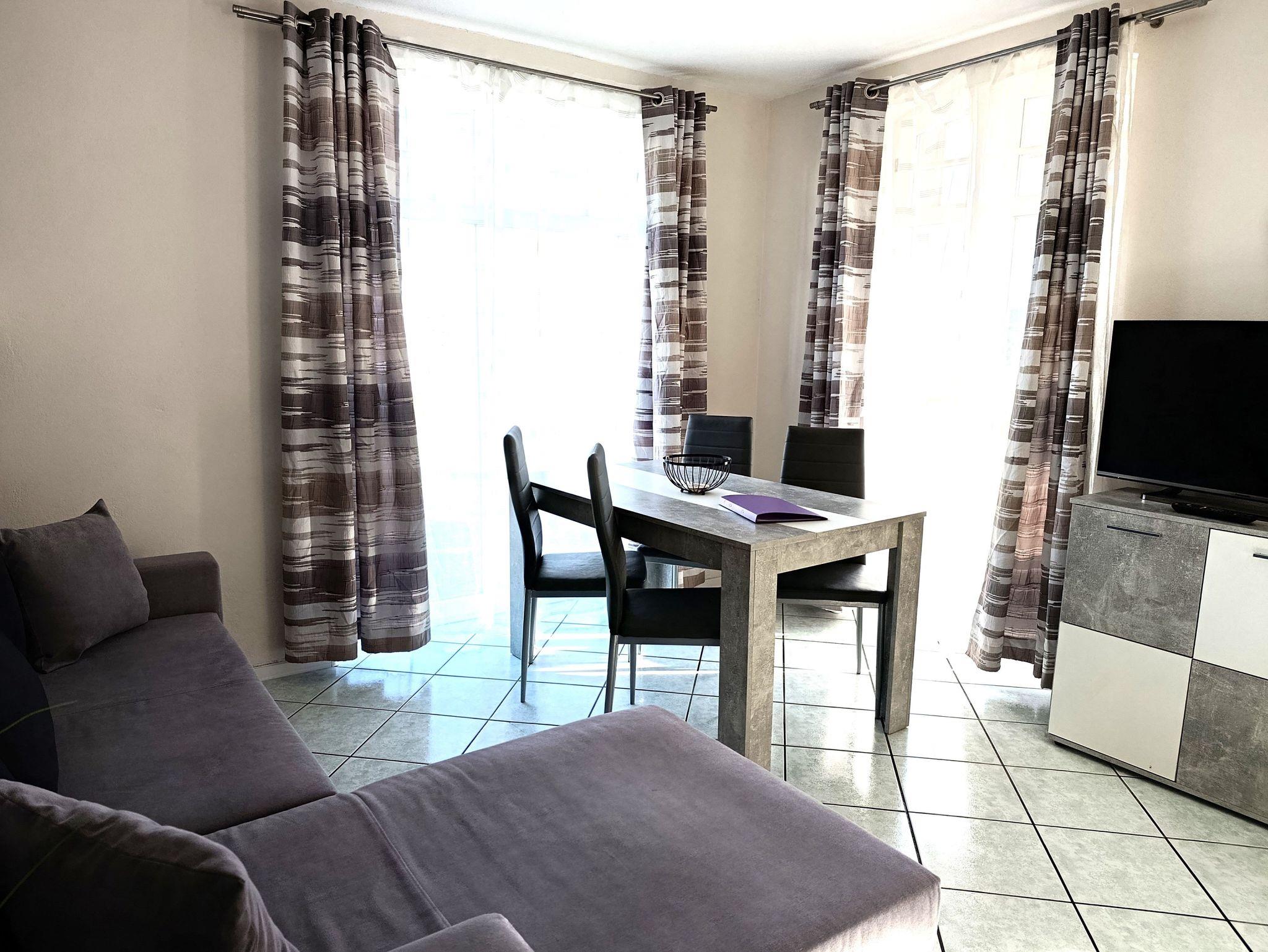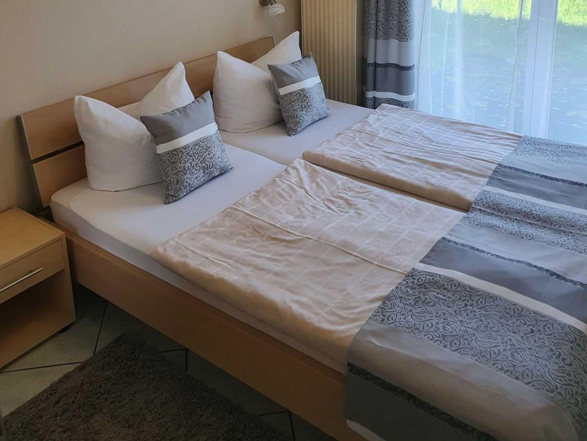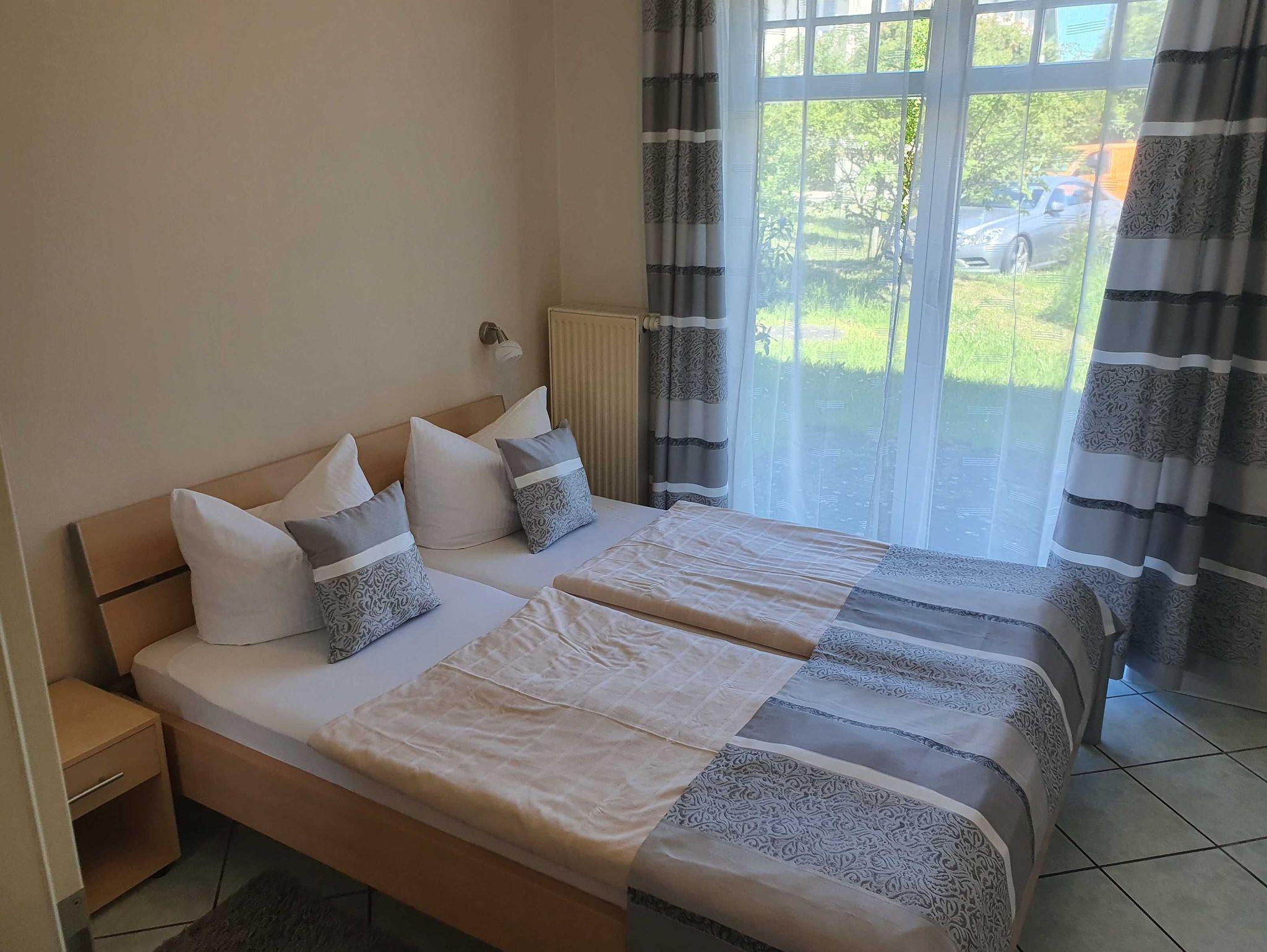 Die funktional gestaltete Ferienwohnung im Erdgeschoss hat einen offenen Wohnbereich mit Küchenzeile und Essbereich, ein Schlafzimmer mit Doppelbett, Nachtschränke und Kleiderschrank. Ein Gästezimmer mit einem Boxspringbett (140x200), Kleiderschrank und ein Tv. Die sehr funktionale Küchenzeile ist mit 4-Platten-Ceranfeld, Backofen, Kühlschrank, kleinen Gefrierschrank, Mikrowelle, Geschirrspüler, Kaffeemaschine und div. Geschirr ausgestattet. Ein Bad mit Fenster, Dusche, Waschbecken und WC komplettieren den guten Gesamteindruck der Wohnung.