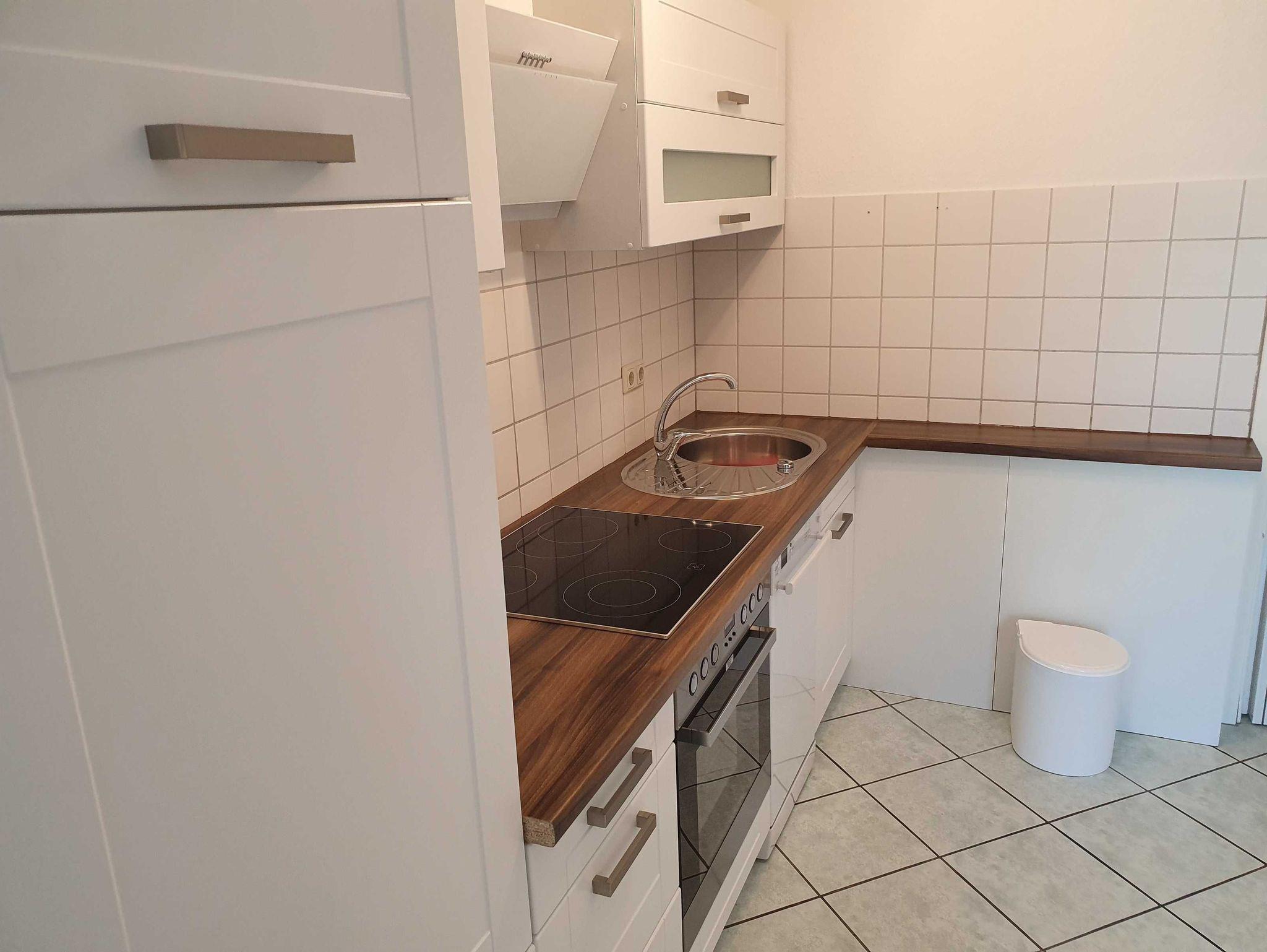 Küchezeile mit Mikrowelle, 4-Platten-Ceran-Herd, Kühlschrank, kleiner Gefrierschrank, Geschirrspüler und Kaffeemaschine