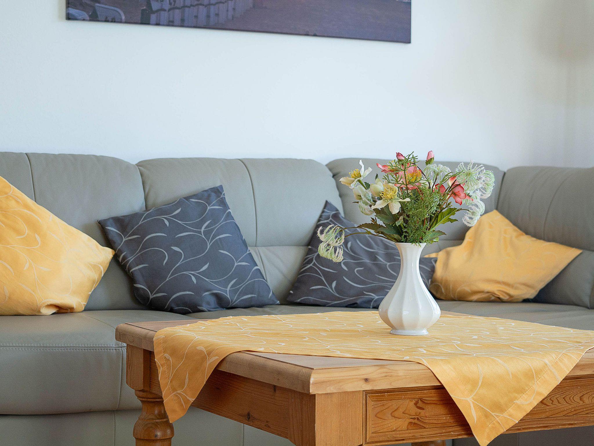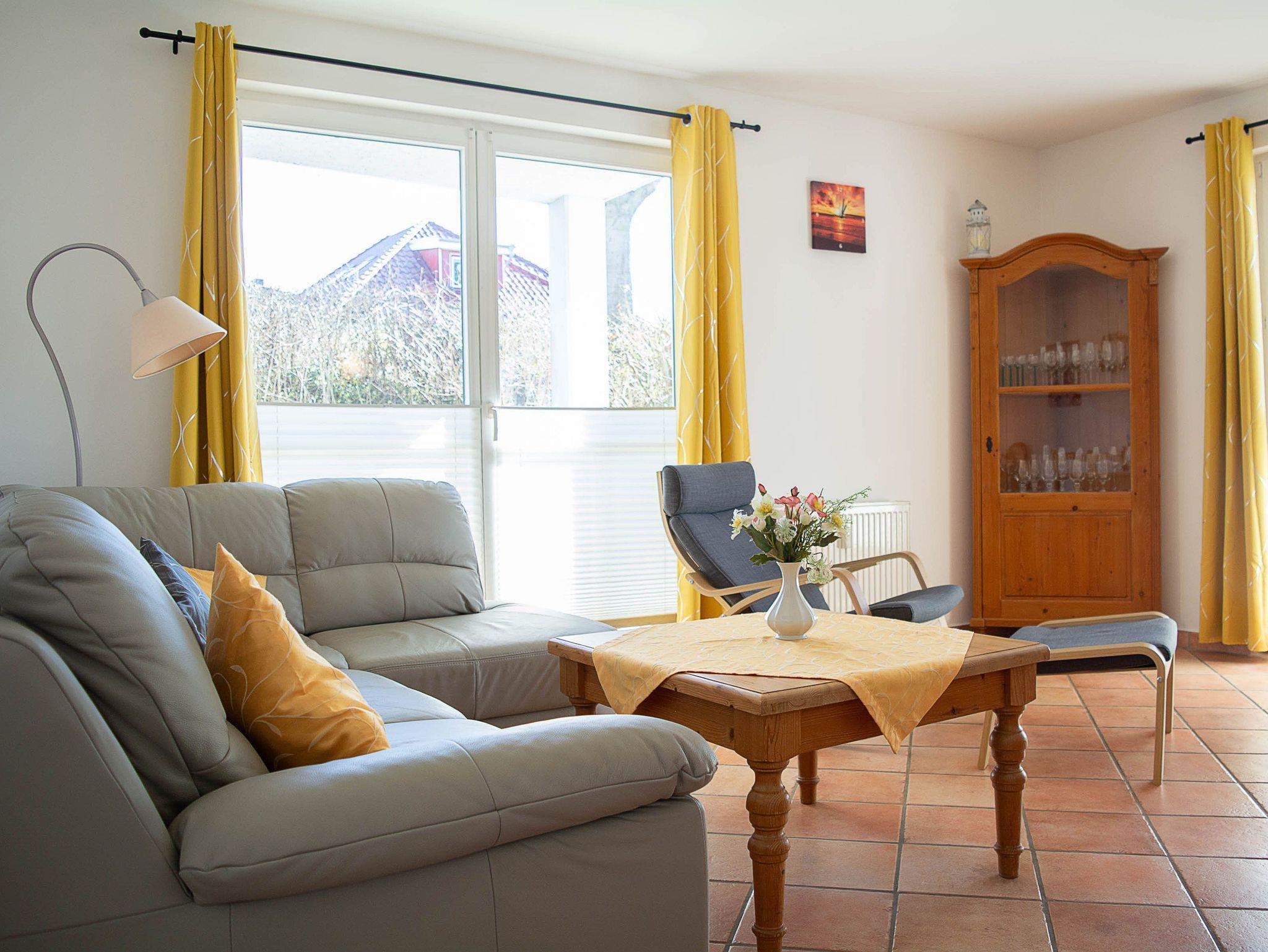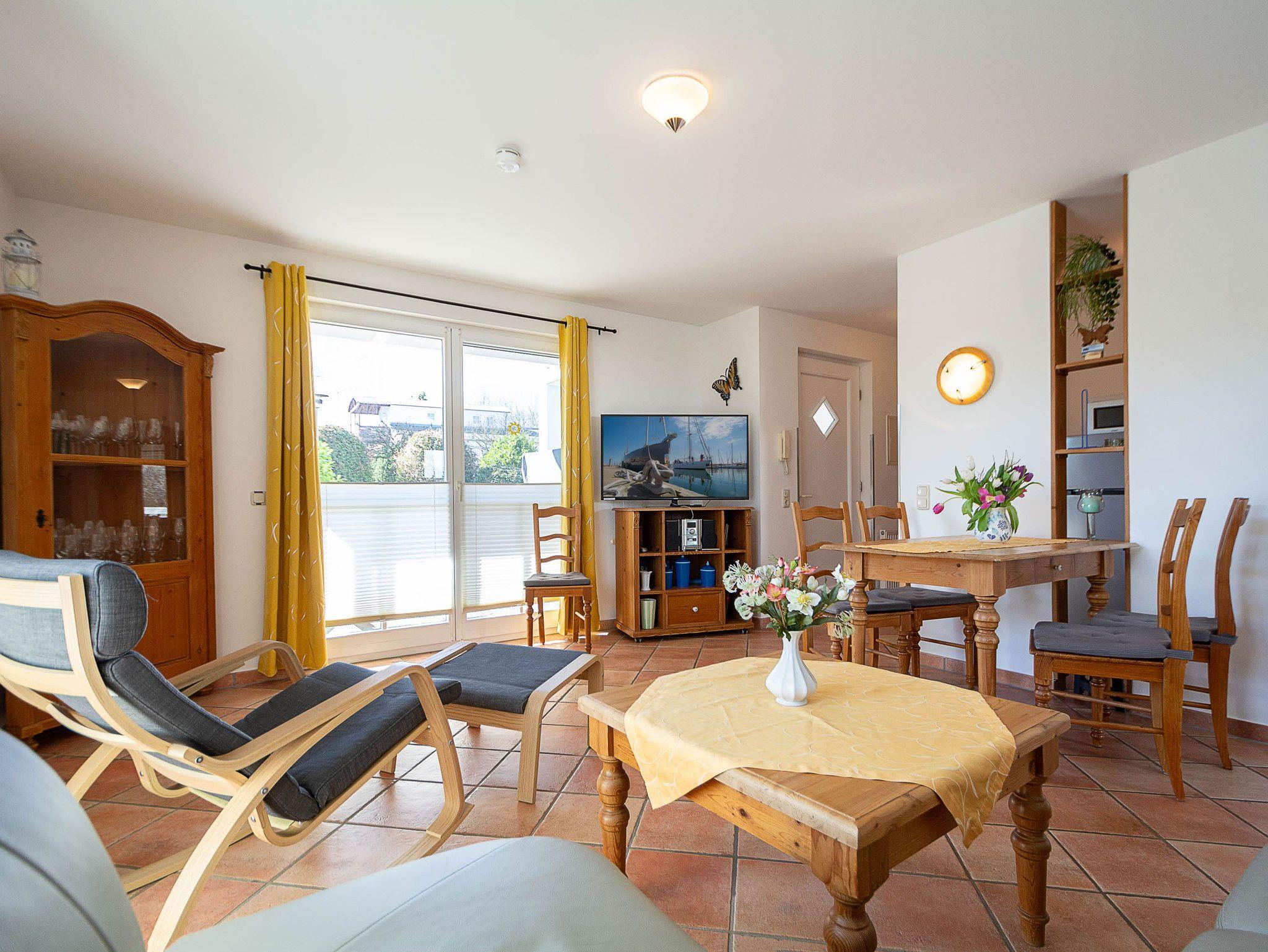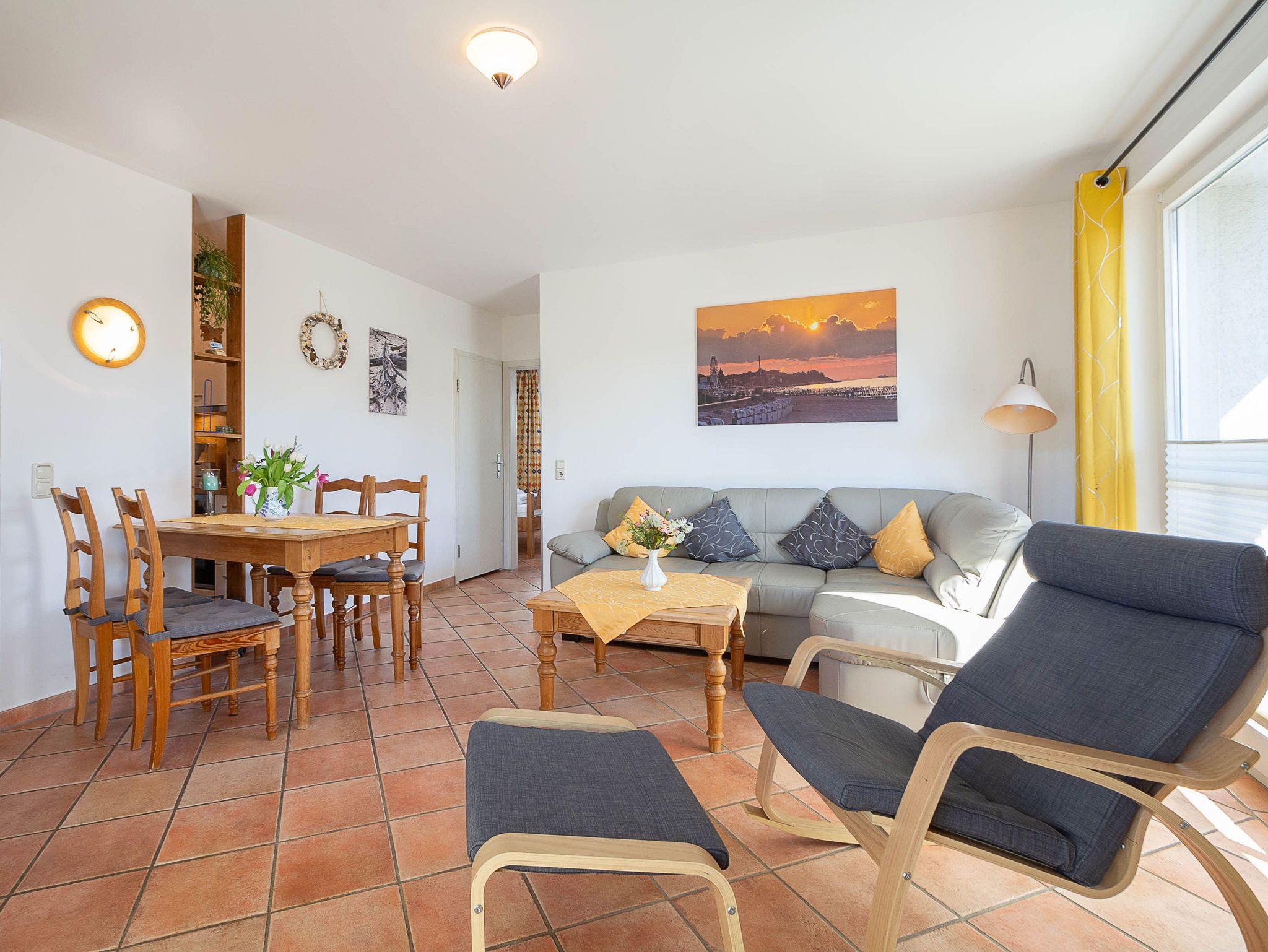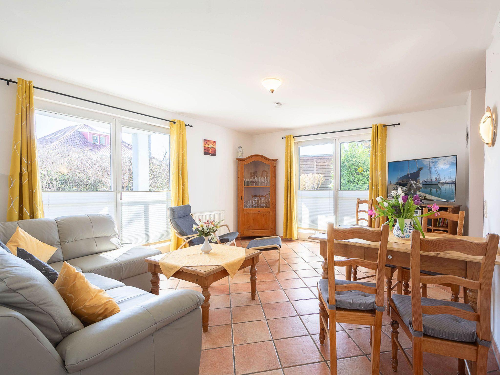 Der freundliche Wohnbereich ist mit einer gemütlichen Couch und Sessel, Flatscreen-TV und einer Musikanlage ausgestattet. Um keine Langeweile aufkommen zu lassen gibt es eine kleine Urlaubs(Tausch)bibliothek und Gesellschaftsspiele. Im angrenzenden Essbereich haben Sie reichlich Platz für gemeinsame Mahlzeiten.