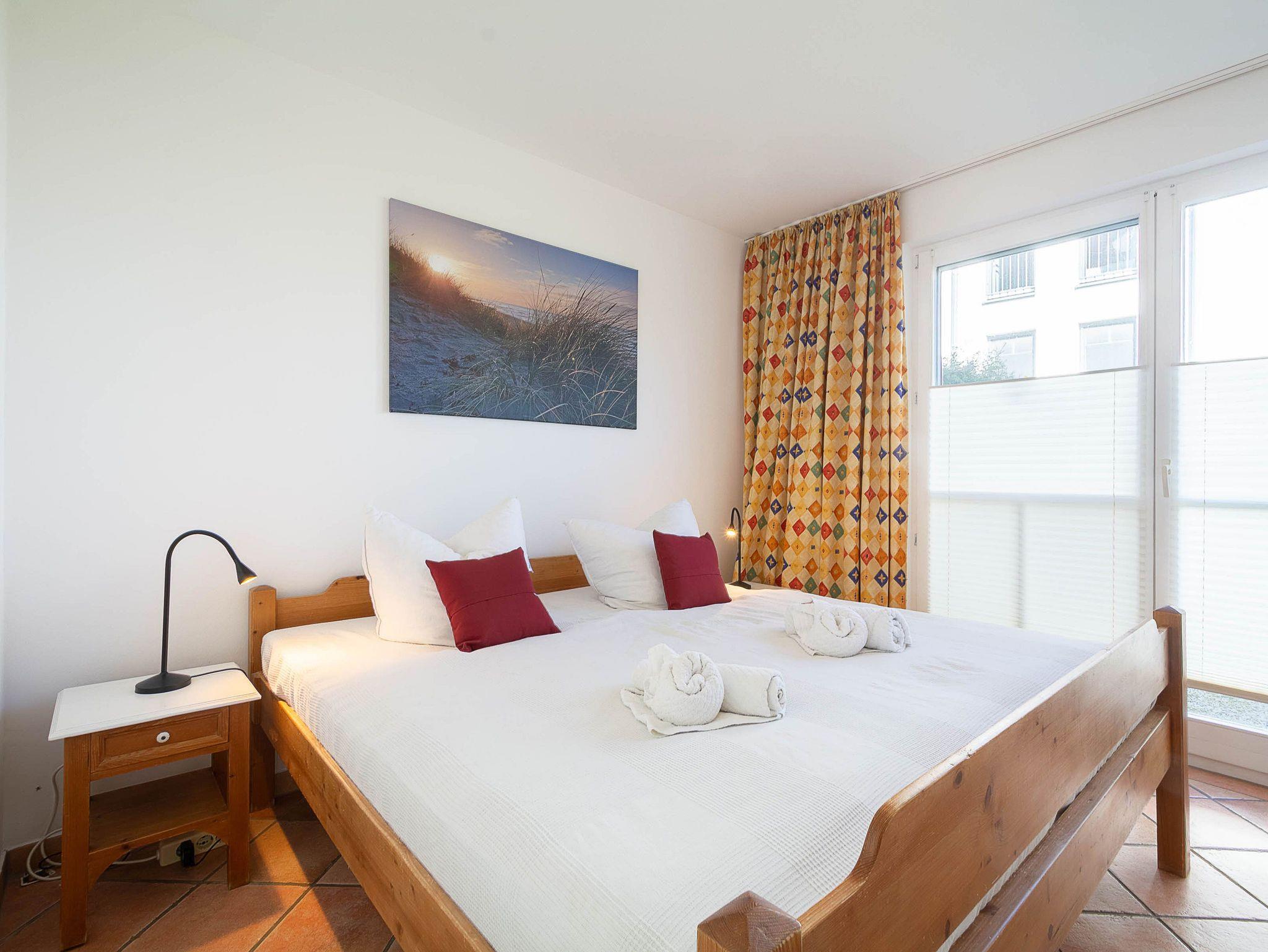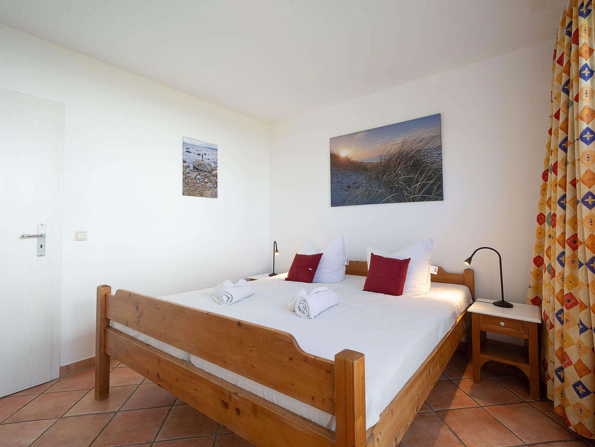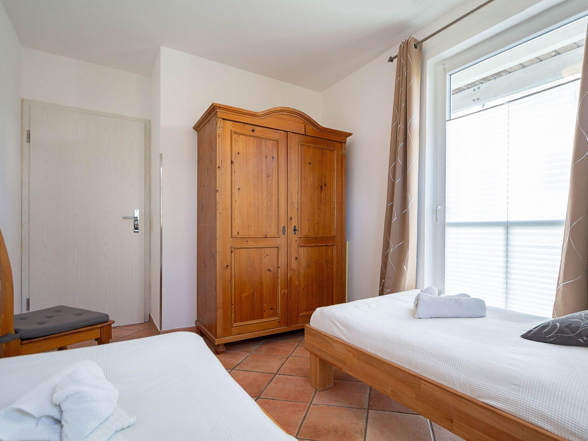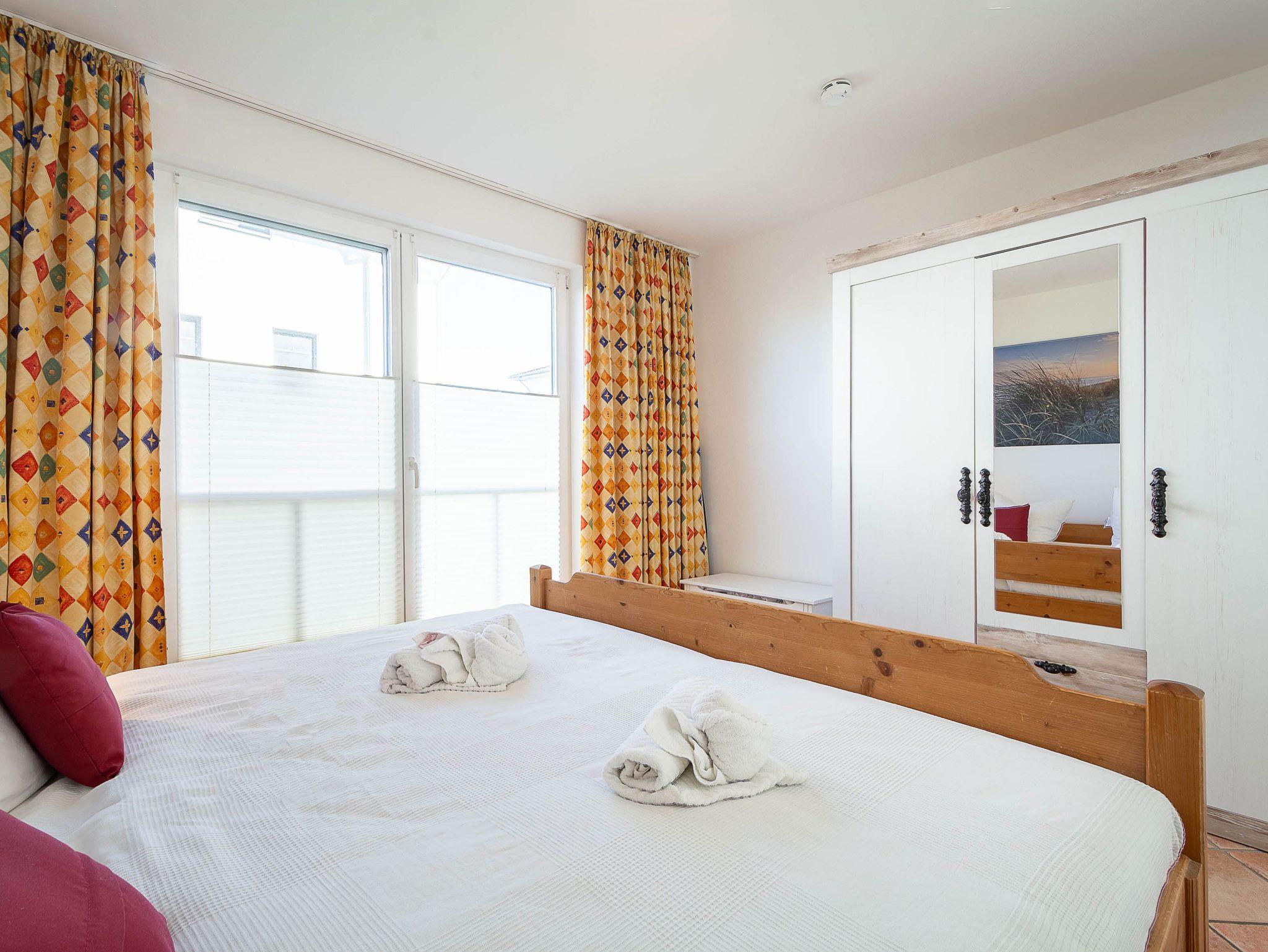 Im großen Schlafzimmer lädt Sie ein komfortables Doppelbett (2 x 90 x 200 cm) zur Nachtruhe ein. Der großzügige Kleiderschrank im Landhausstil mit Ganzkörperspiegel bietet ausreichend Platz für Ihre Urlaubsgarderobe. Von hier können Sie die schöne Rundum-Terrase von der Nordseite aus betreten. Im kleinen Schlafzimmer, das ebenfalls einen Zugang zur Nord-Terrasse bietet, befinden sich zwei Einzelbettenn (je 90 cm x 200 cm), die Sie auch unkompliziert zusammen stellen können. Als Sichtschutz bzw. zum Verdunkeln sind im Schlafzimmer und im Wohnbereich Plissees und Vorhänge an den Fenstern angebracht.
