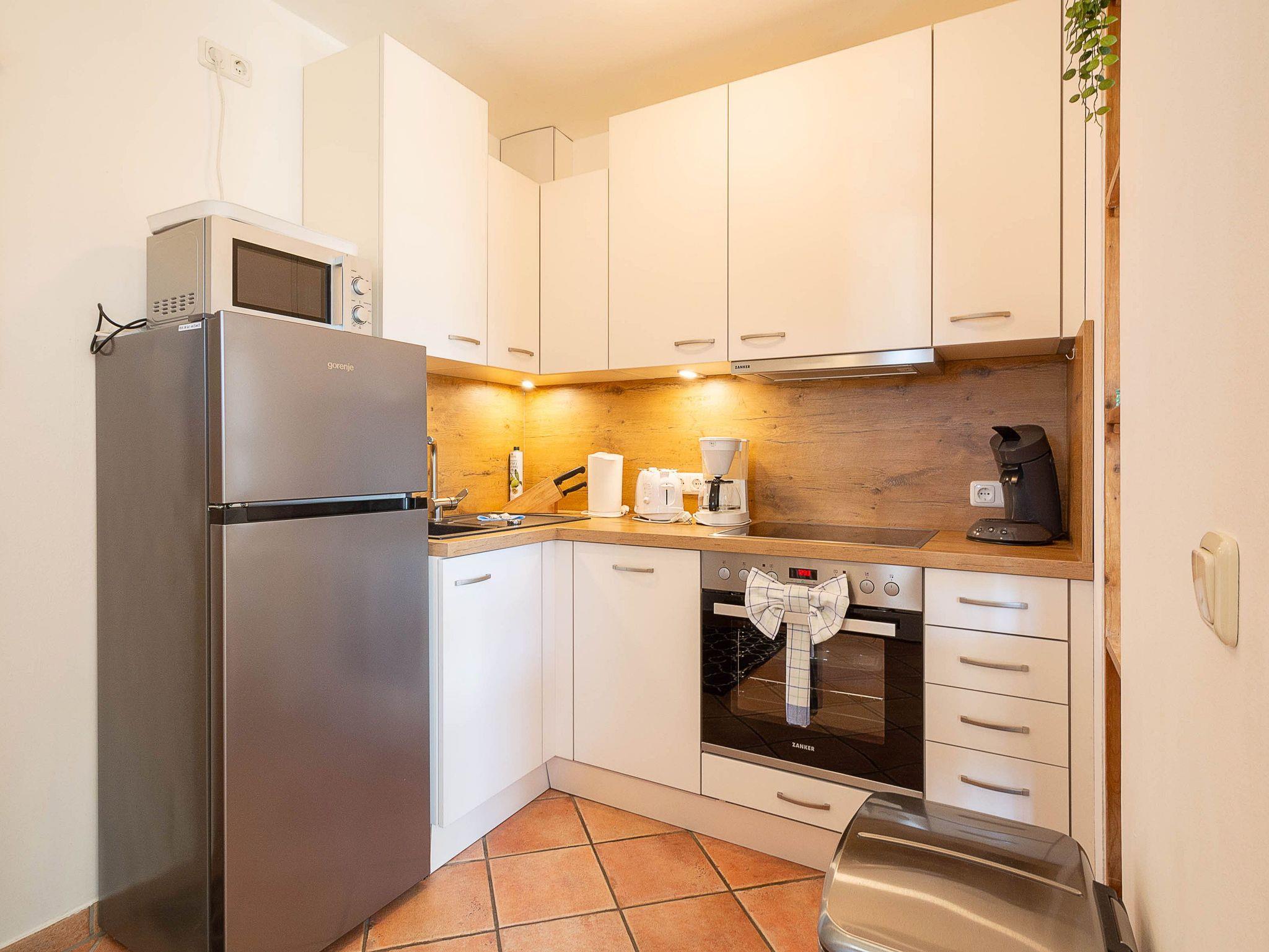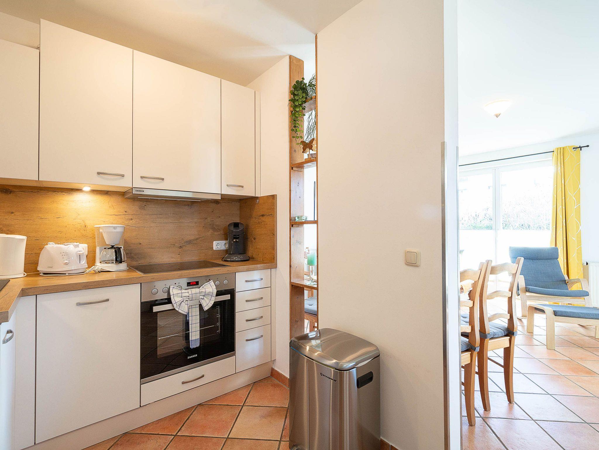 Die modernen im Landhausstil eingerichtete Küchenzeile ist separiert vom Wohnbereich und hält für Sie alle wichtigen Küchengeräte und -utensilien bereit, die Sie für Ihr perfektes Dinner benötigen: Ein 4-Zonen-Cerankochfeld, ein Backofen, ein Geschirrspüler sowie ein Kühl-Gefrier-Kombination befinden sich in der Küche. Eine Kaffeemaschine und eine Senseo-Kaffepad-Maschine, ein Wasserkocher, ein Toaster, ein elektrischer Mixer und ein Pürierstab sowie genügend Koch- und Essgeschirr komplettieren die Küchenausstattung.