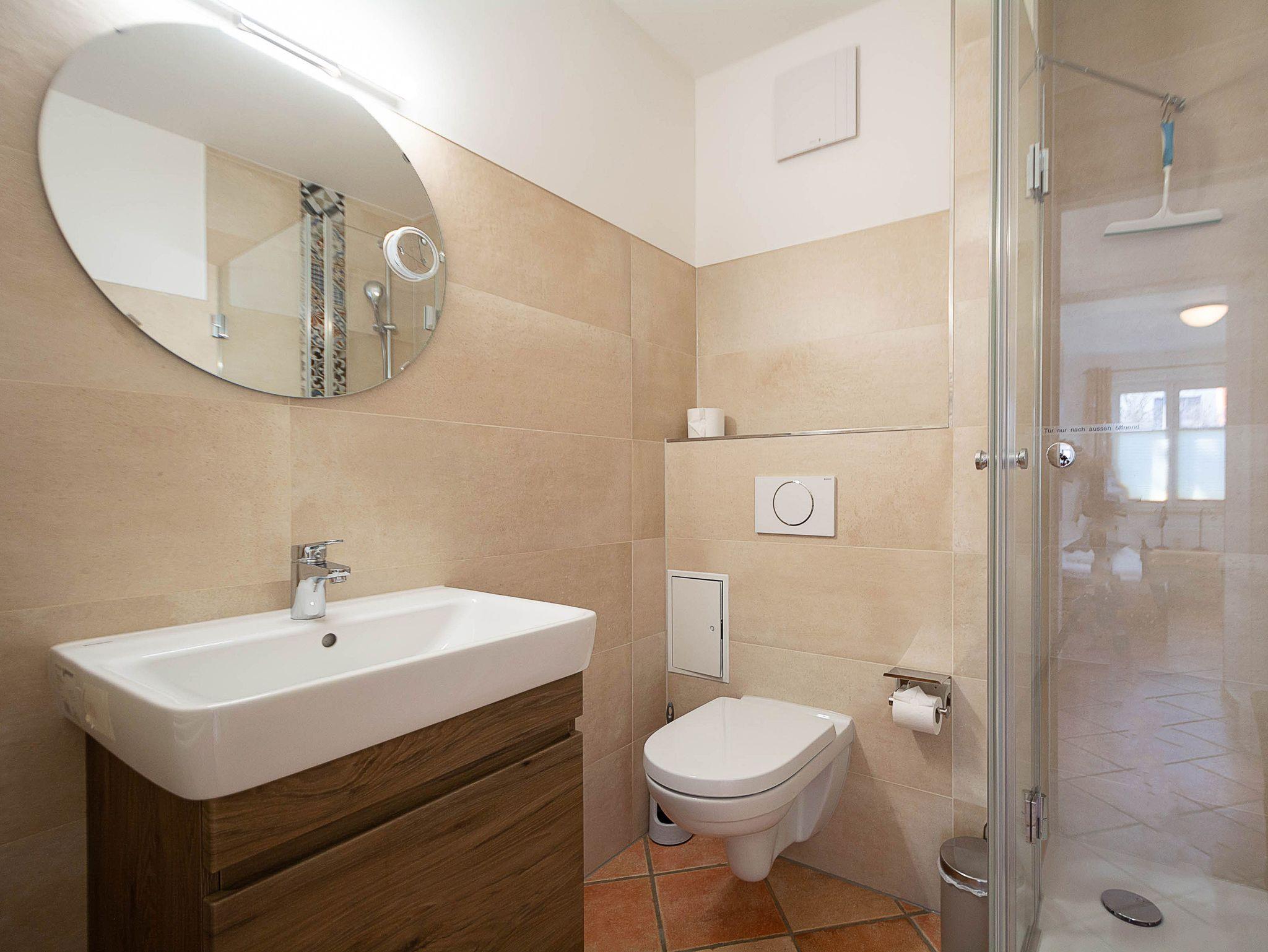 Das modern geflieste Bad ist mit einer Duschkabine mit niedrigem Einstieg, Waschbecken und WC eingerichtet. Ein Föhn und ein Kosmetikspiegel sowie genügend Ablagefläche für Ihre Badutensilien vervollständigen die Badeinrichtung.