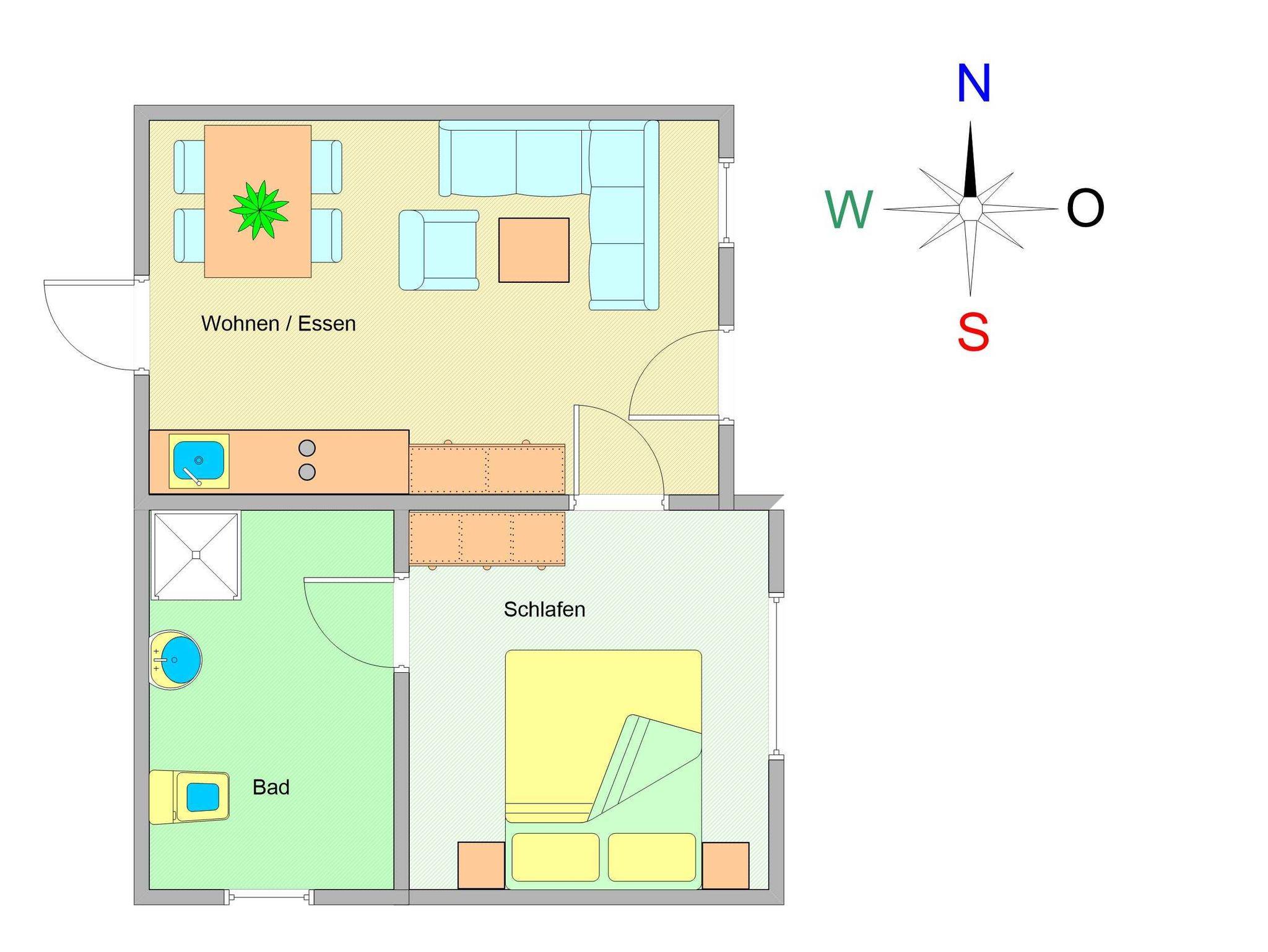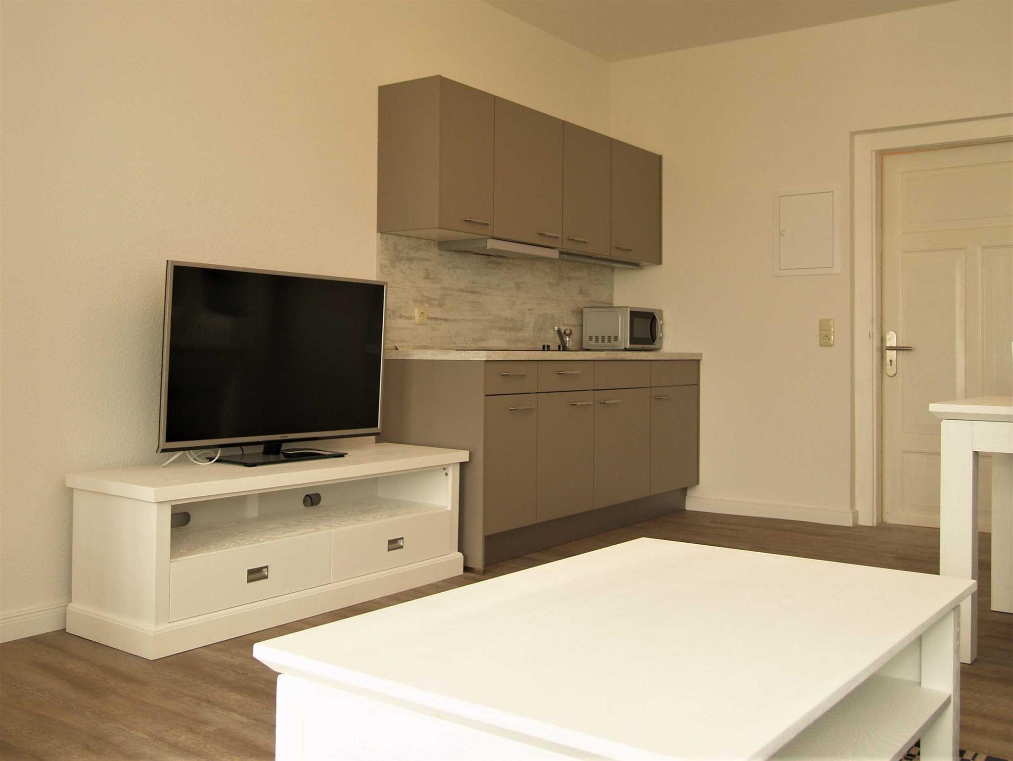 Sie wohnen in einer modern eingerichteten 2-Raum-Ferienwohnung von ca. 45 m² Größe, die sich im zweiten Obergeschoss befindet. Der Wohnraum ist ausgestattet mit Schlafcouch, TV, Essplatz und Küchenzeile (2-Platten-Cerankochfeld, Kühlschrank mit Gefrierfach, Kaffeemaschine, Toaster). Von hier betreten Sie das Schlafzimmer, welches mit Doppelbett und Kleiderschrank eingerichtet wurde. Das moderne geflieste Tageslichtbad verfügt über eine bodengleiche Dusche, WC und genügend Ablagefläche für Ihre Badutensilien.
