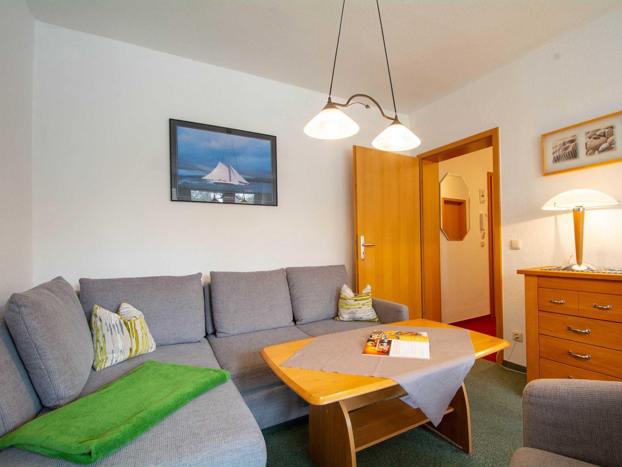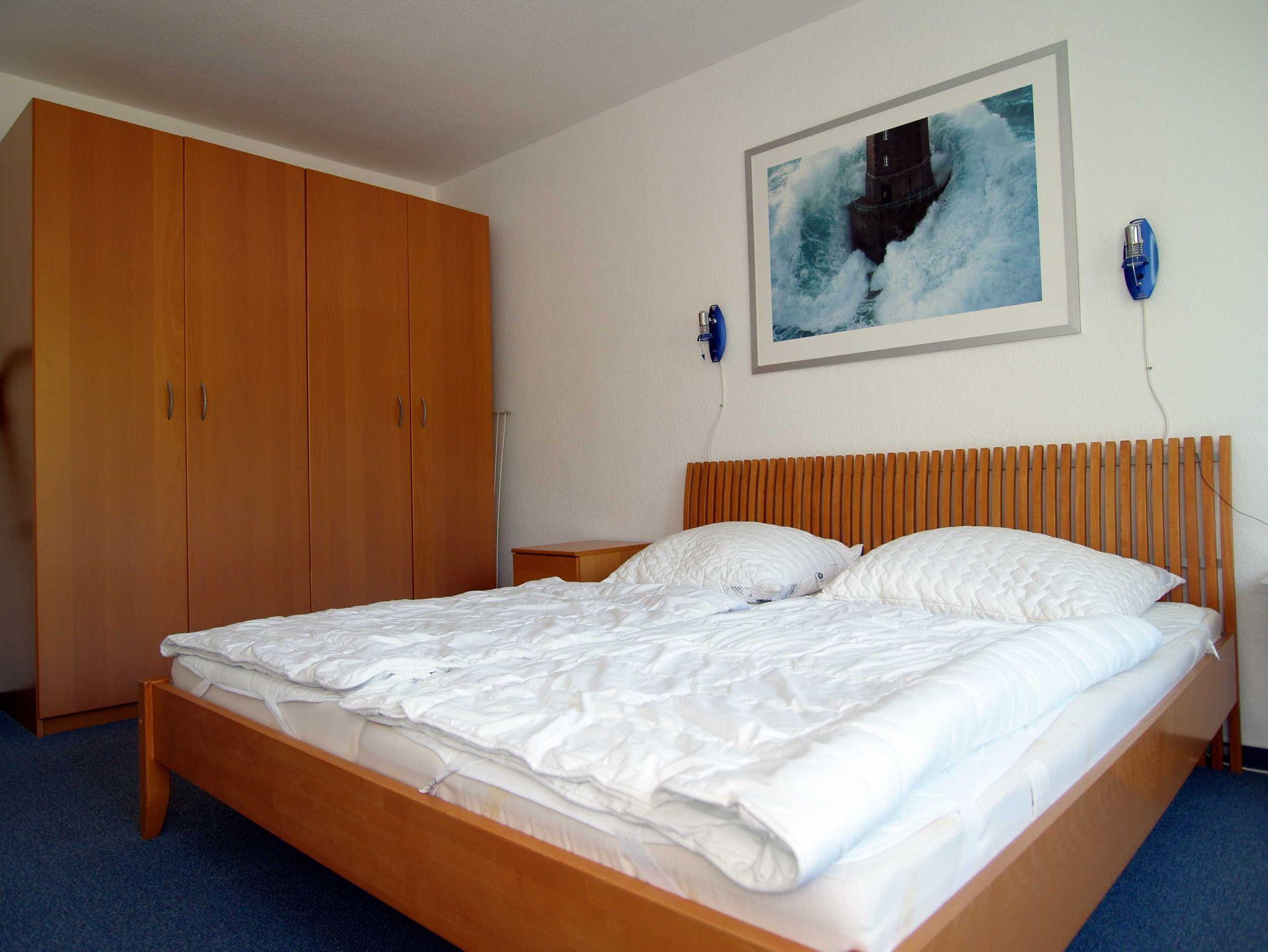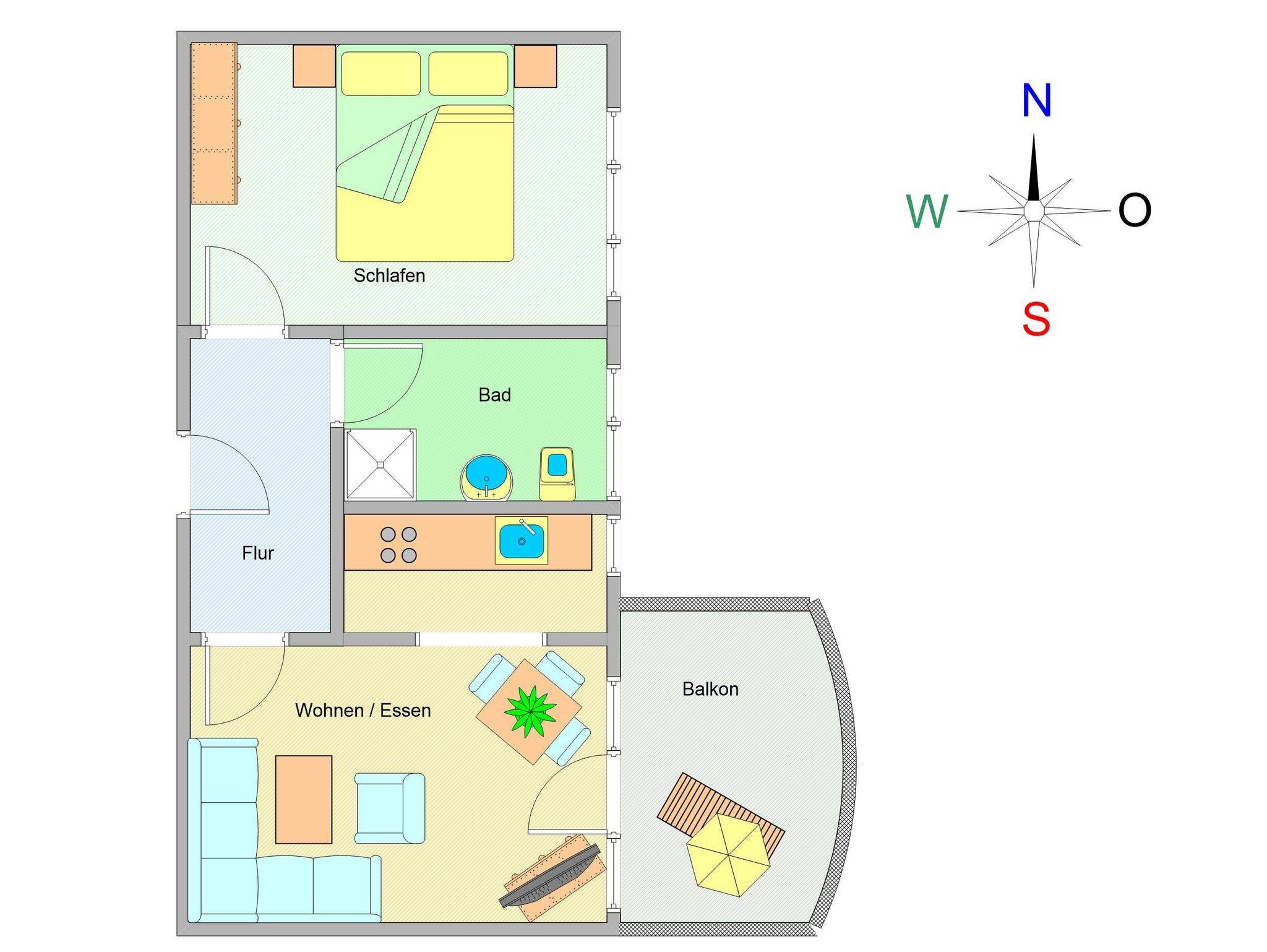 Sie wohnen in einer ca. 50m² großen 2-Raum-Wohnung, die sich im 2. Obergeschoss befindet. Der Wohnraum ist ausgestattet mit Schlafcouch, TV, Radio, Essplatz und Küchenzeile (4-Platten-Kochfeld mit Backofen, Geschirrspüler, Kühlschrank, Kaffeemaschine, Wasserkocher, Toaster). Vom Wohnraum betreten Sie den möblierten Balkon, der nach Osten ausgerichtet ist und zum Frühstück in der Morgensonne einlädt. Der Schlafraum mit Doppelbett sowie das Bad mit Dusche und WC vervollständigen das Gesamtbild dieser Wohnung.