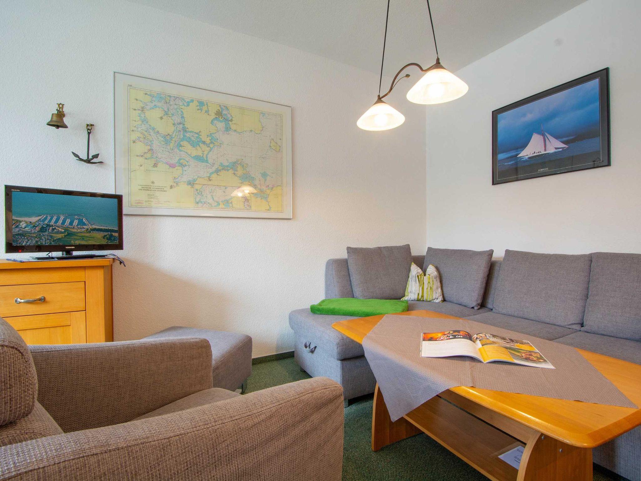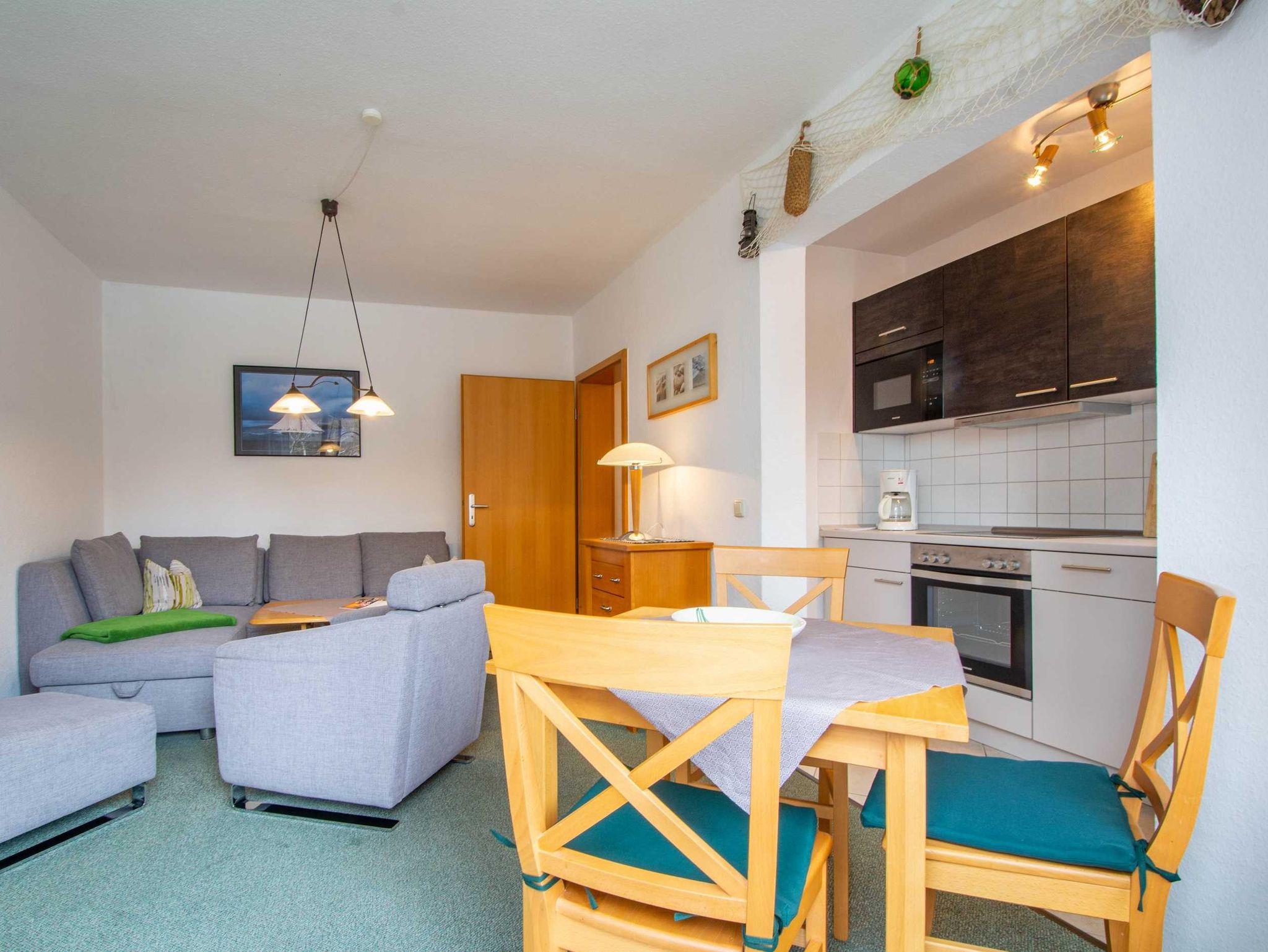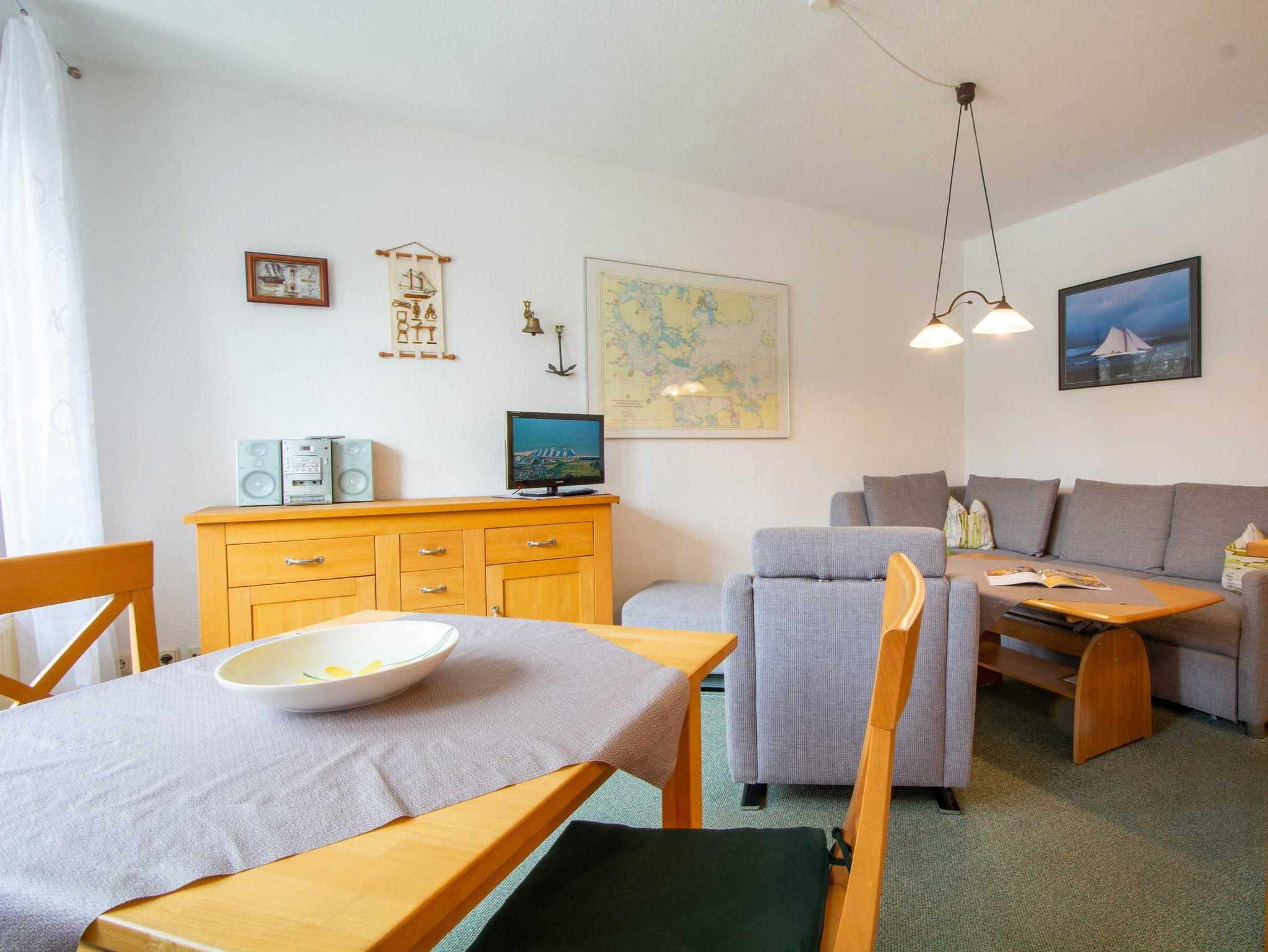 Sie wohnen in einer ca. 50m² großen 2-Raum-Wohnung, die sich im 2. Obergeschoss befindet. Der Wohnraum ist ausgestattet mit Schlafcouch, TV, Radio, Essplatz und Küchenzeile (4-Platten-Kochfeld mit Backofen, Geschirrspüler, Kühlschrank, Kaffeemaschine, Wasserkocher, Toaster). Vom Wohnraum betreten Sie den möblierten Balkon, der nach Osten ausgerichtet ist und zum Frühstück in der Morgensonne einlädt. Der Schlafraum mit Doppelbett sowie das Bad mit Dusche und WC vervollständigen das Gesamtbild dieser Wohnung.