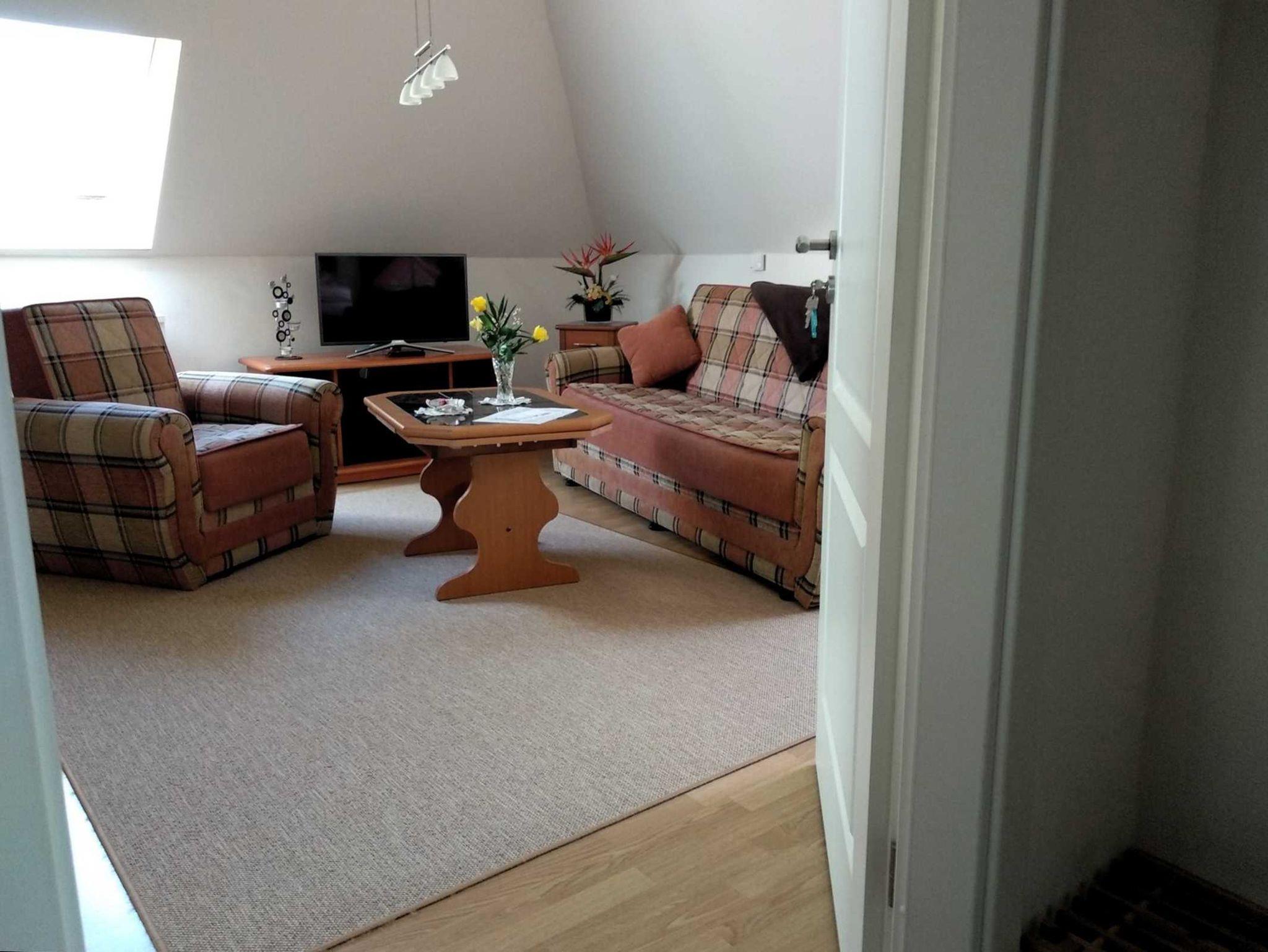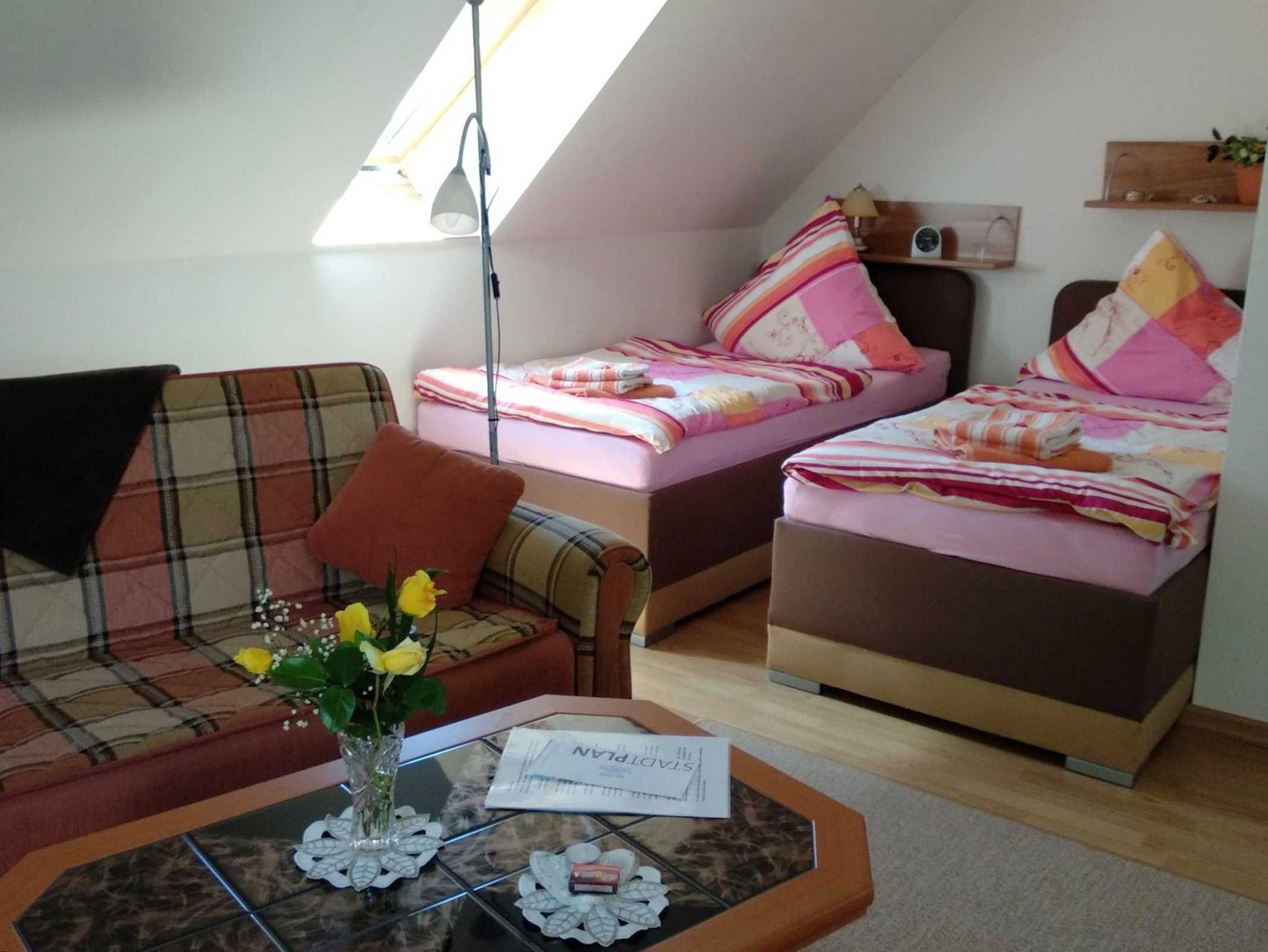 Die Ferienwohnung Morgensonne befindet sich im Dachgeschoss des Hauses und besteht aus einem kombinierten Wohn- Schlafzimmer mit Couch, Polsterliegen und Sat-TV, einer Küchenzeile mit Kochfeld, Eier- und Wasserkocher, Mikrowelle sowie einem Bad mit WC / Dusche.