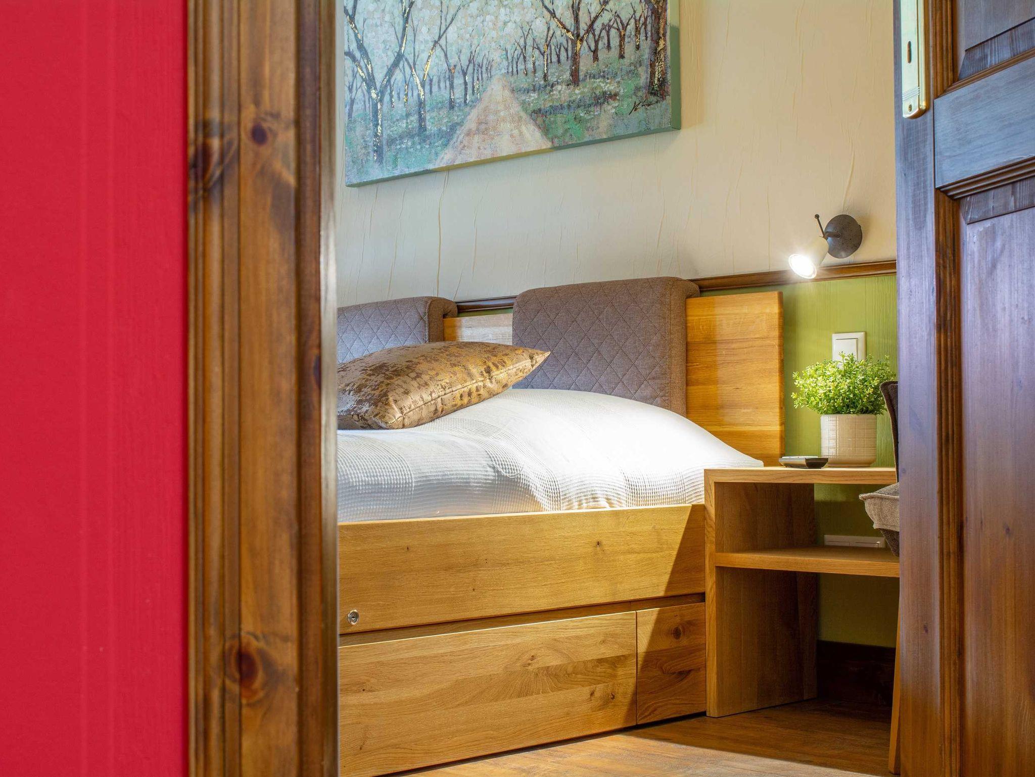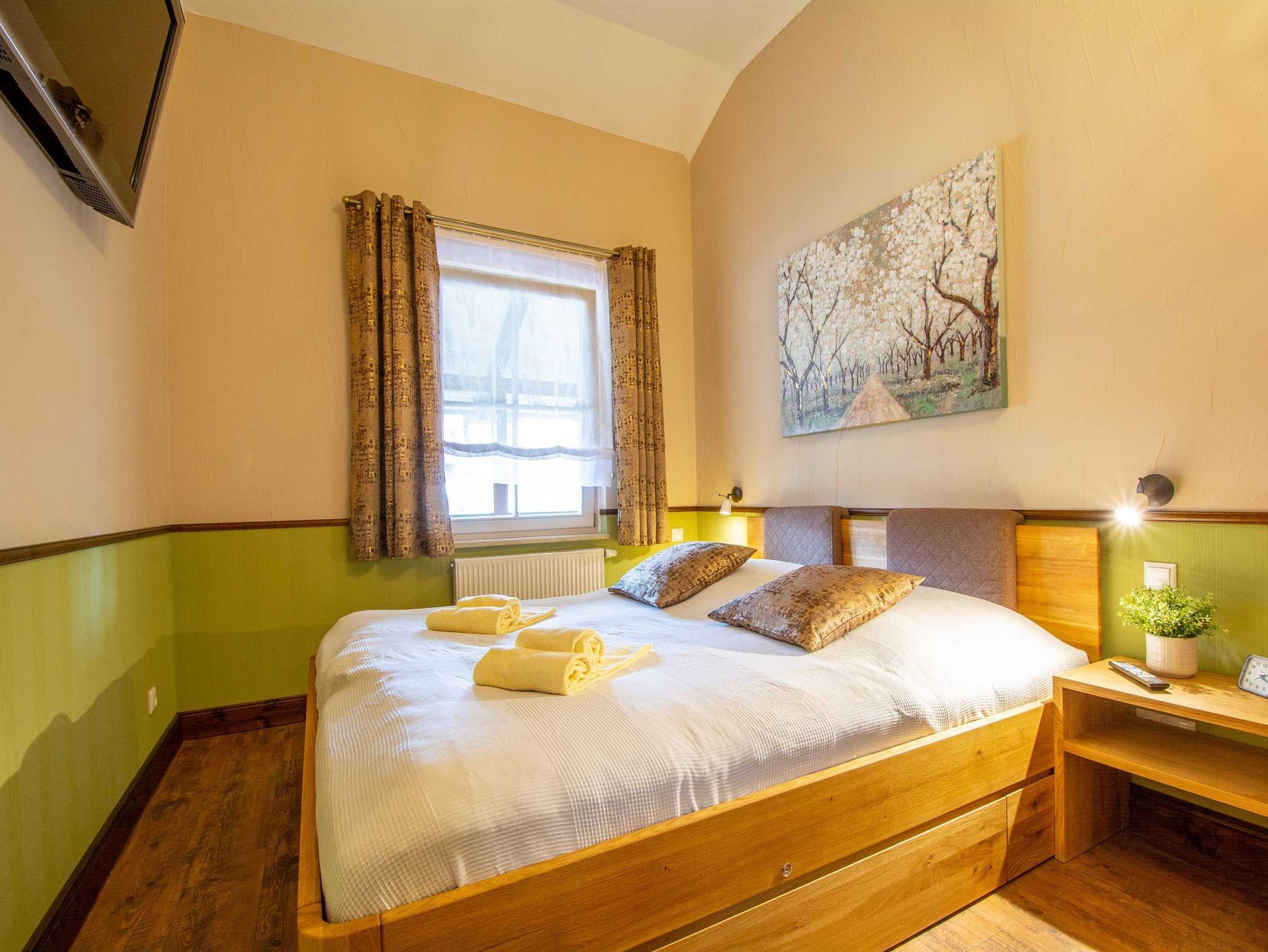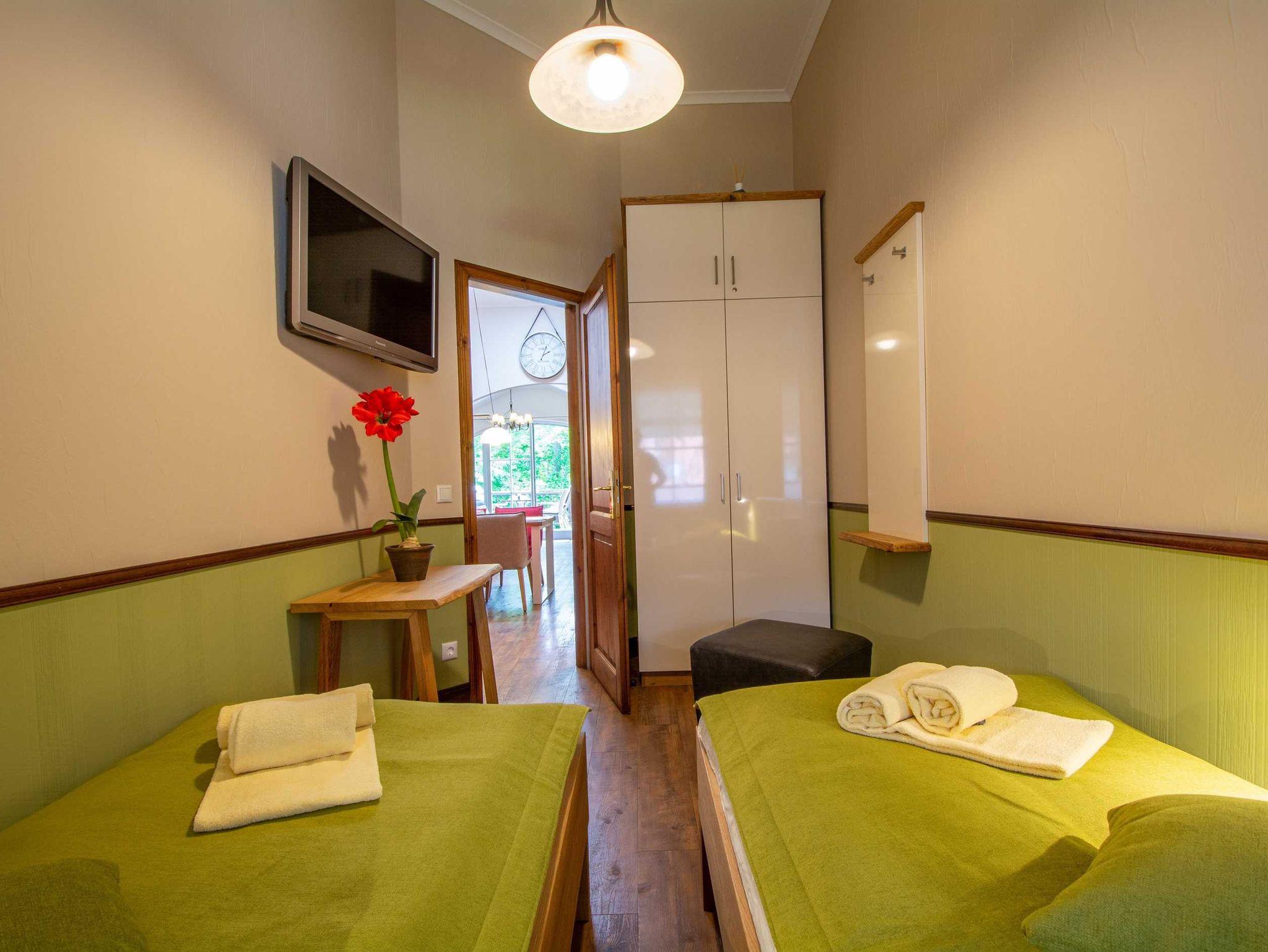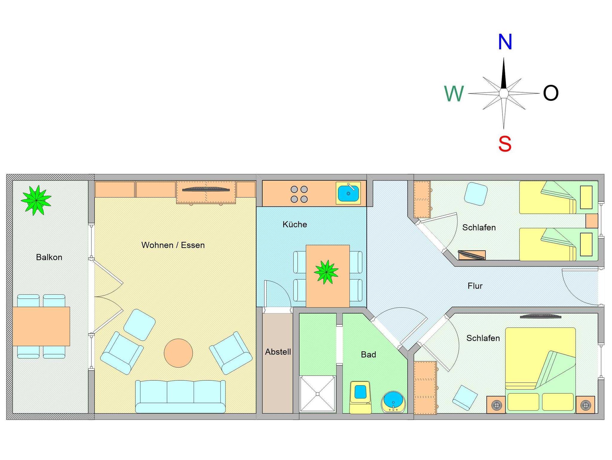 Der offene Wohnraum ist außerdem ausgestattet mit einer Küchenzeile mit Geschirrspüler, Herd, Mikrowelle, Kaffeemaschine etc. sowie einem Essbereich. Ein Schlafraum mit Doppelbett, großem Flachbild-TV und Kleiderschrank und ein Schlafraum mit 2 Einzelbetten (ebenfalls ausgestattet mit Flachbild-TV und Kleiderschrank) sowie das Tageslichtbad mit Dusche und WC vervollständigen das Gesamtbild dieser Wohnung.