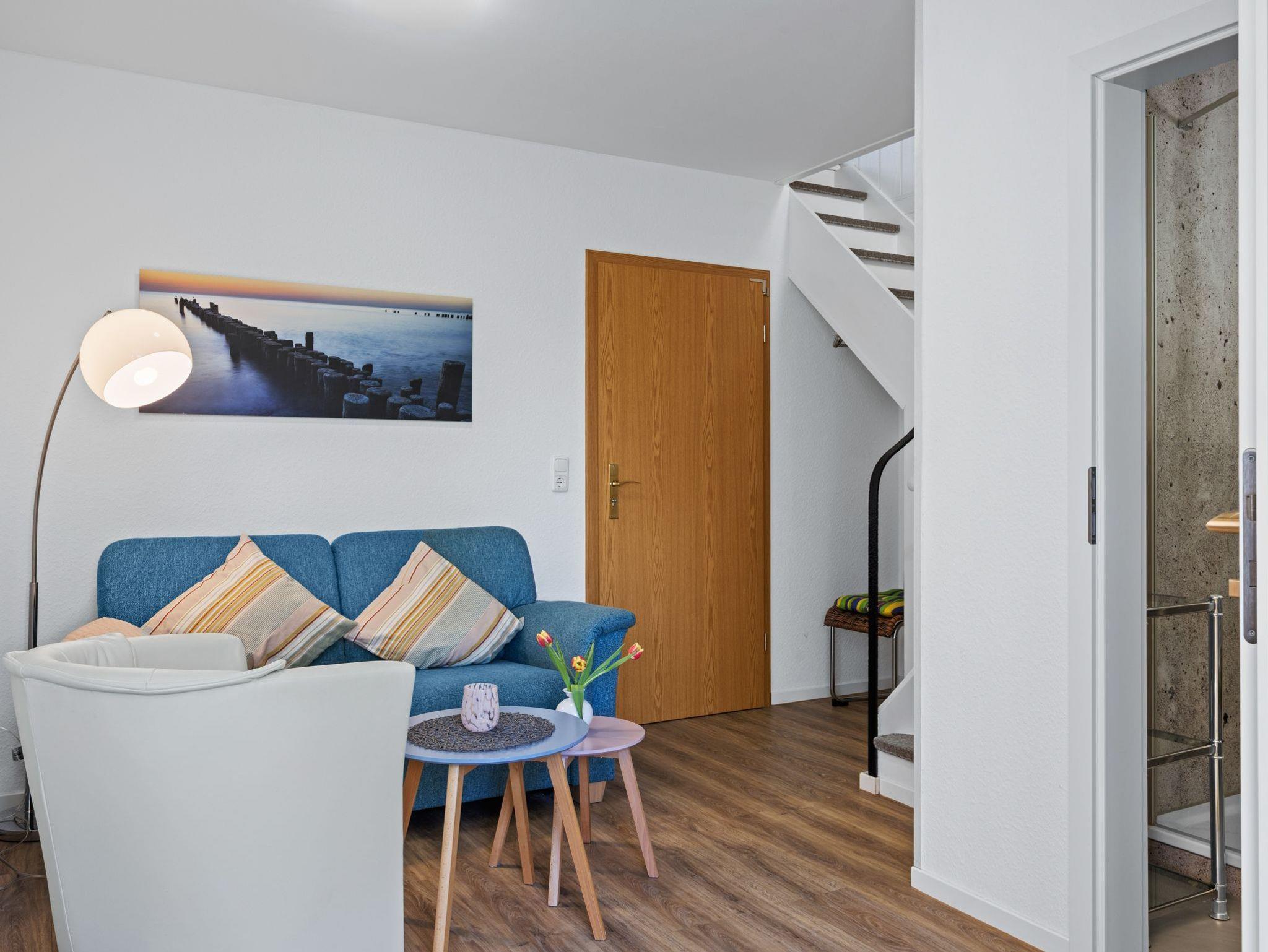 Helle und freundliche 2- Zimmer Ferienwohnung über 2 Etagen. Wohnzimmer mit Couchecke, TV und Esstisch. Separate Küche mit 2- Platten Induktionsherd, Kühlschrank, Kaffeemaschine, Wasserkocher und Toaster. Bad mit Dusche und WC. Eine Treppe führt in das Schlafzimmer im OG (geschlossener Raum) mit Doppelbett (1,80 x 2m) und Aufbettung als Zustellbett, Kleiderschrank. Aus dem Dachfenster des Schlafzimmers lässt sich ein herrlicher Ostseeblick genießen. Zu der Wohnung gehört eine Sitzecke im grünen Garten mit Grillmöglichkeit.