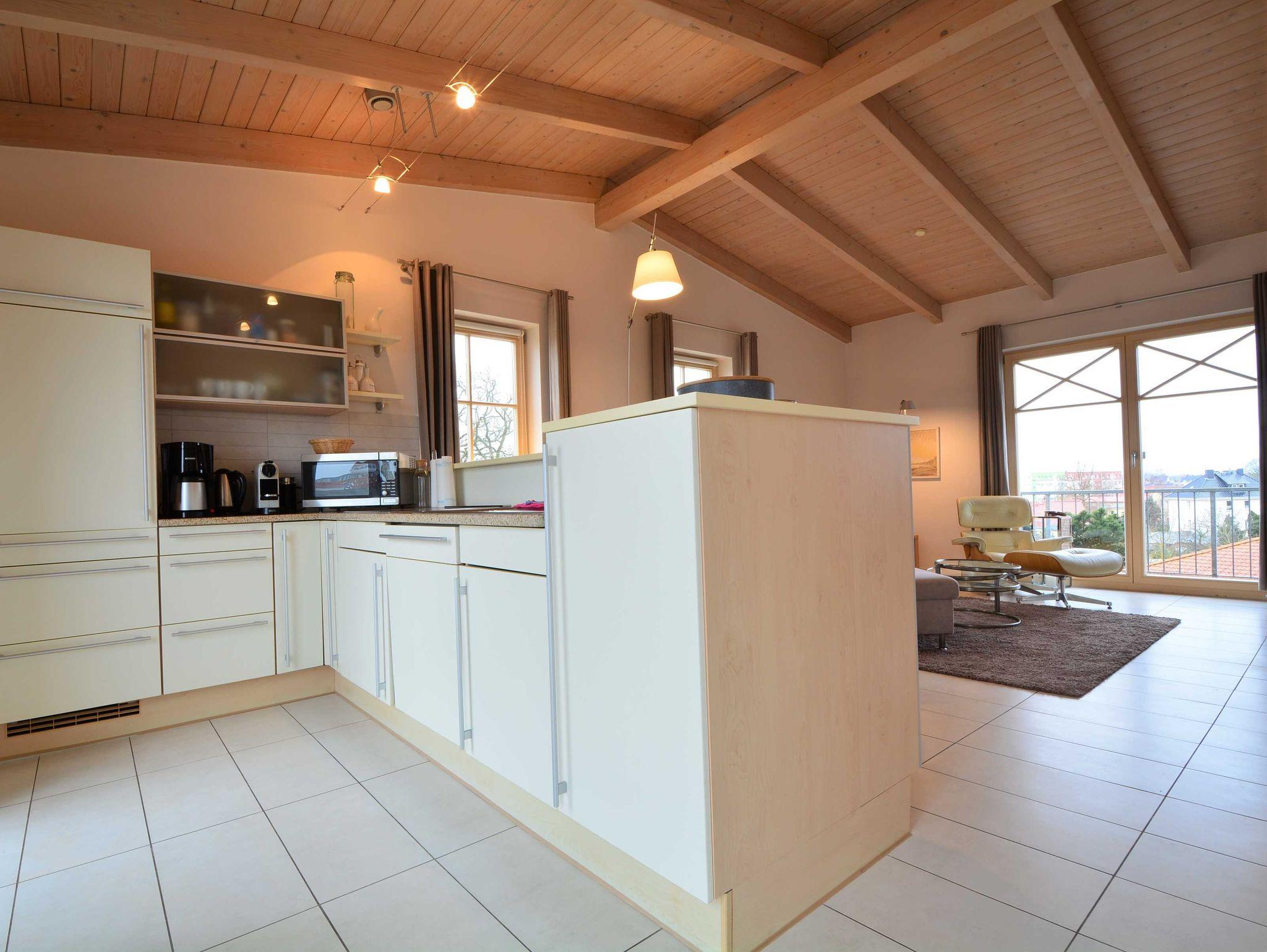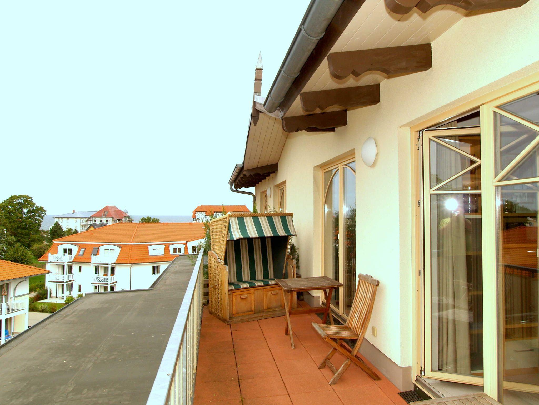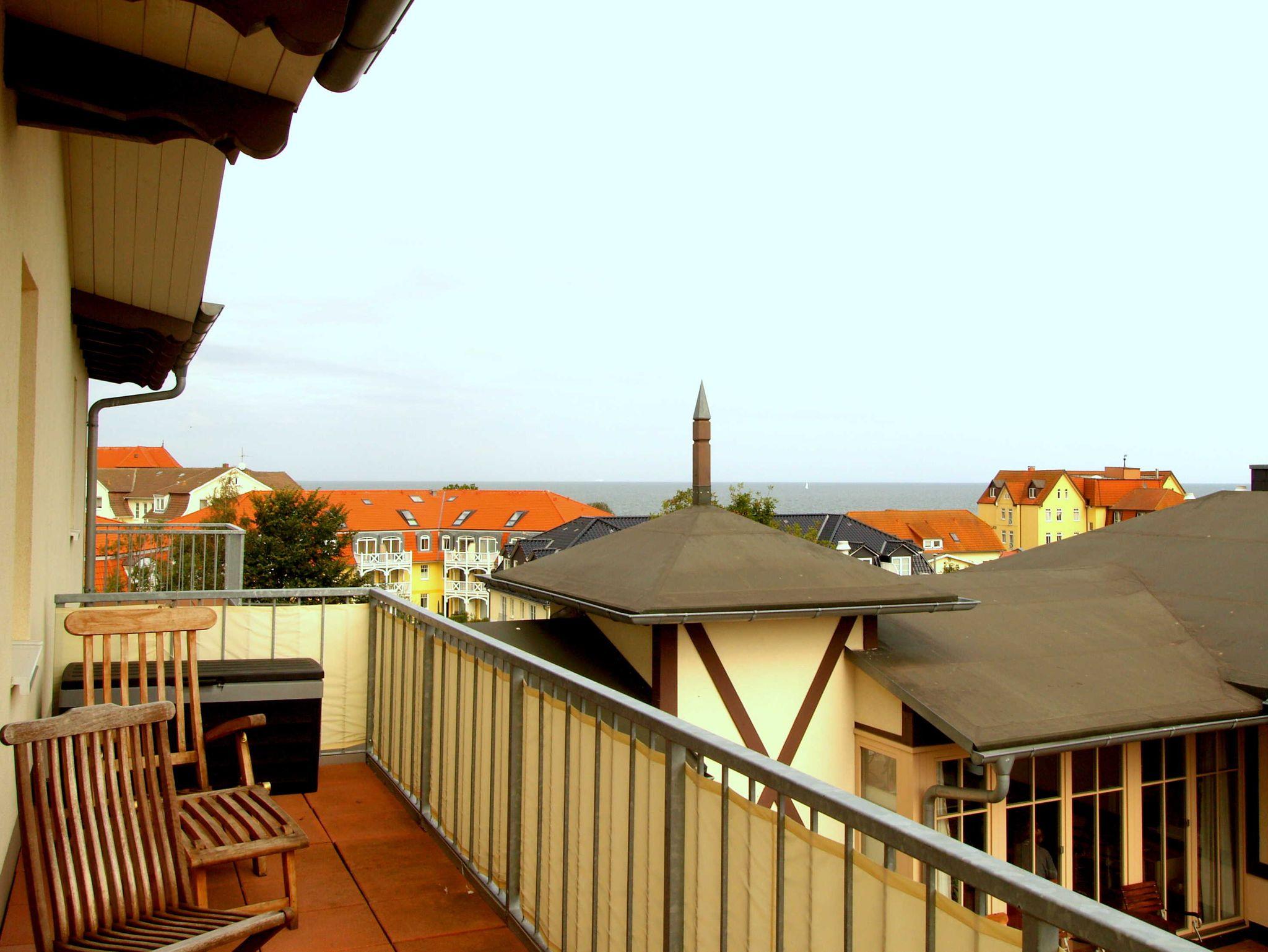 Hier kann Ihr Urlaub beginnen! Herzlich willkommen in der wunderschönen hellen lichtdurchfluteten Penthouse-Ferienwohnung in der Residenz Seestern! Das etwa 62qm große Appartement ist für 2 Personen geeignet und besticht durch den hellen freundlichen Wohnbereich im Dachgeschoss mit Panoramablick rund um die Stadt bis hin zur Ostsee. Vom gemütlich gestalteten Wohnraum können Sie direkt die beiden großen Dachterrassen (West und Ost-Terrasse) betreten, die einen herrlichen Blick über die Stadt bis hin zur Ostsee bieten. Das Terrassenmobiliar lädt zum Verweilen, Relaxen und Sonnenbaden ein. Aber auch ein leckeres Dinner lässt sich von hier genießen. Der Wohnraum ist ausgestattet mit Schlafcouch, Essplatz, Flachbild-TV, Radio und einer offen gestalteten Küchenzeile, die mit alle wichtigen Küchengeräten ausgestattet ist (Herd, Mikrowelle, Kaffeemaschine). Vom Wohnraum betreten Sie das Schlafzimmer, das mit einem Doppelbett und einem großen Kleiderschrank ausgestattet ist sowie einen Zugang zur West-Terrasse bietet. Das geflieste Bad ist ausgestattet mit Dusche, WC und Handtuchwärmer.