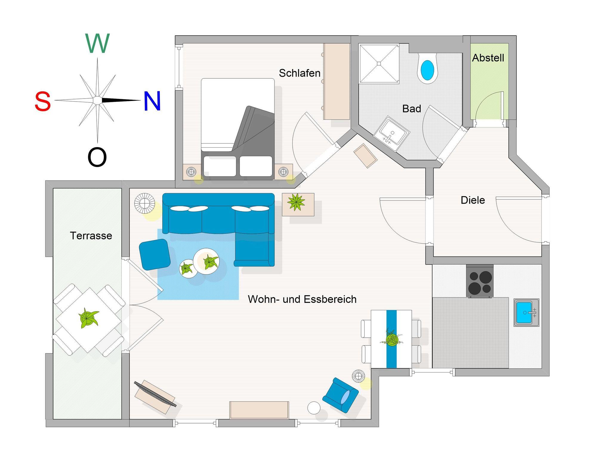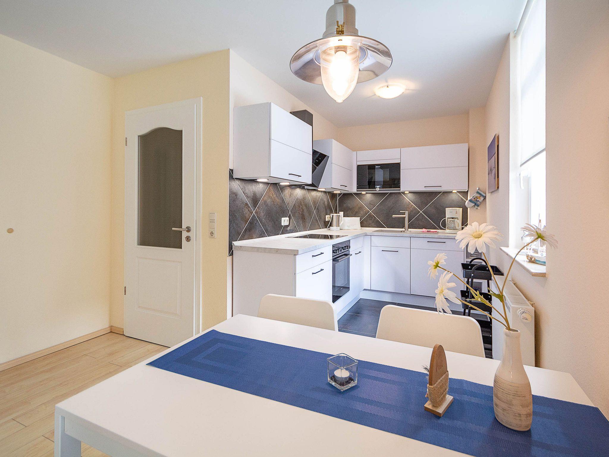 Die liebevoll eingerichtete 2-Raum-Ferienwohnung von ca. 56 qm Größe befindet sich im Erdgeschoss der Villa Strandbrise. Das helle lichtdurchflutete Wohnzimmer ist ausgestattet mit einer gemütlichen Schlafcouch, Stereoanlage und Flachbild-TV sowie einem Essbereich und einer voll ausgestatteten Küchenzeile (Herd mit Backofen, Geschirrspüler, Mikrowelle, Kaffeemaschine, Wasserkocher, Toaster). Vom Wohnraum aus betreten Sie die Terrasse in Richtung Süden, die zum Entspannen einlädt. Ein Schlafzimmer mit Doppelbett sowie das Bad mit Dusche und WC vervollständigen das Gesamtbild dieser Wohnung.