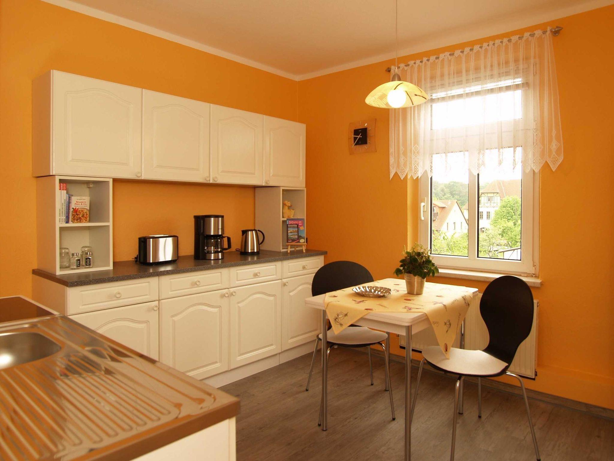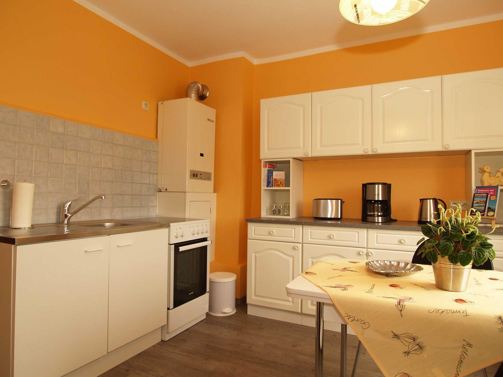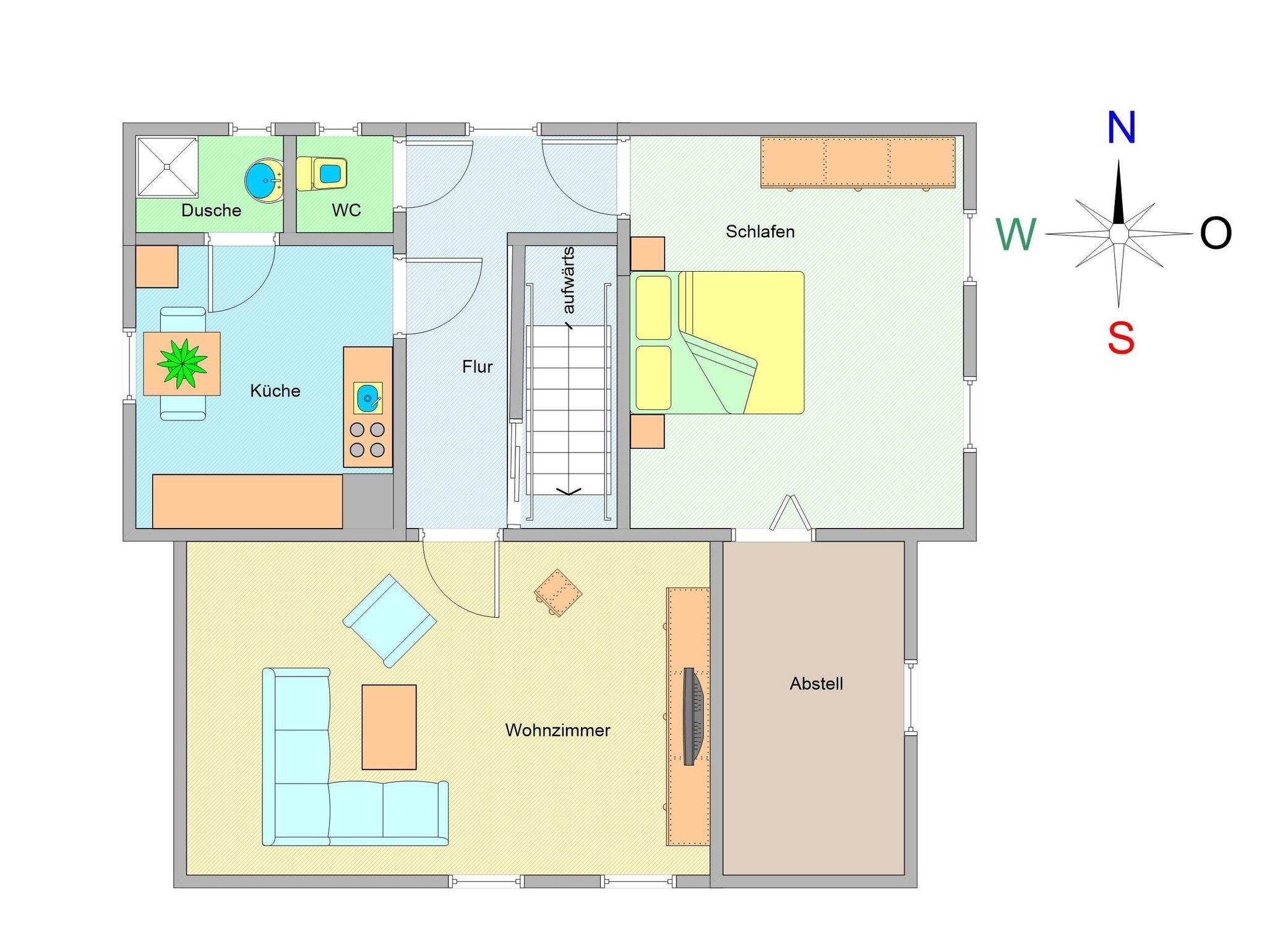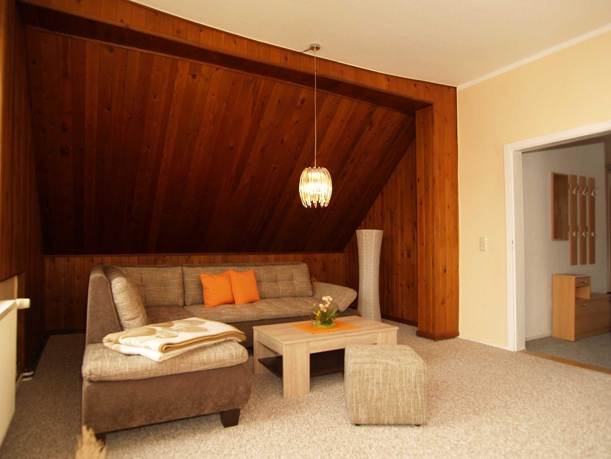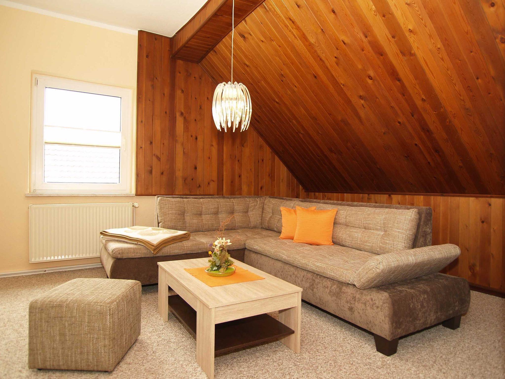 Sie wohnen in einer ca. 65 m² großen 2-Raum-Wohnung, die sich im gesamten zweiten Ober- bzw. Dachgeschoss befindet. Der Wohnraum ist ausgestattet mit Couch-Sitzecke und Sideboard mit Flat-TV. In der Küche befinden ein Esstisch, der 4-Platten-Ceranherd mit Backofen, der Kühlschrank mit Gefrierfach sowie die sonstigen Ausstattungen wie z.B. Toaster, Kaffeemaschine und Wasserkoche. Von der Küche aus betreten Sie die separate Dusche. Vom Flur aus, gelangen Sie zum separaten WC. Ebenfalls gelangen Sie vom Flur in das geräumige Schlafzimmer, von dem aus ein zweiter kleiner Schlafraum mit einem Einzelbett erreichbar ist.