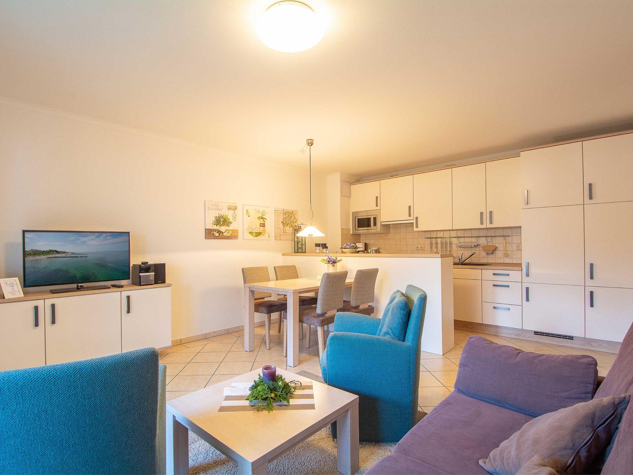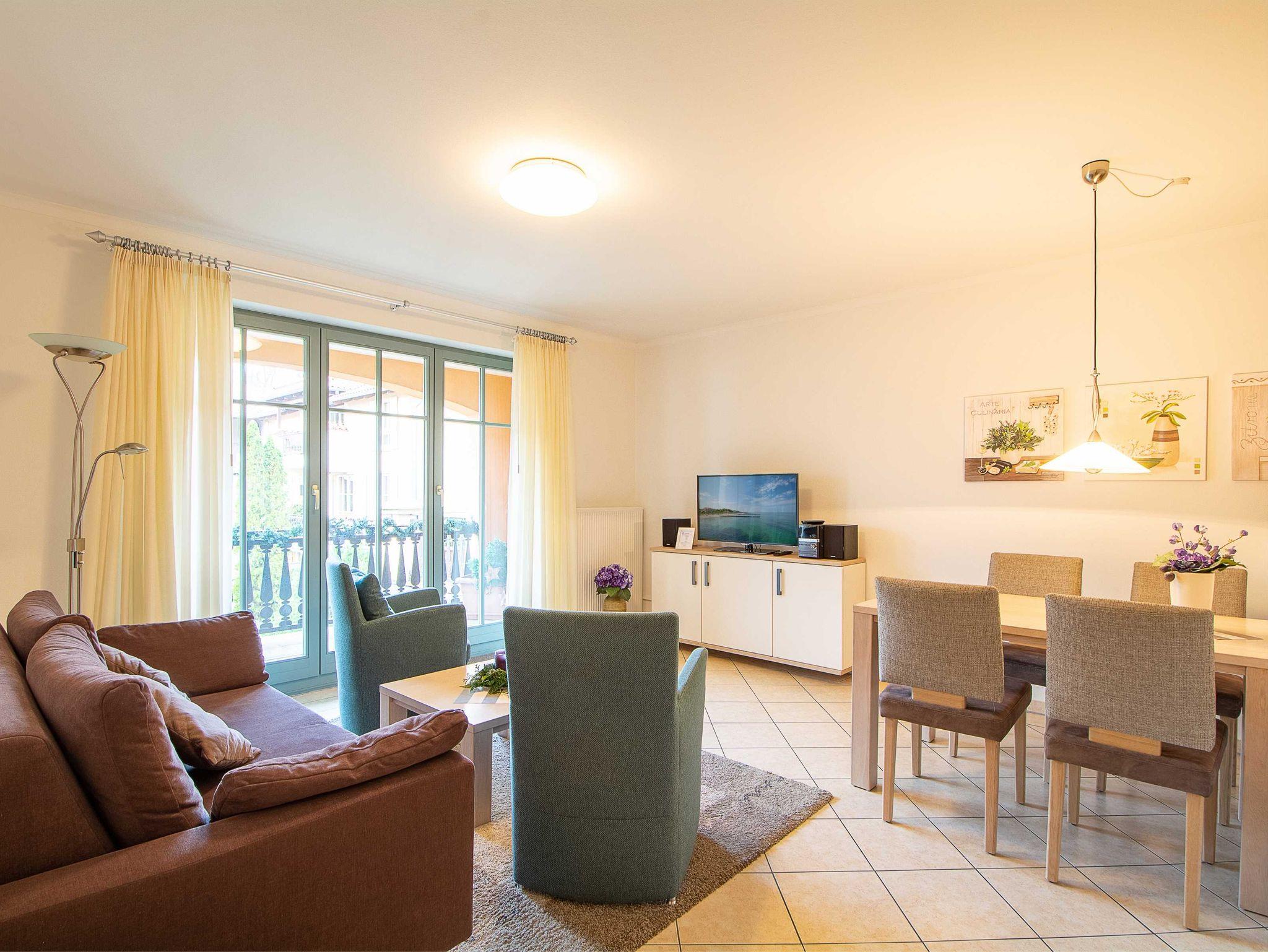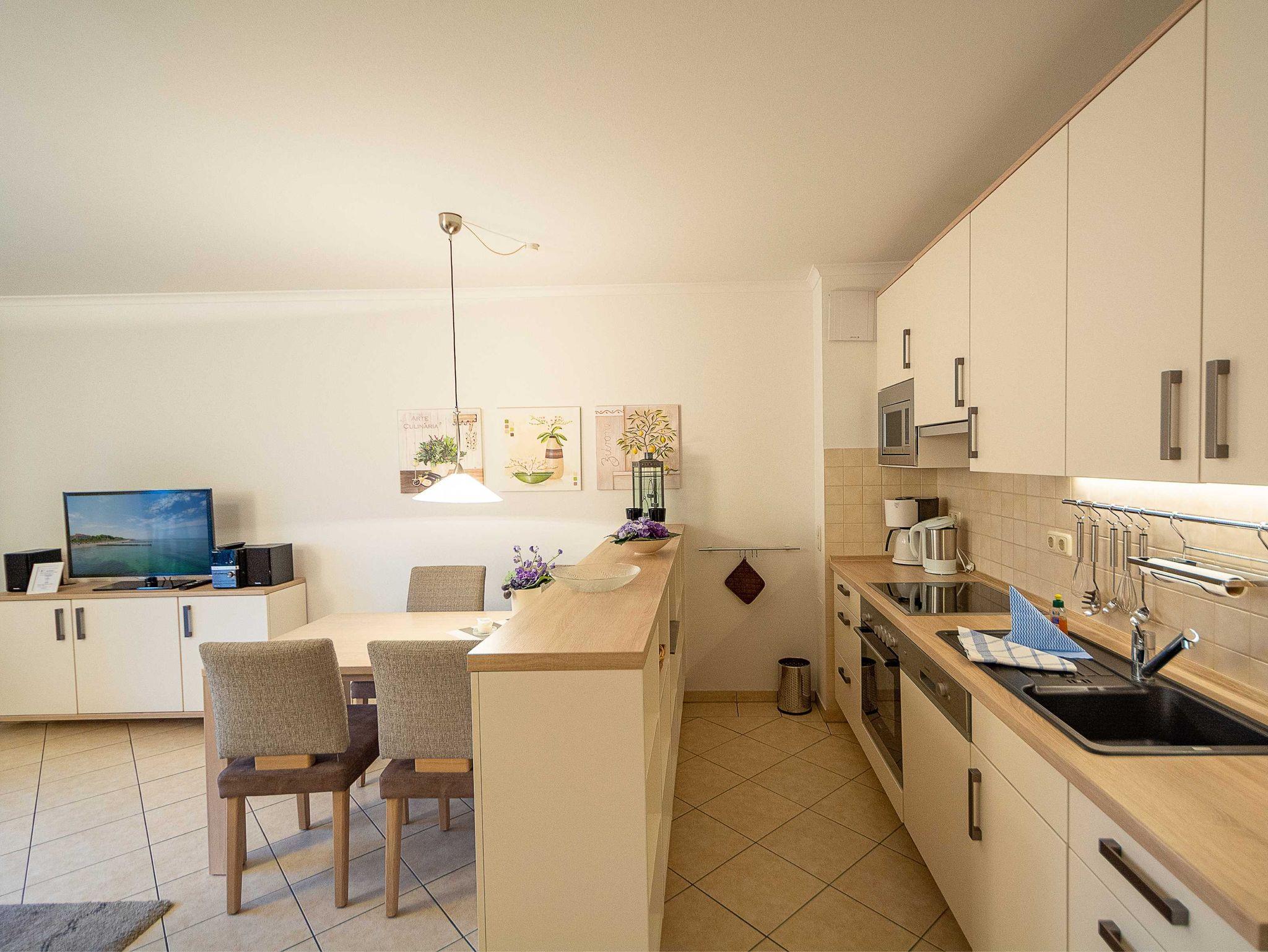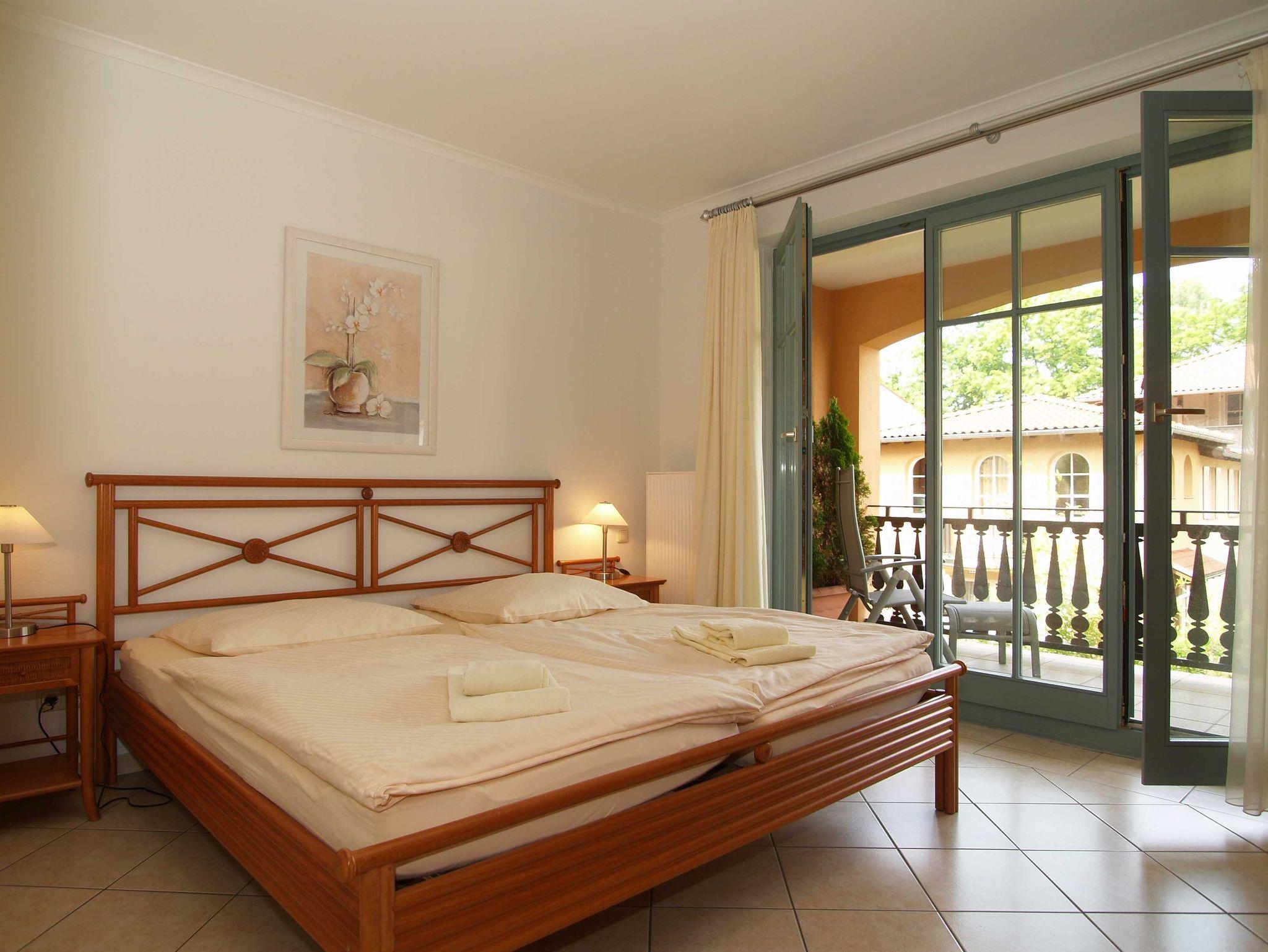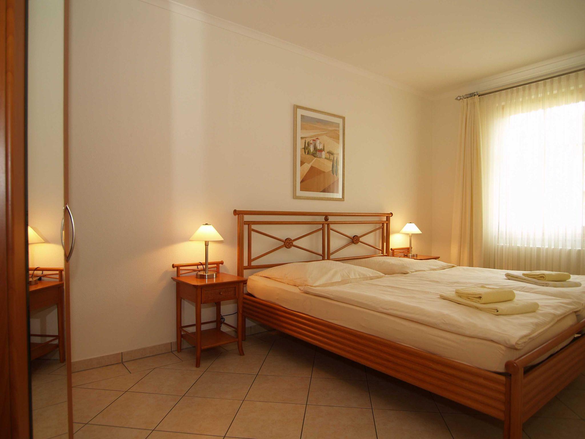 Herzlich willkommen in der Residenz Laguna! Sie wohnen in einer 76 m² großen 3-Raum-Wohnung, die sich im 1. Obergeschoss befindet und für 2 bis 4 Personen geeignet ist. Der helle freundliche Wohnraum ist ausgestattet mit einer gemütlichen Schlafcouch, einem Esstisch für 4 Personen, Flat Sreen-TV und einer Stereoanlage. Das Herz der Wohnung ist der große möblierte West-Balkon mit direktem Blick auf den wunderschönen Innenhof und die mediterrane Teichlandschaft. Hier können Sie Sonnenbaden, Relaxen oder den Abend zu einem Glas Wein ausklingen lassen. Dem Essbereich schließt sich die moderne und offen gestaltete Küchenzeile an, die mit allen wichtigen Küchengeräten und -utensilien ausgestattet ist, die Sie für Ihr „perfektes Dinner“ benötigen (4-Platten-Cerankochfeld mit Backofen und Dunstabzug, Geschirrspüler, Mikrowelle, Kühlschrank, Kaffeemaschine, Wasserkocher, Toaster etc.). Die Wohnung ist durchgehend mit mediterranen Fliesen versehen. Die beiden Schlafzimmer sind jeweils ausgestattet mit einem Doppelbett, einem geräumigen Kleiderschrank für Ihre Urlaubsgarderobe. Ein Schlafzimmer ist mit Blick in den Innenhof ausgerichtet - Sie können von hier ebenfalls den großen Balkon betreten. Das ebenfalls im mediterranen Stil geflieste Tageslichtbad ist mit einer Dusche und WC ausgestattet und sorgt dank eines Badheizkörpers für immer kuschlig warme Handtücher.