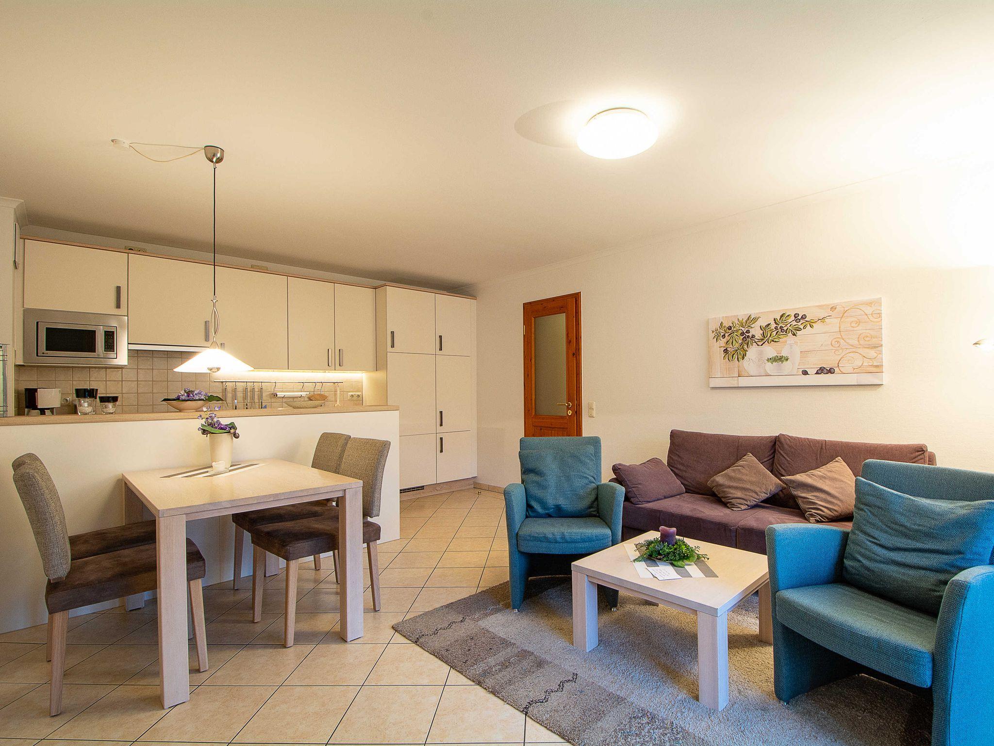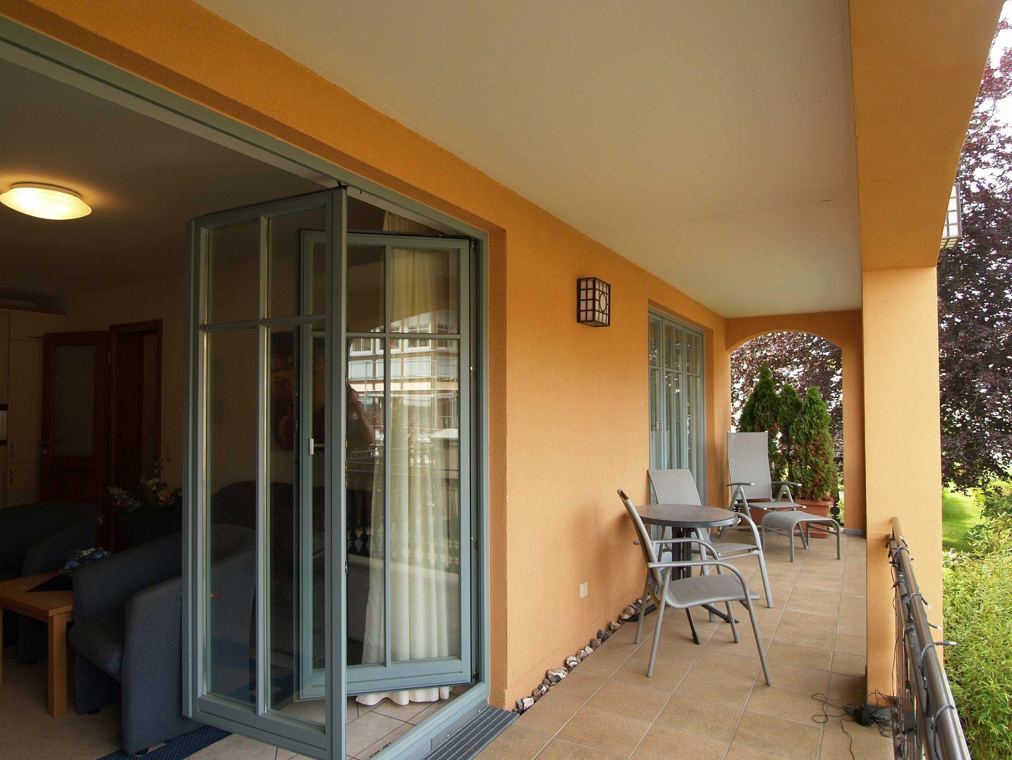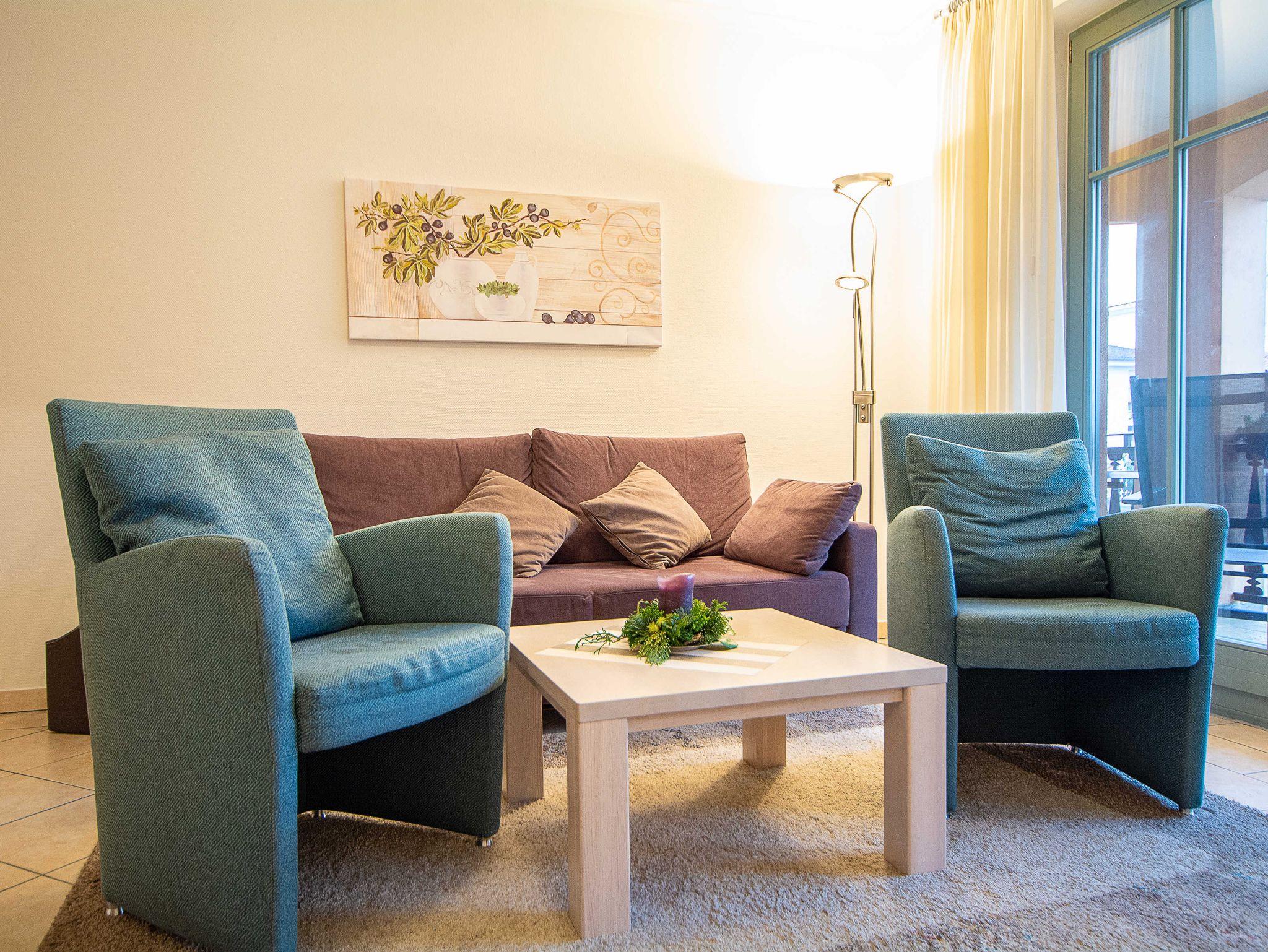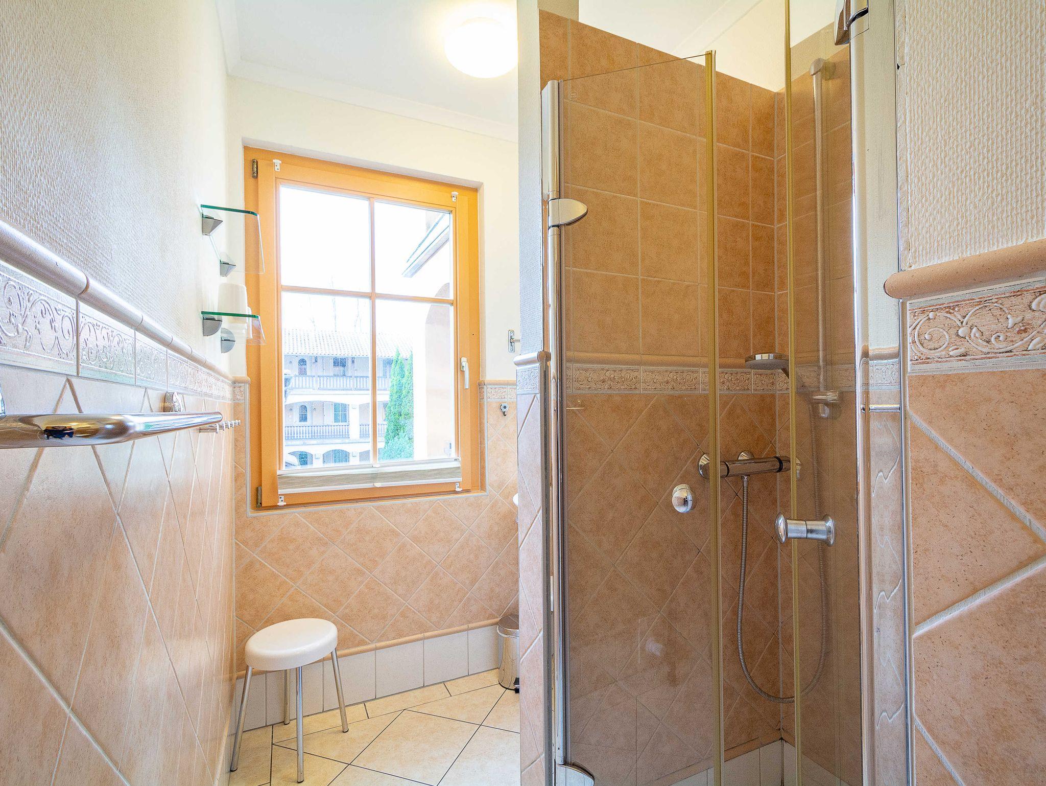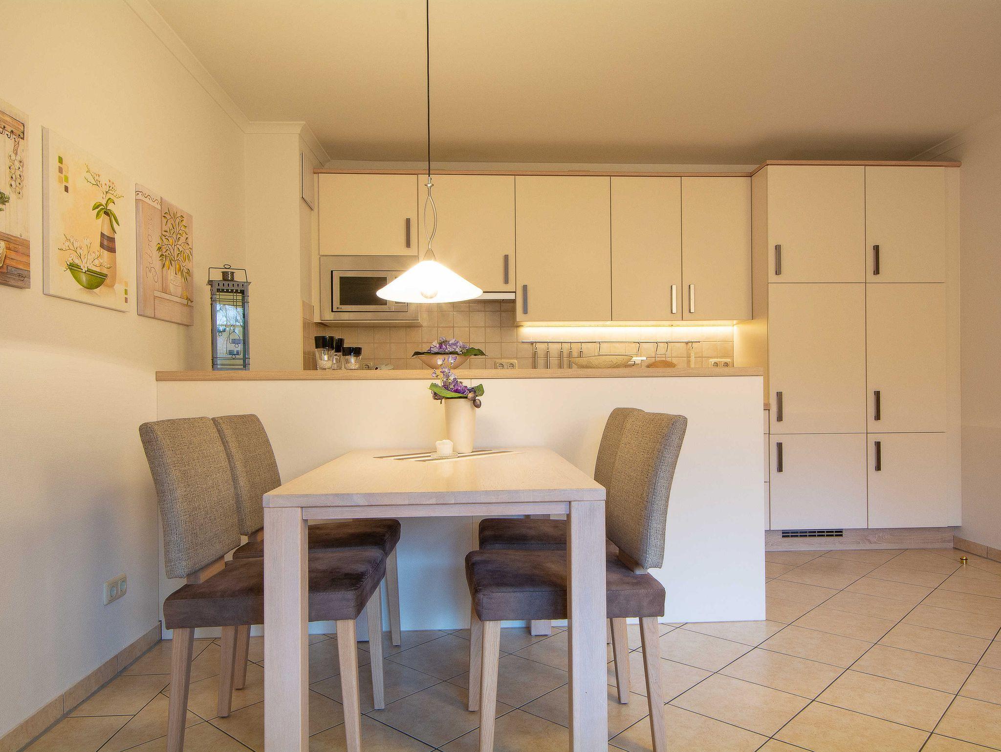 Herzlich willkommen in der Residenz Laguna! Sie wohnen in einer 76 m² großen 3-Raum-Wohnung, die sich im 1. Obergeschoss befindet und für 2 bis 4 Personen geeignet ist. Der helle freundliche Wohnraum ist ausgestattet mit einer gemütlichen Schlafcouch, einem Esstisch für 4 Personen, Flat Sreen-TV und einer Stereoanlage. Das Herz der Wohnung ist der große möblierte West-Balkon mit direktem Blick auf den wunderschönen Innenhof und die mediterrane Teichlandschaft. Hier können Sie Sonnenbaden, Relaxen oder den Abend zu einem Glas Wein ausklingen lassen. Dem Essbereich schließt sich die moderne und offen gestaltete Küchenzeile an, die mit allen wichtigen Küchengeräten und -utensilien ausgestattet ist, die Sie für Ihr „perfektes Dinner“ benötigen (4-Platten-Cerankochfeld mit Backofen und Dunstabzug, Geschirrspüler, Mikrowelle, Kühlschrank, Kaffeemaschine, Wasserkocher, Toaster etc.). Die Wohnung ist durchgehend mit mediterranen Fliesen versehen. Die beiden Schlafzimmer sind jeweils ausgestattet mit einem Doppelbett, einem geräumigen Kleiderschrank für Ihre Urlaubsgarderobe. Ein Schlafzimmer ist mit Blick in den Innenhof ausgerichtet - Sie können von hier ebenfalls den großen Balkon betreten. Das ebenfalls im mediterranen Stil geflieste Tageslichtbad ist mit einer Dusche und WC ausgestattet und sorgt dank eines Badheizkörpers für immer kuschlig warme Handtücher.